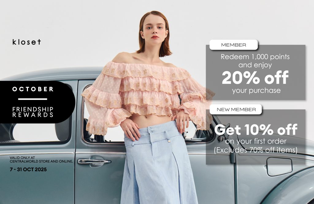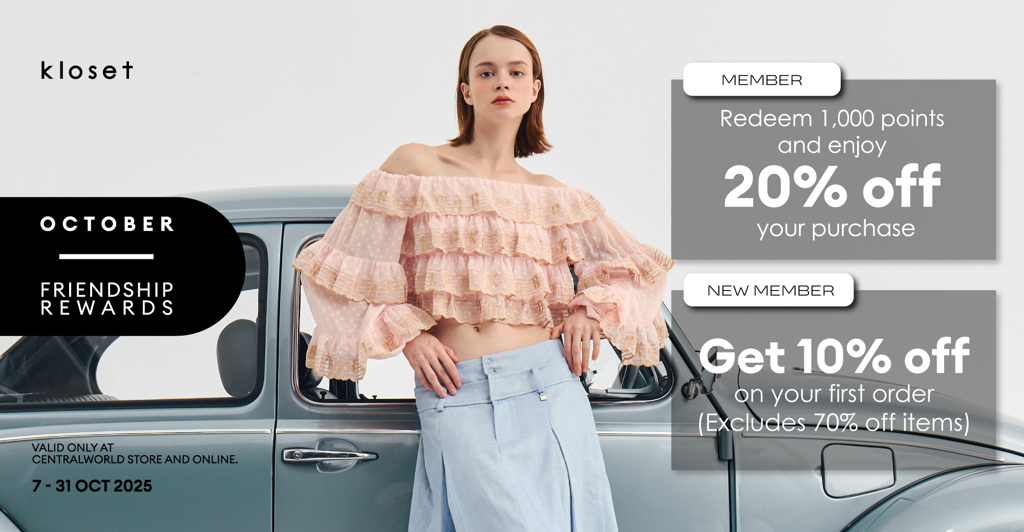 OCT Friendship rewards Members: Redeem 1,000 points and enjoy 20% off your purchase.New Customers: Get 10% off on your first order (Excludes 70% off items). Valid only at CentralWorld store and online. สมาชิก: แลก 1,000 คะแนน เพื่อรับส่วนลด 20% สำหรับการซื้อสินค้าลูกค้าใหม่: รับส่วนลด 10% สำหรับการสั่งซื้อครั้งแรก(ยกเว้นสินค้าลดราคา 70%) ใช้ได้เฉพาะที่ร้าน CentralWorld และ ช่องทางออนไลน์ระยะเวลา: 7–31 ตุลาคม 2025 7-31 Oct 2025
