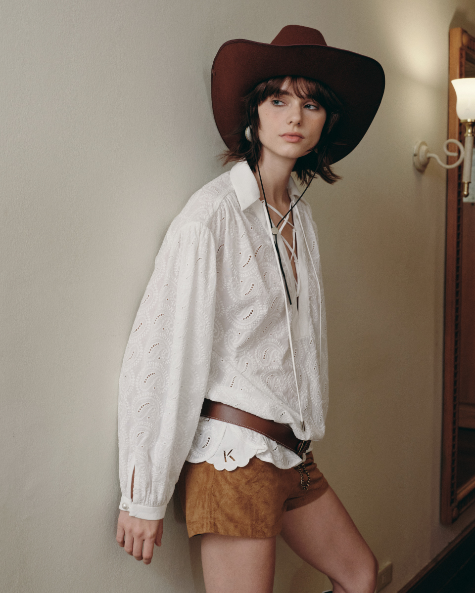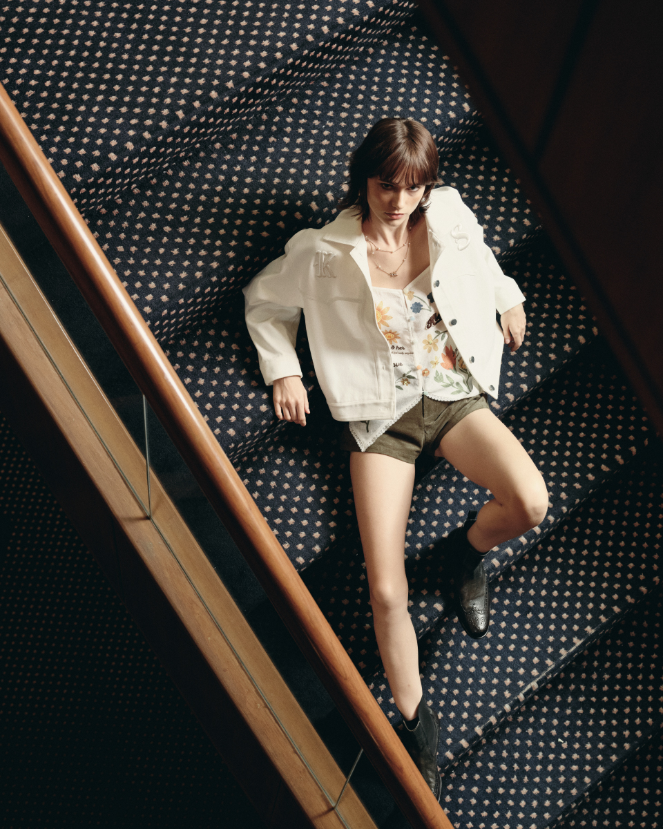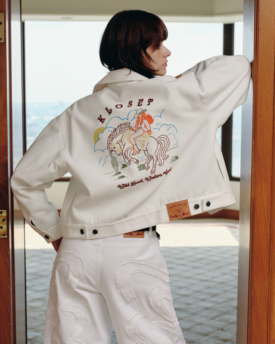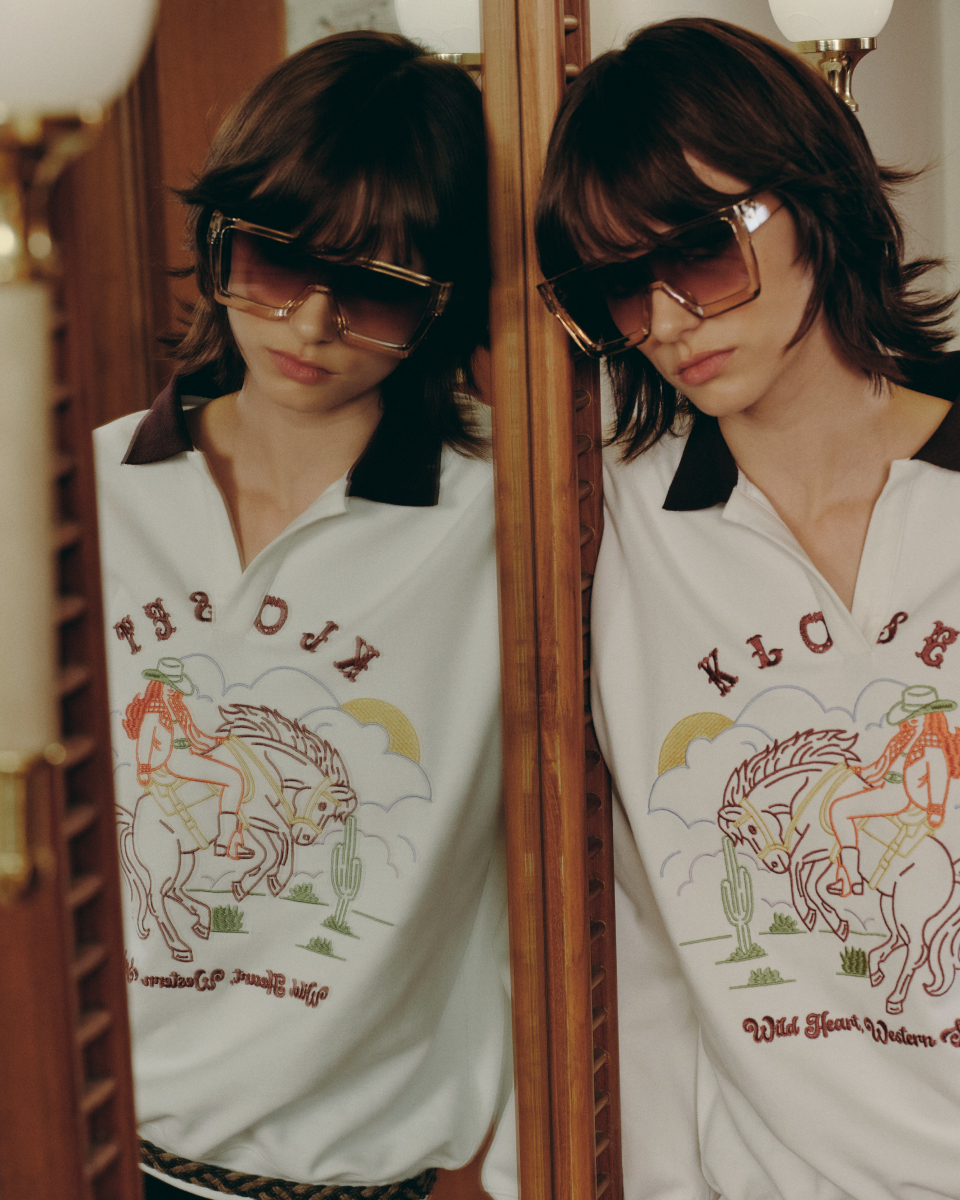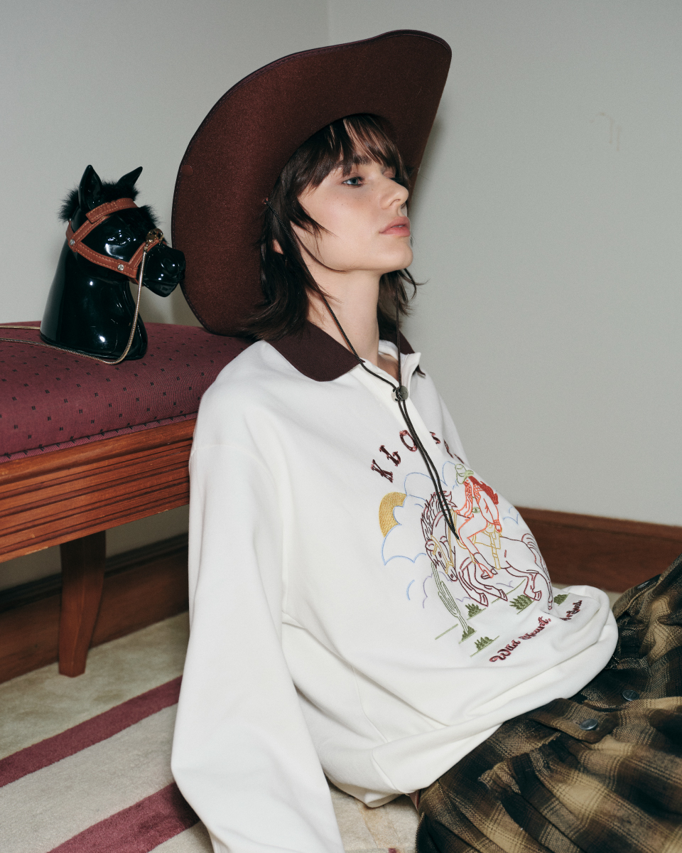 “The Fundamentals” revisits classic elements that feel renewed with every wear. Suede in earthy brown and olive tones sets the foundation, accompanied by cut-out embroidery of Kloset’s original butterfly logo. Denim pieces transform the iconic butterfly motif into patchwork details with raw edges, capturing a contemporary cowboy attitude. Intricate embroidery illustrating riders on horseback, traditional checks, and lace-up necklines further echo the nostalgic spirit of the 1970s—woven seamlessly into the collection’s narrative.