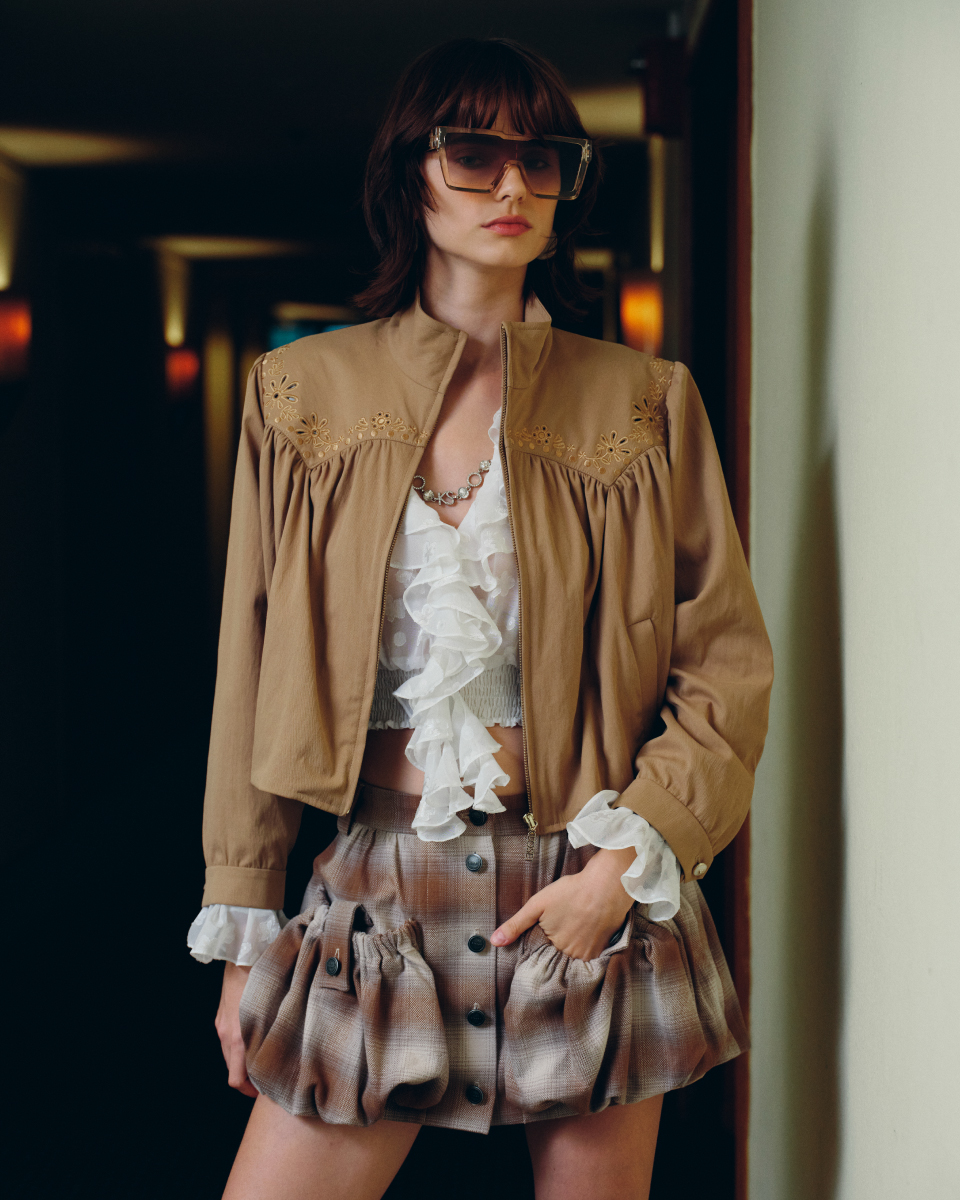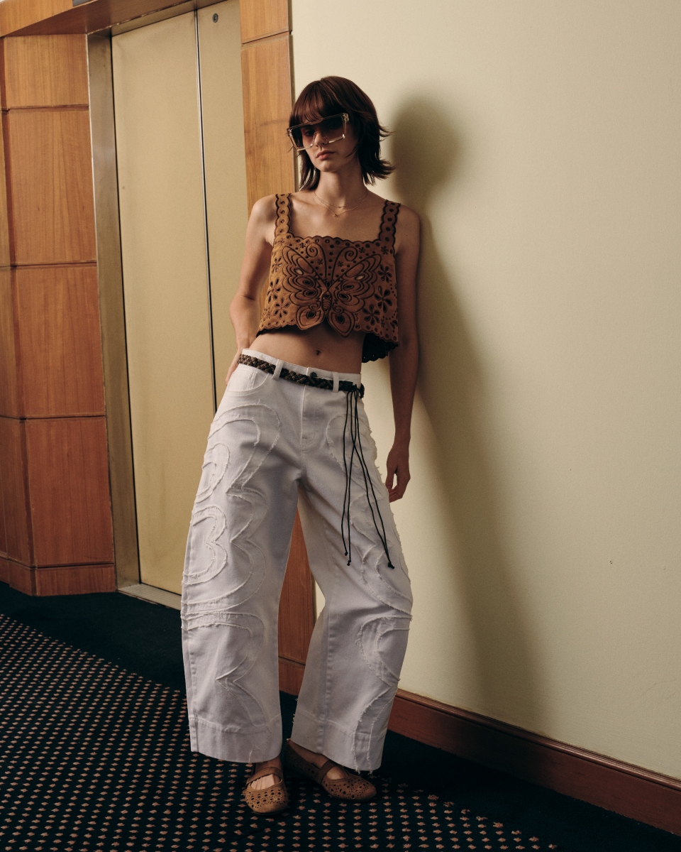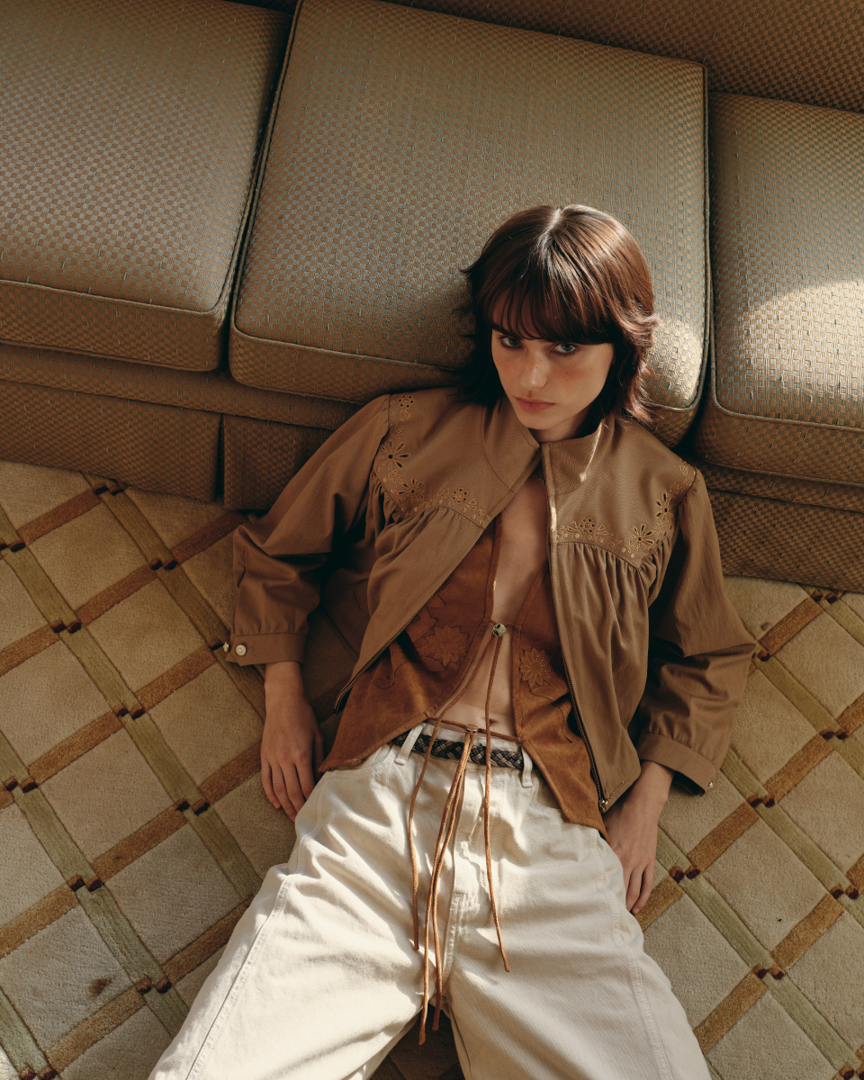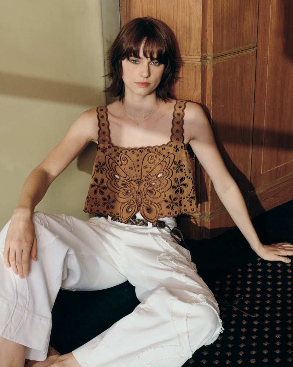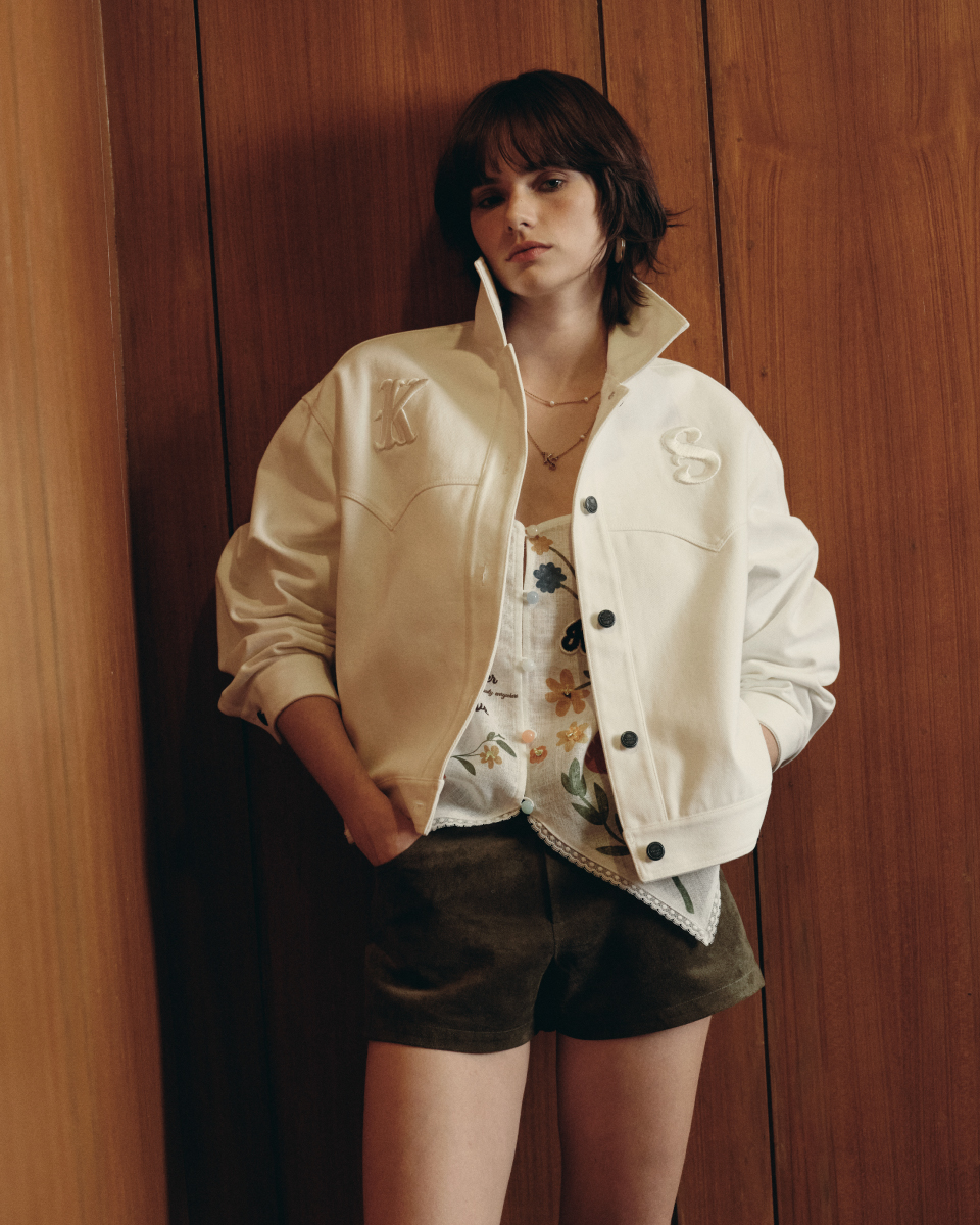 “The Fundamentals” revisits classic elements that feel renewed with every wear. Suede in earthy brown and olive tones sets the foundation, accompanied by cut-out embroidery of Kloset’s original butterfly logo. Denim pieces transform the iconic butterfly motif into patchwork details with raw edges, capturing a contemporary cowboy attitude. Intricate embroidery illustrating riders on horseback, traditional checks, and lace-up necklines further echo the nostalgic spirit of the 1970s—woven seamlessly into the collection’s narrative.