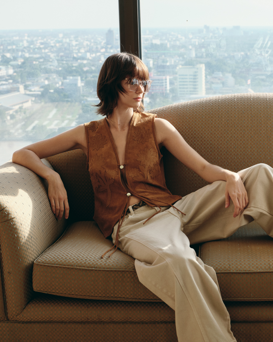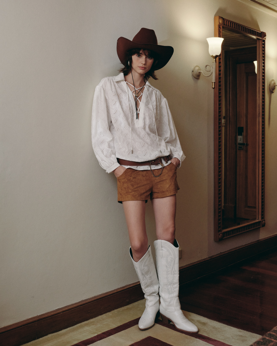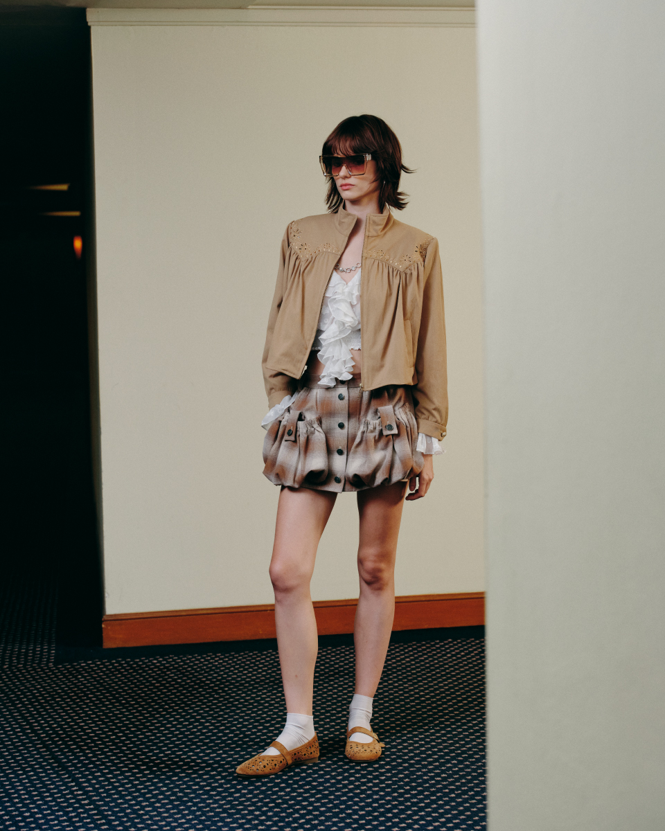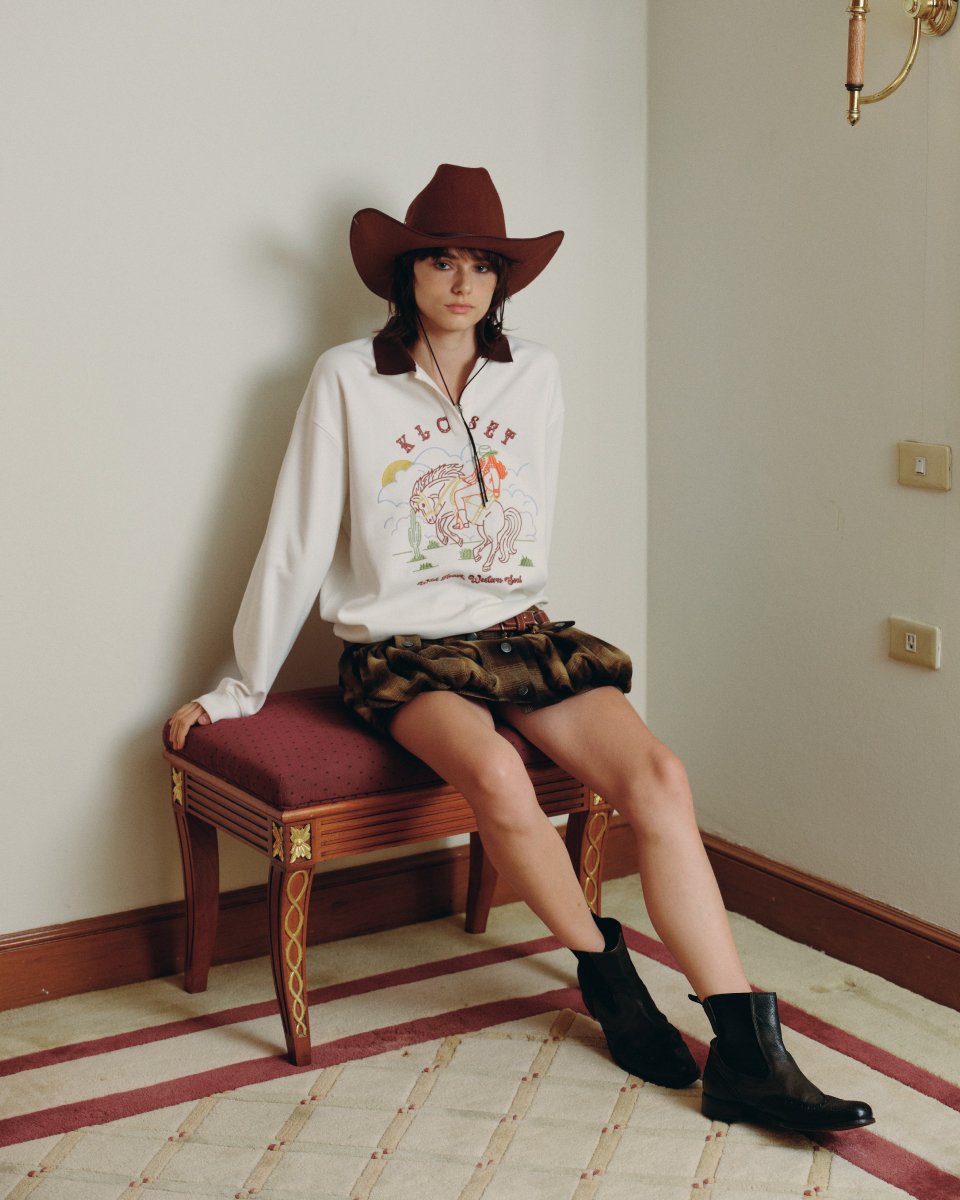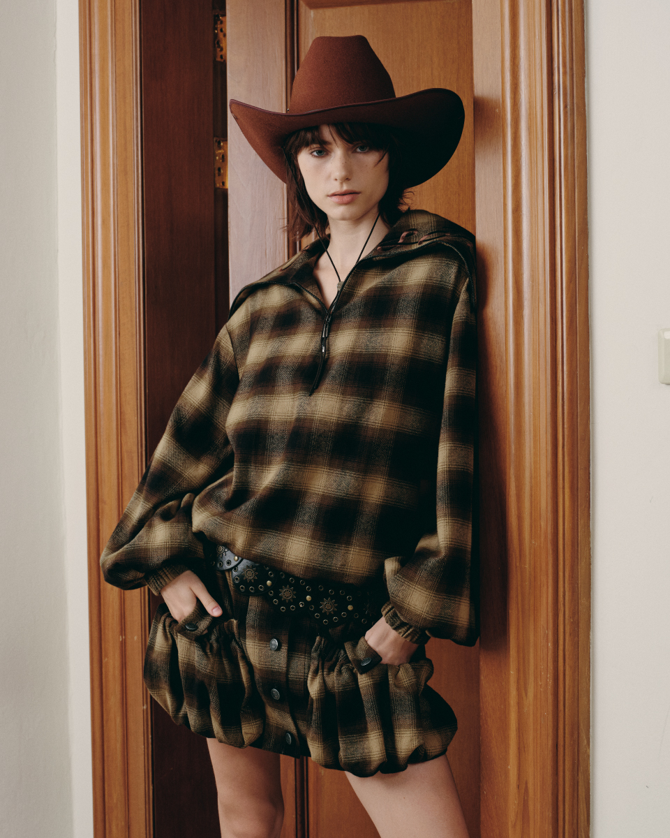 “The Fundamentals” revisits classic elements that feel renewed with every wear. Suede in earthy brown and olive tones sets the foundation, accompanied by cut-out embroidery of Kloset’s original butterfly logo. Denim pieces transform the iconic butterfly motif into patchwork details with raw edges, capturing a contemporary cowboy attitude. Intricate embroidery illustrating riders on horseback, traditional checks, and lace-up necklines further echo the nostalgic spirit of the 1970s—woven seamlessly into the collection’s narrative.