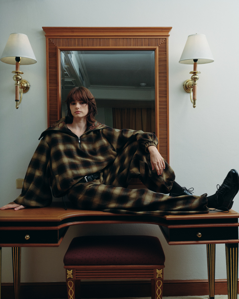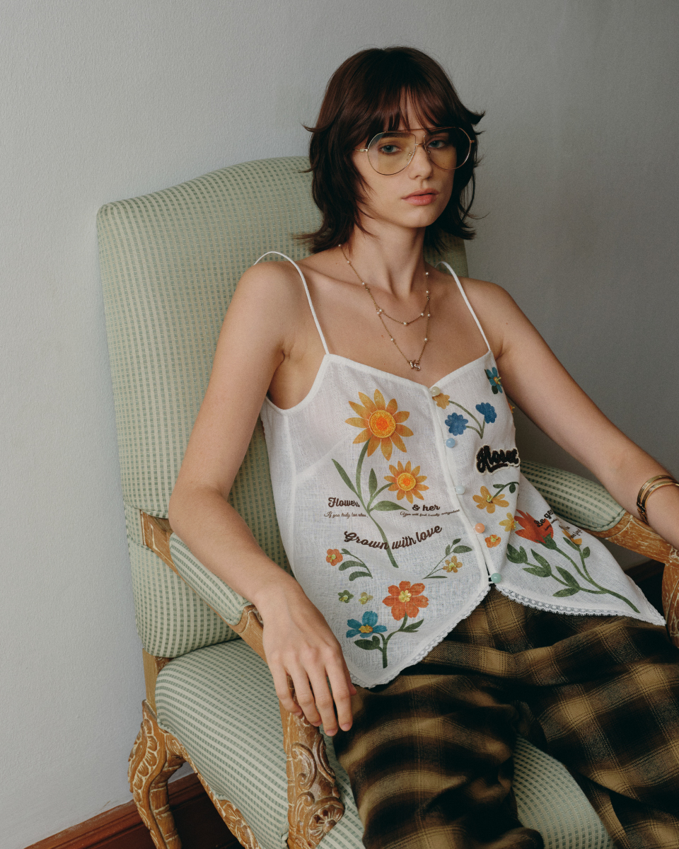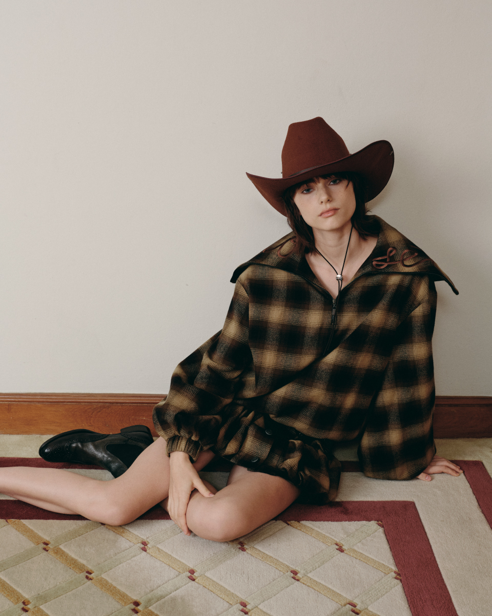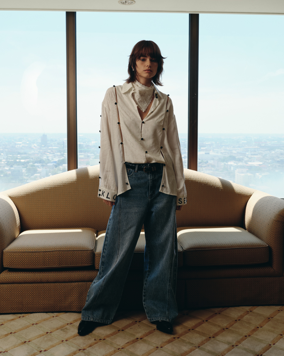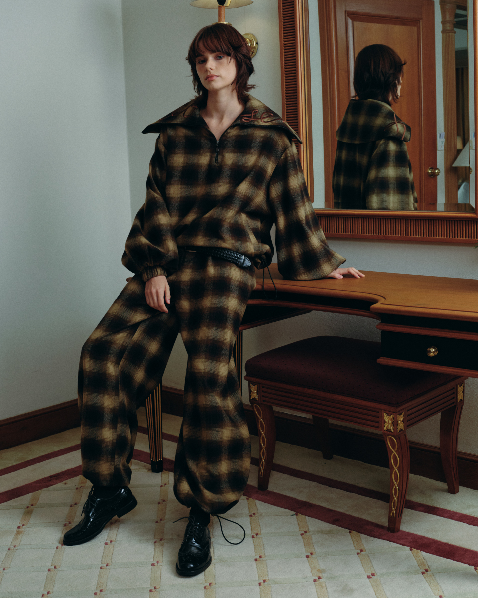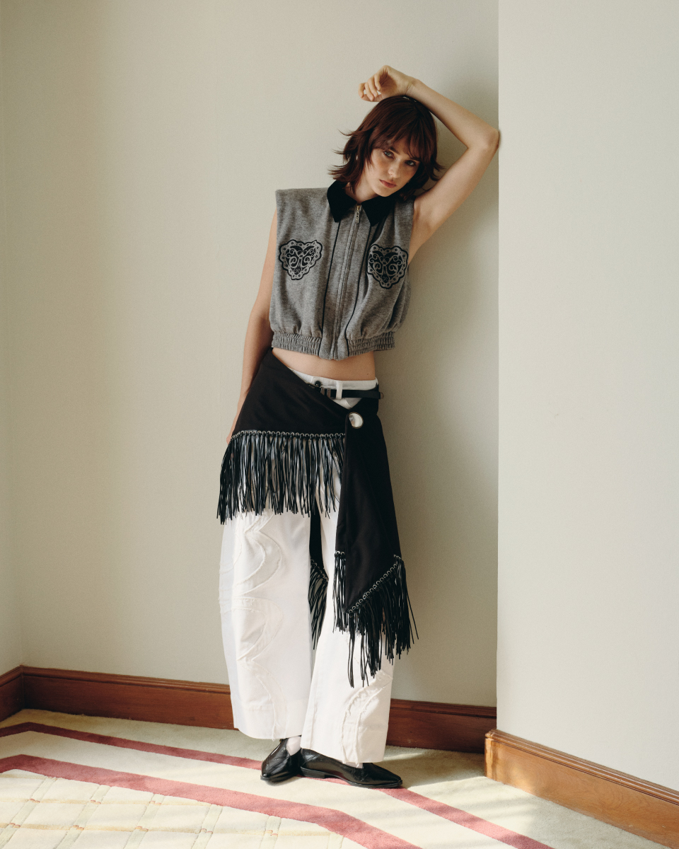“The Fundamentals” revisits classic elements that feel renewed with every wear. Suede in earthy brown and olive tones sets the foundation, accompanied by cut-out embroidery of Kloset’s original butterfly logo. Denim pieces transform the iconic butterfly motif into patchwork details with raw edges, capturing a contemporary cowboy attitude. Intricate embroidery illustrating riders on horseback, traditional checks, and lace-up necklines further echo the nostalgic spirit of the 1970s—woven seamlessly into the collection’s narrative.