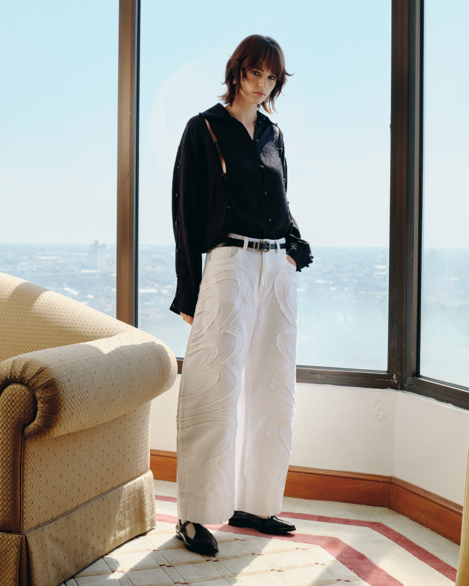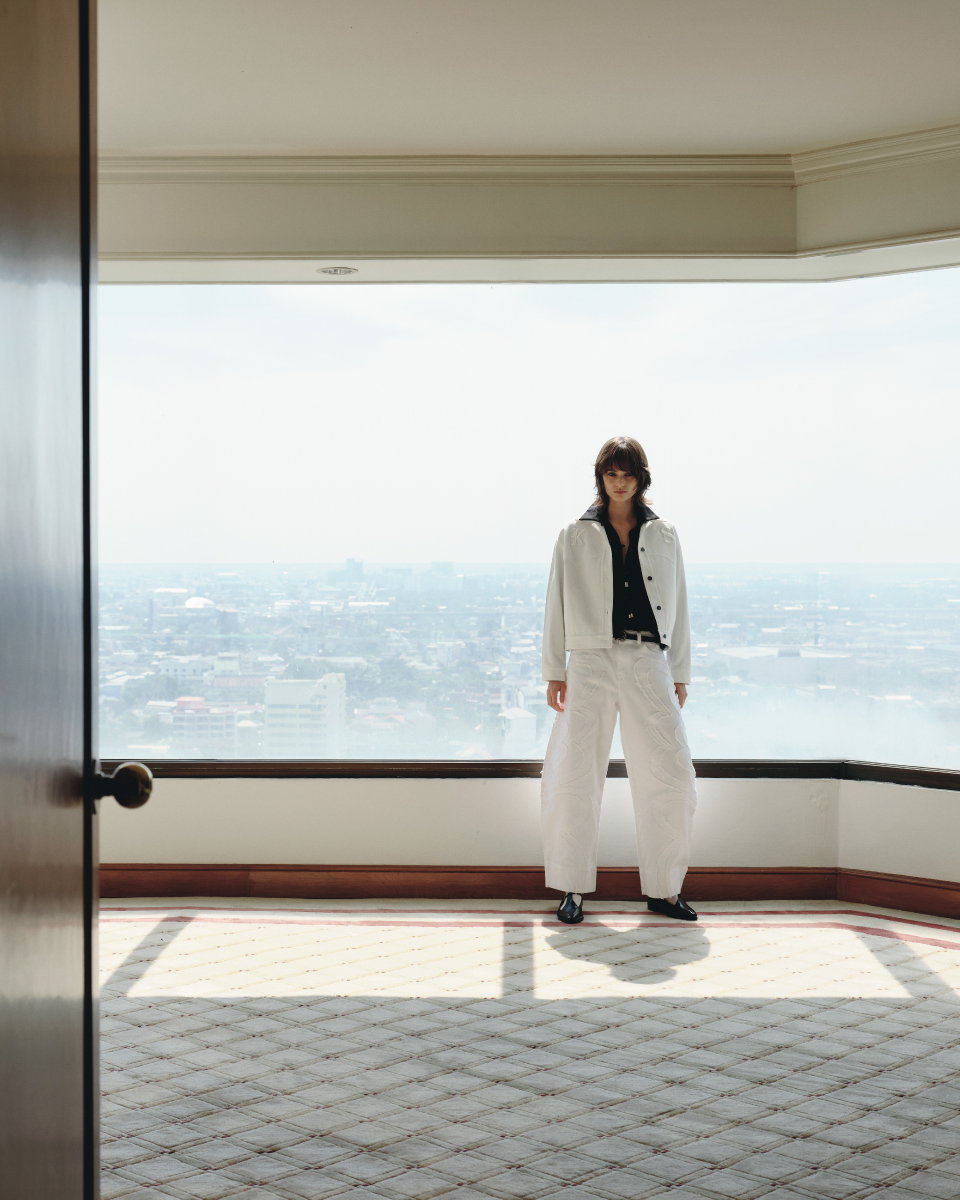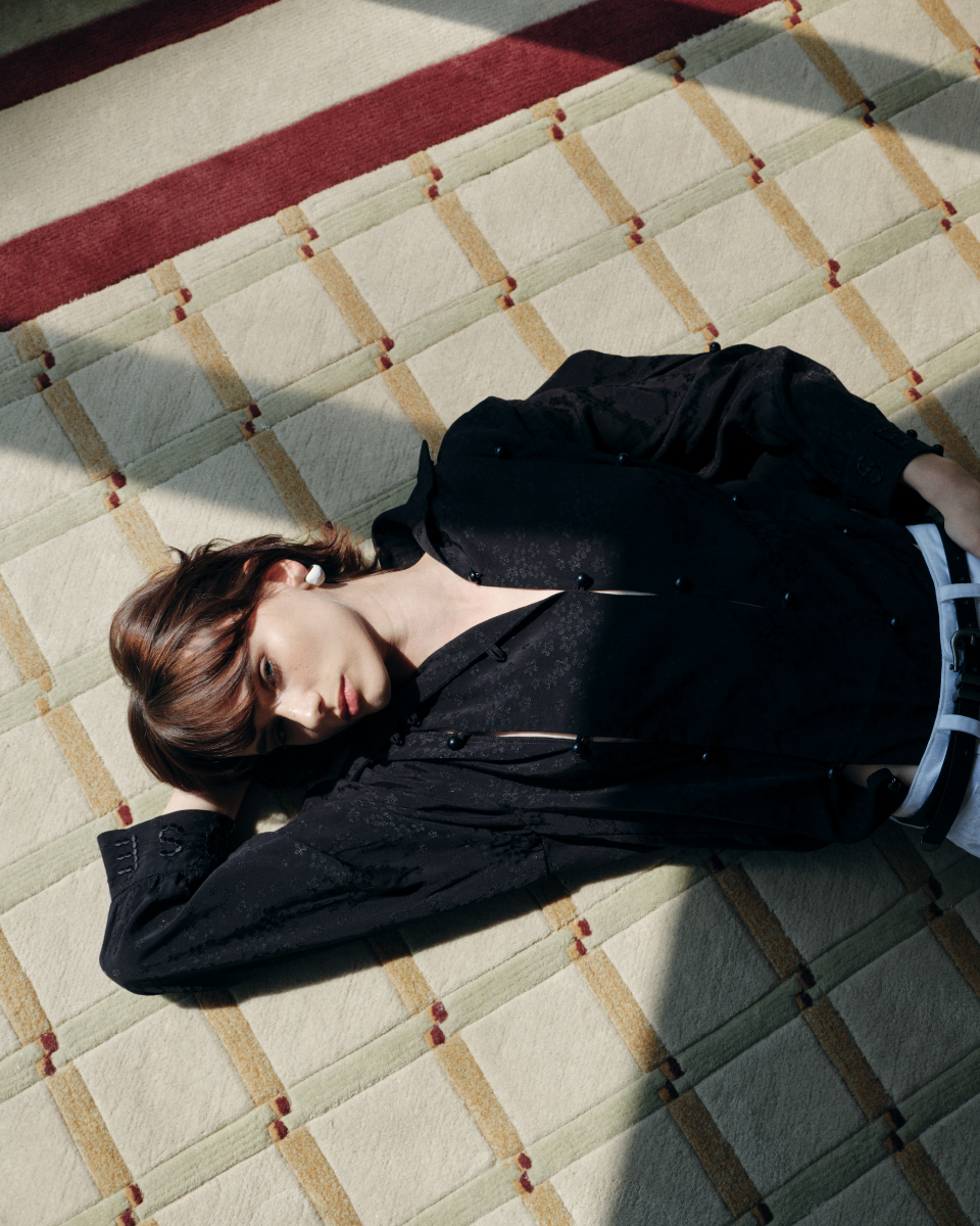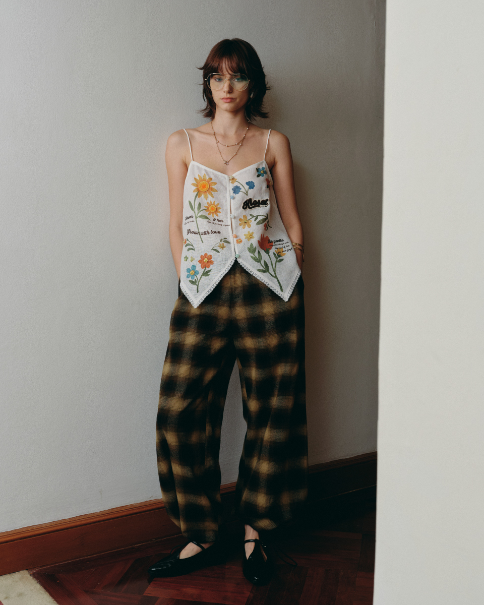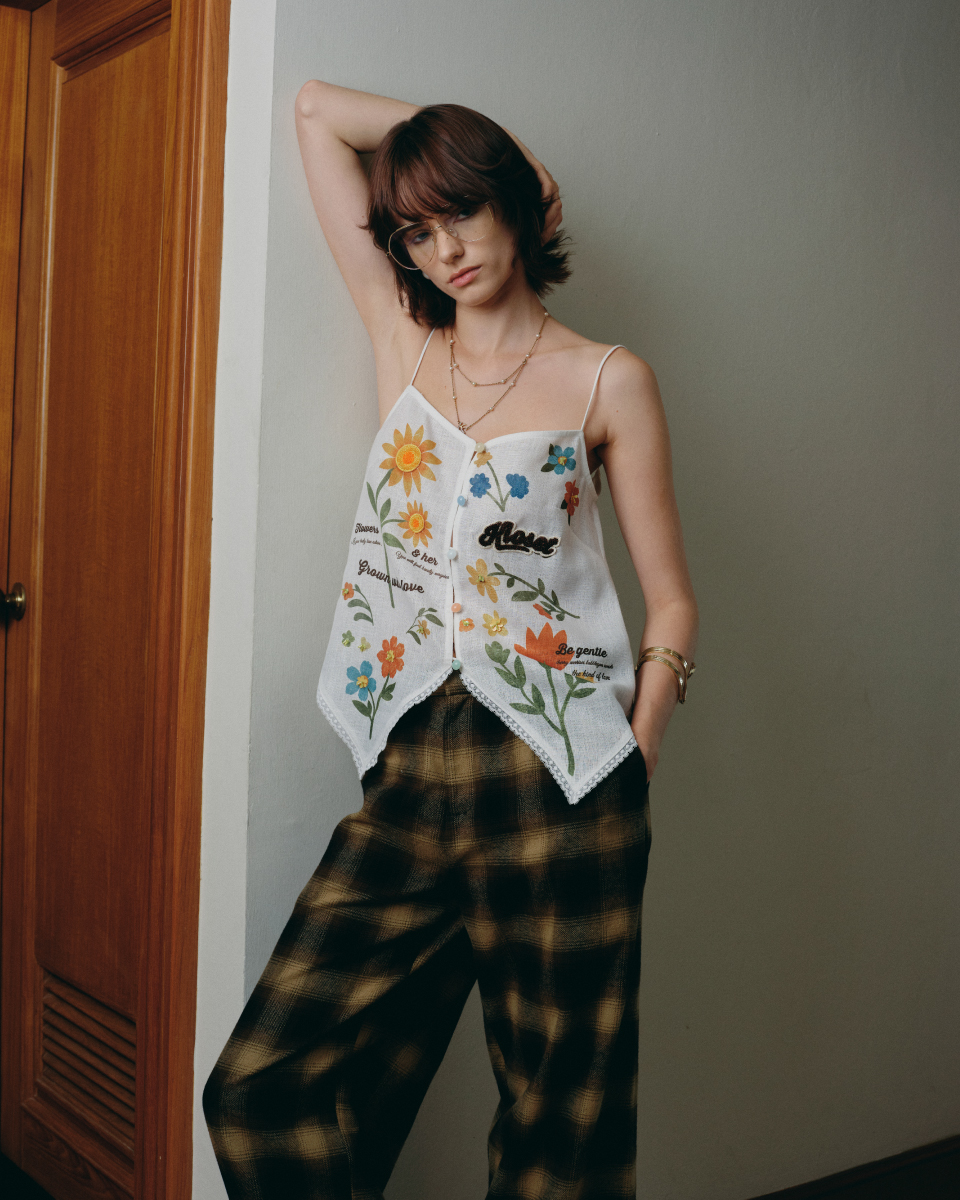 “The Fundamentals” revisits classic elements that feel renewed with every wear. Suede in earthy brown and olive tones sets the foundation, accompanied by cut-out embroidery of Kloset’s original butterfly logo. Denim pieces transform the iconic butterfly motif into patchwork details with raw edges, capturing a contemporary cowboy attitude. Intricate embroidery illustrating riders on horseback, traditional checks, and lace-up necklines further echo the nostalgic spirit of the 1970s—woven seamlessly into the collection’s narrative.