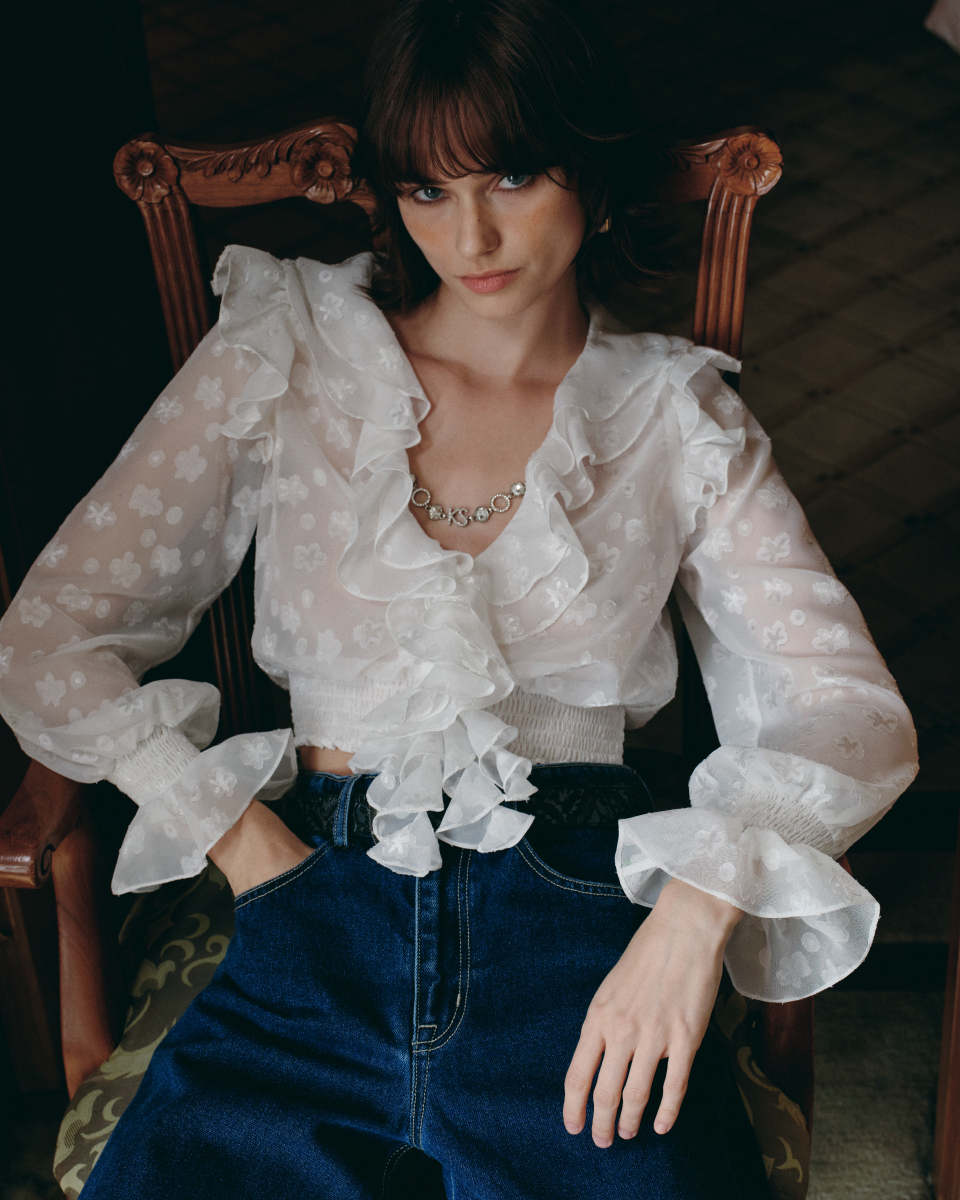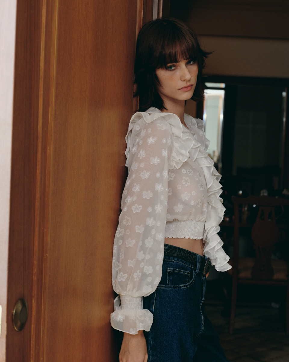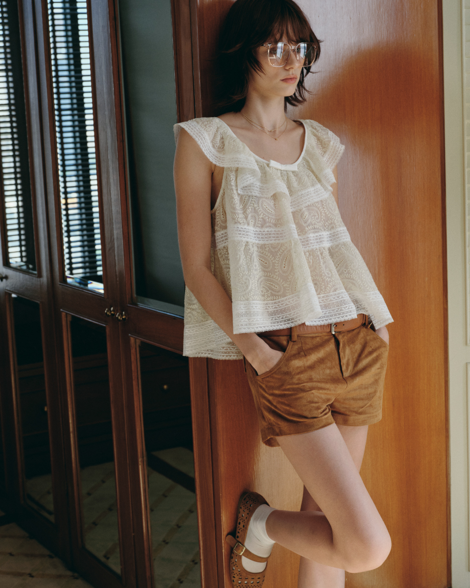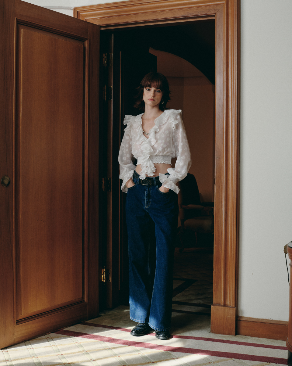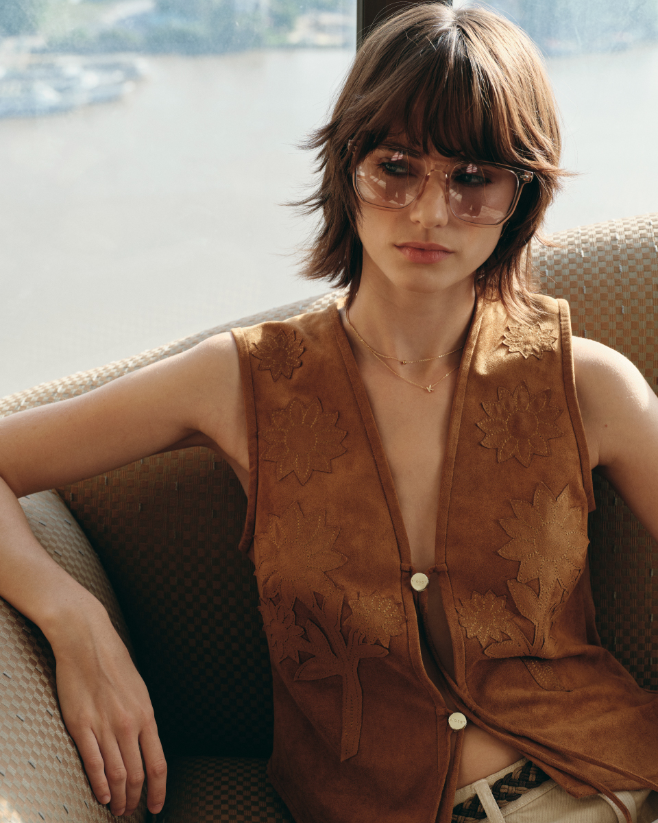 “The Fundamentals” revisits classic elements that feel renewed with every wear. Suede in earthy brown and olive tones sets the foundation, accompanied by cut-out embroidery of Kloset’s original butterfly logo. Denim pieces transform the iconic butterfly motif into patchwork details with raw edges, capturing a contemporary cowboy attitude. Intricate embroidery illustrating riders on horseback, traditional checks, and lace-up necklines further echo the nostalgic spirit of the 1970s—woven seamlessly into the collection’s narrative.
