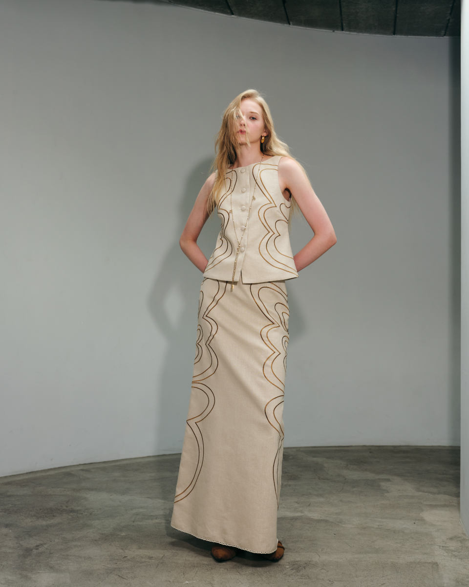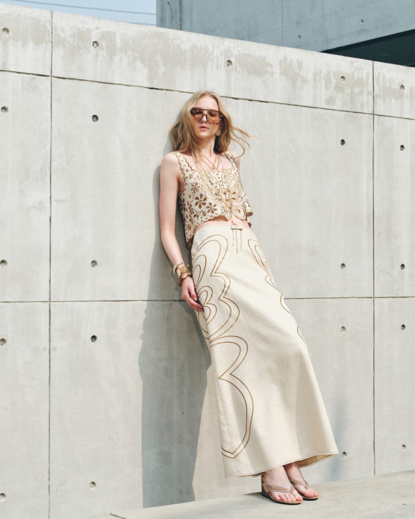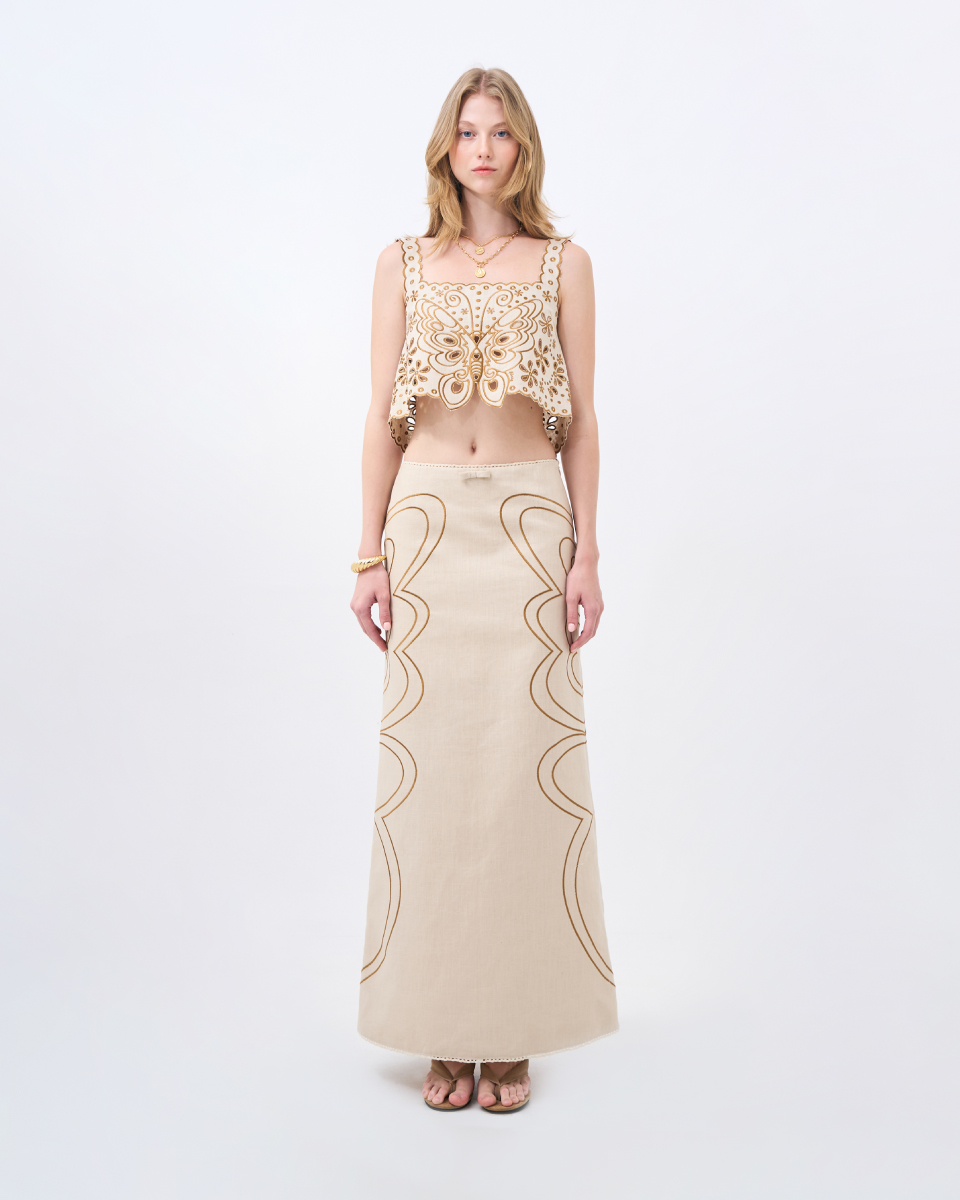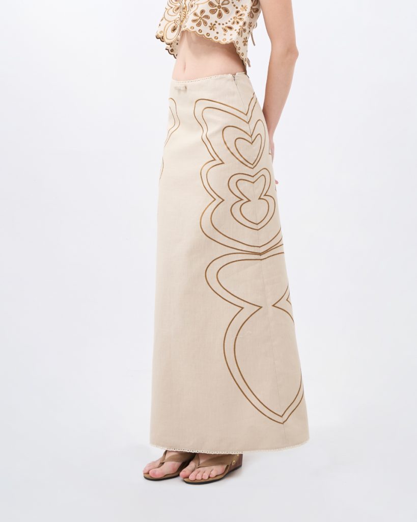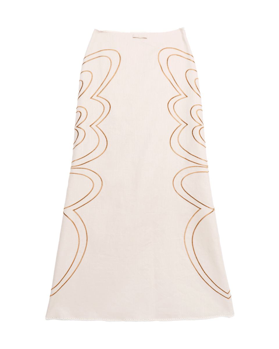 กระโปรงยาวผ้าลินิน ดีไซน์เอวต่ำ เรียบหรู ตกแต่งลายปักอย่างประณีต ทรงสวยช่วยเสริมสัดส่วน ใส่ง่าย