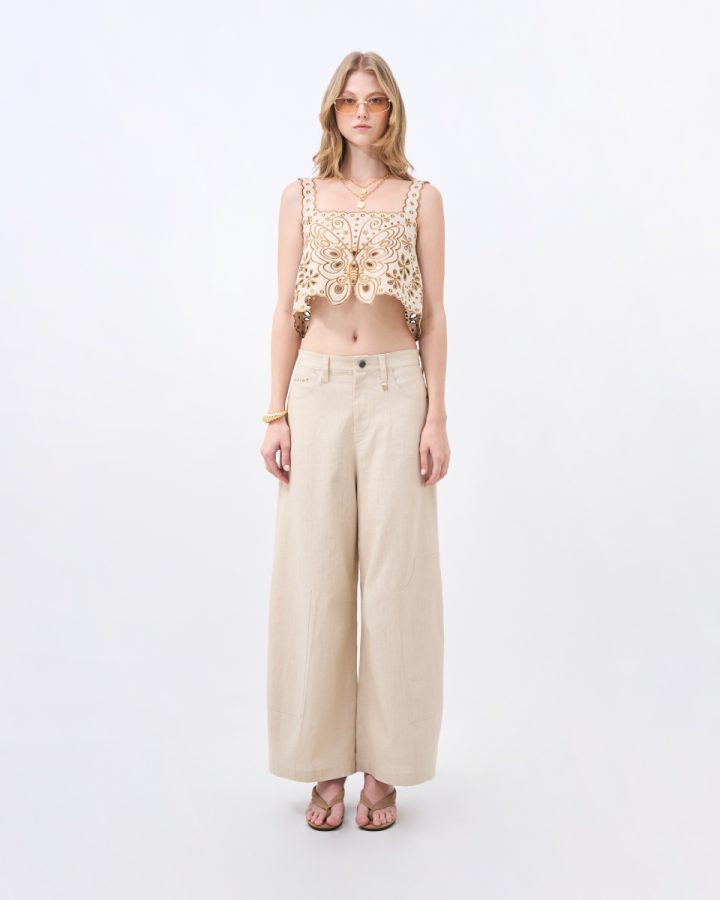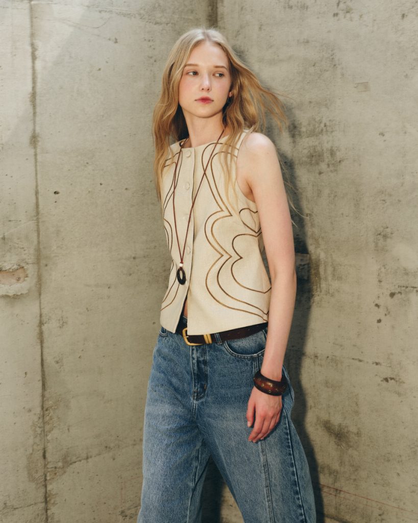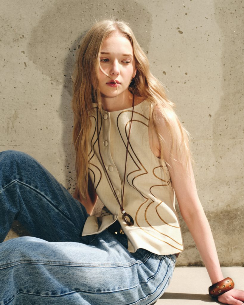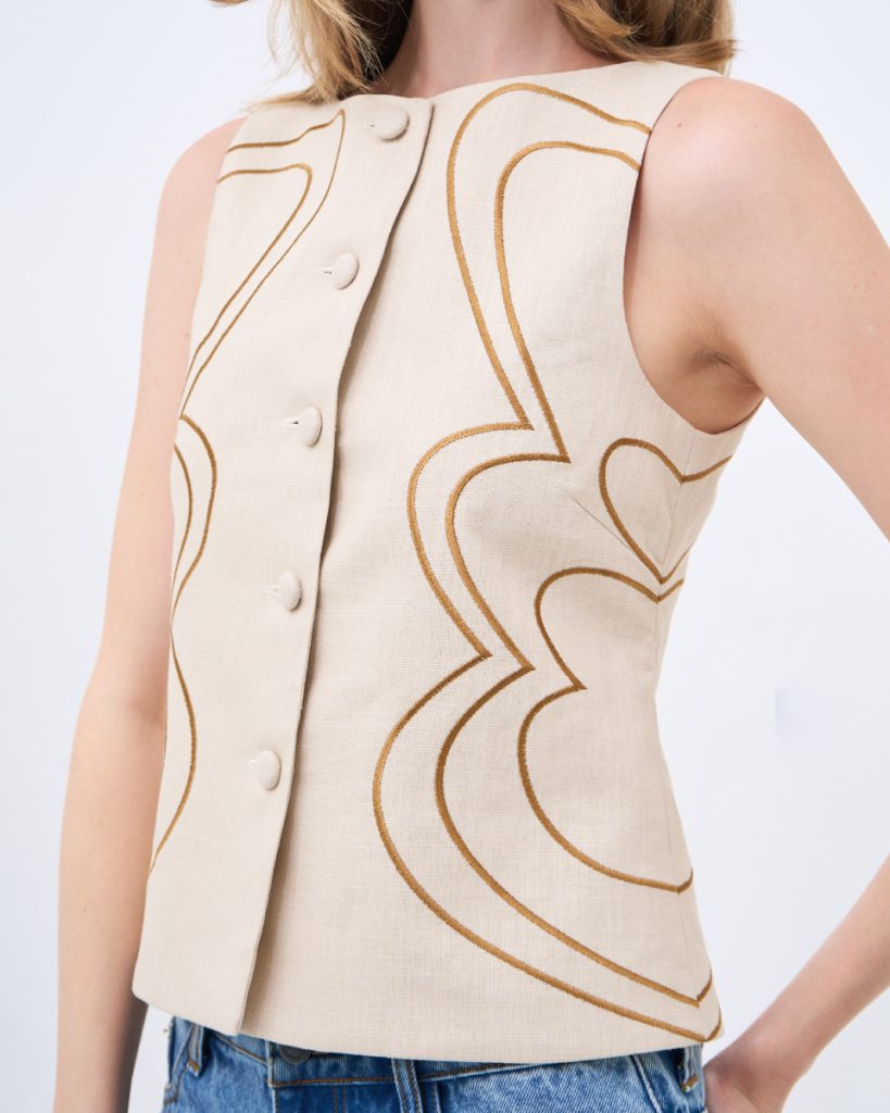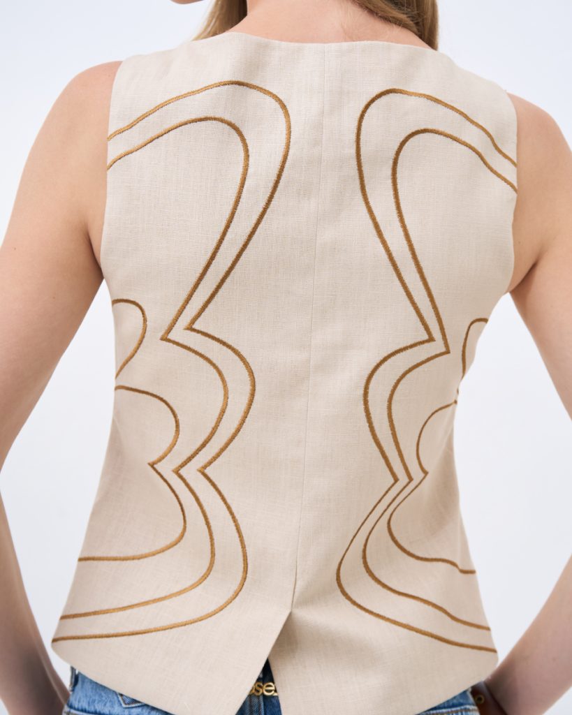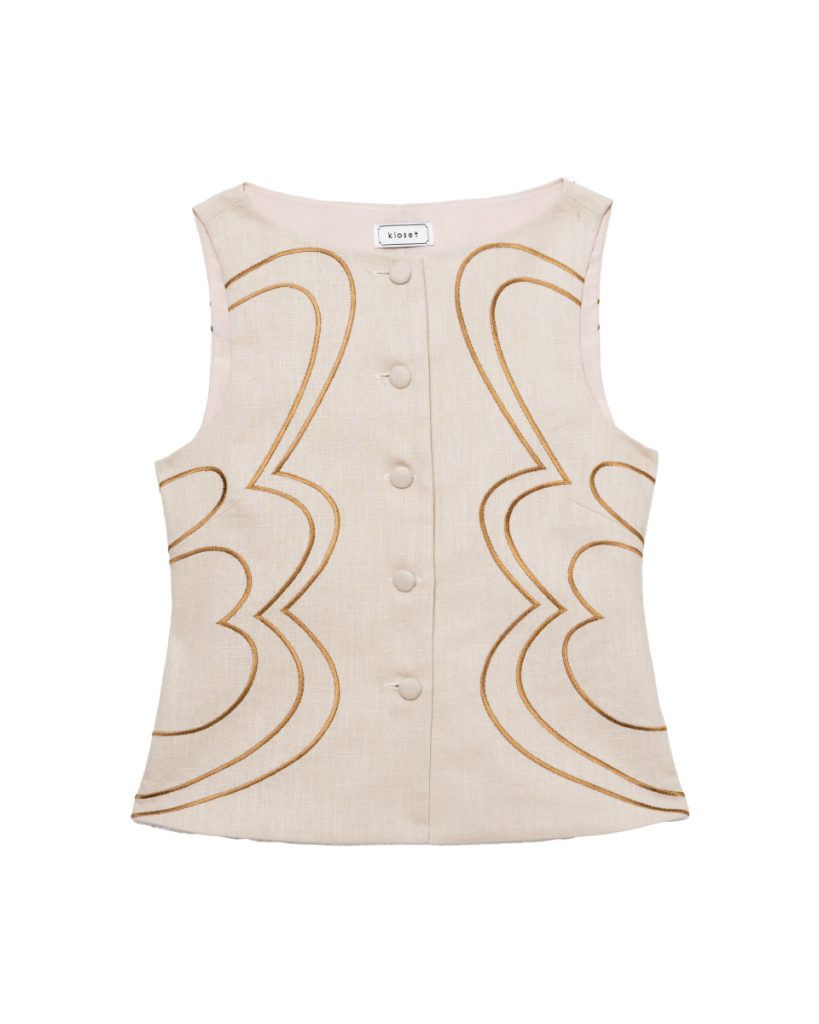 เสื้อแขนกุดผ้าลินินโทนครีม ดีไซน์เรียบหรู ตกแต่งลายปักเส้นโค้งอย่างประณีต เพิ่มมิติให้ตัวเสื้อโดยไม่ดูจัด ทรงพอดีตัว ใส่ง่าย เหมาะสำหรับสวมใส่ในวันทำงานหรือวันสบายๆ และสามารถแมตช์เป็นเซตได้อย่างลงตัว