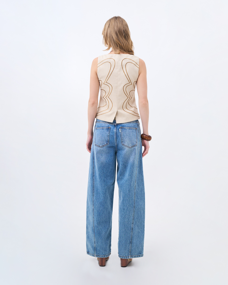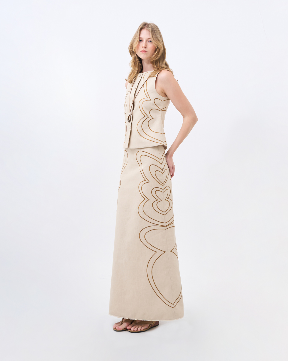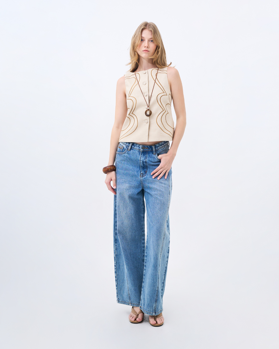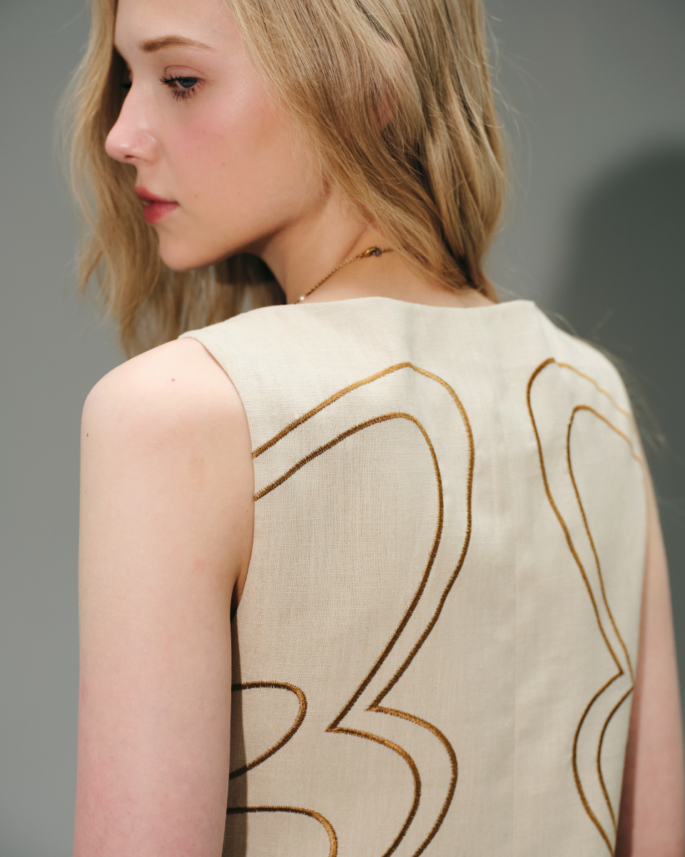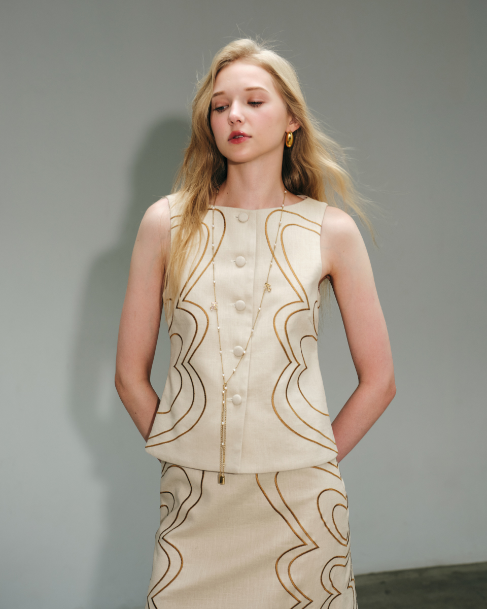 เสื้อแขนกุดผ้าลินินโทนครีม ดีไซน์เรียบหรู ตกแต่งลายปักเส้นโค้งอย่างประณีต เพิ่มมิติให้ตัวเสื้อโดยไม่ดูจัด ทรงพอดีตัว ใส่ง่าย เหมาะสำหรับสวมใส่ในวันทำงานหรือวันสบายๆ และสามารถแมตช์เป็นเซตได้อย่างลงตัว