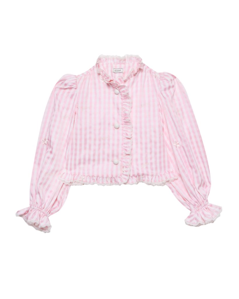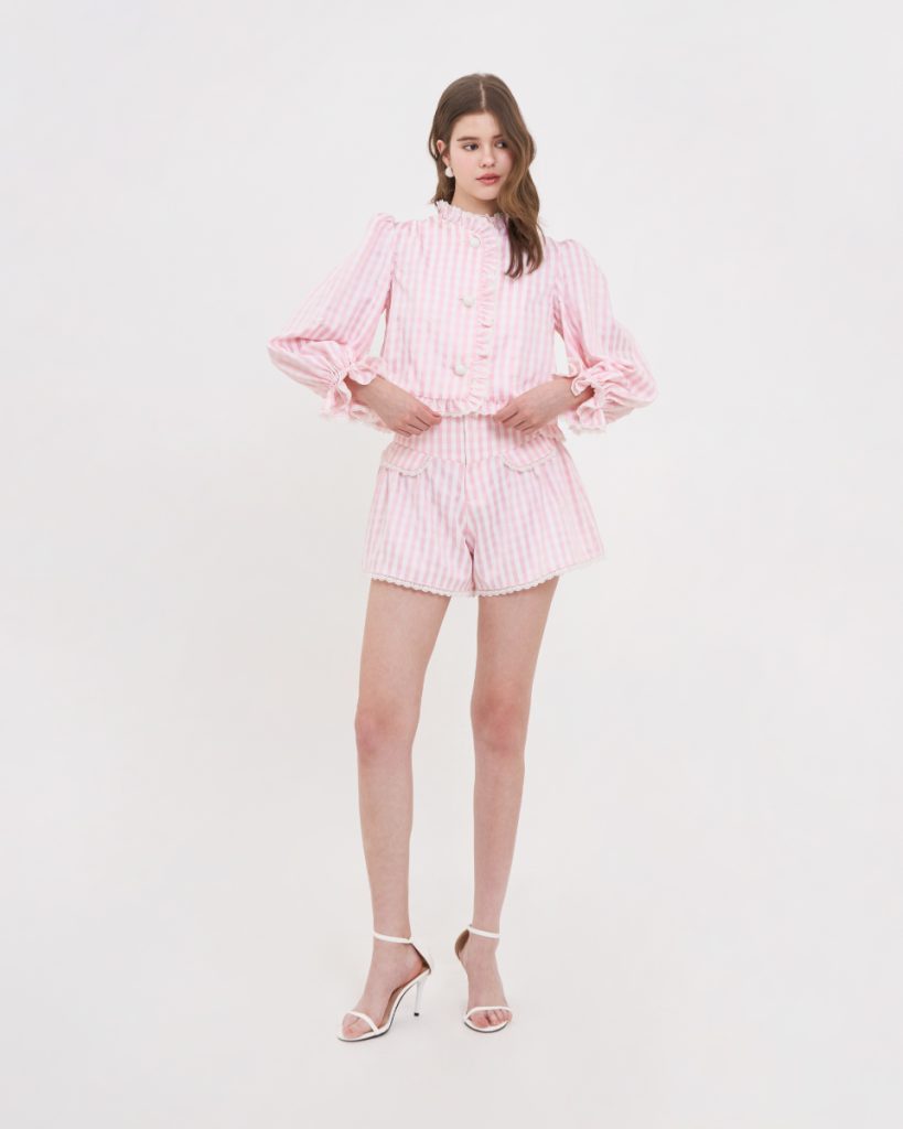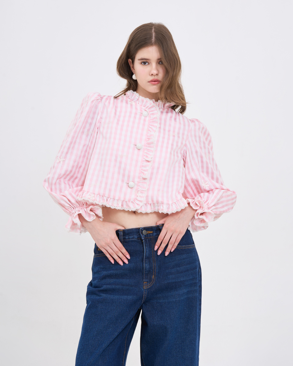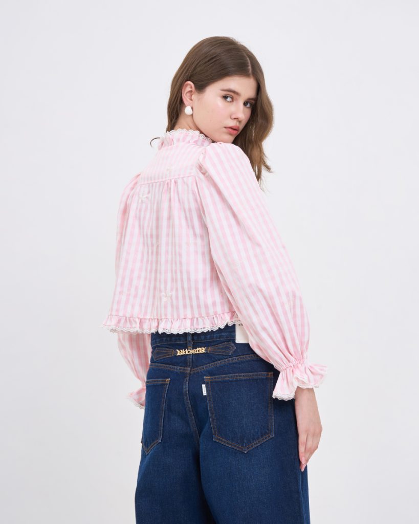 เสื้อแขนยาวโทนชมพูพาสเทล ลายทาง ตกแต่งระบายช่วงคอและหน้าเสื้อ ดีไซน์แขนพองเล็กน้อย ใส่สบาย เหมาะกับลุควันสบาย ไม่ทางการจนเกินไป