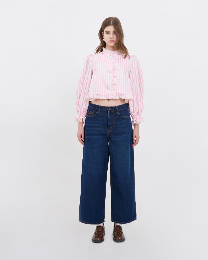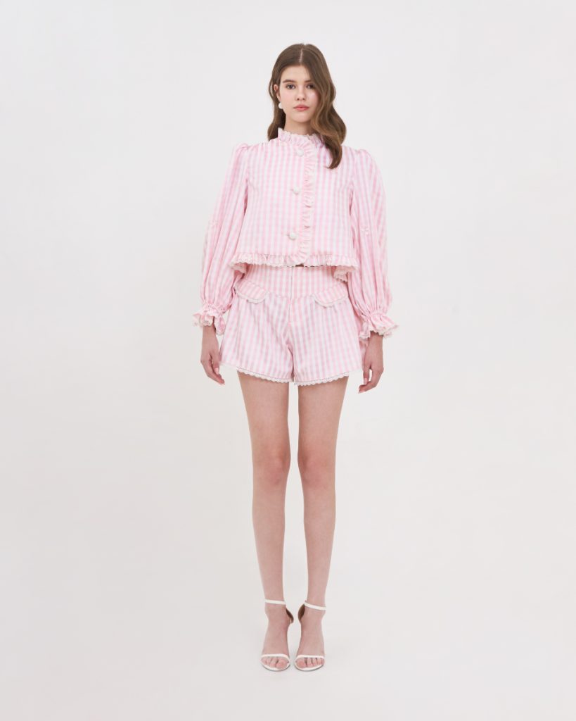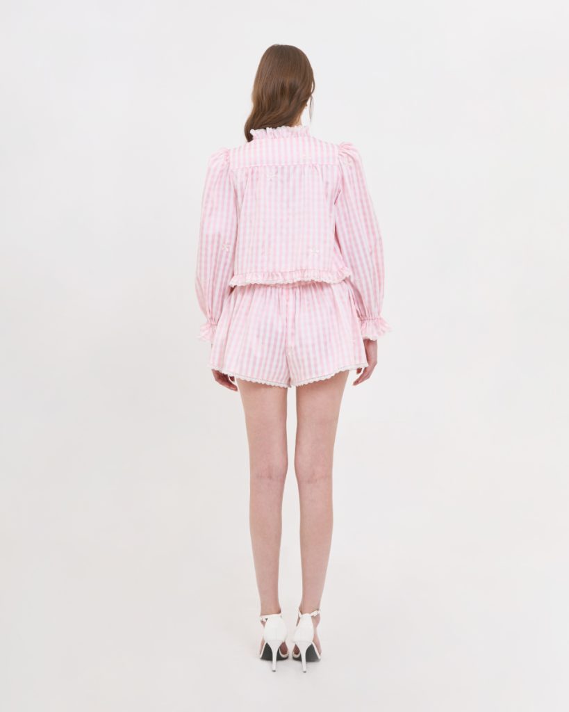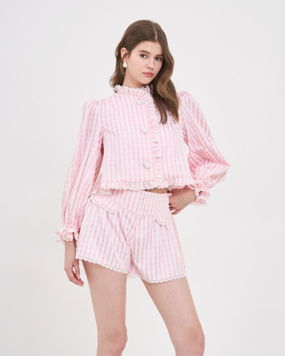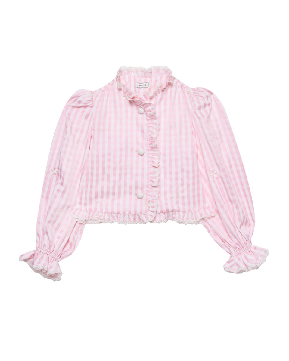 เสื้อแขนยาวโทนชมพูพาสเทล ลายทาง ตกแต่งระบายช่วงคอและหน้าเสื้อ ดีไซน์แขนพองเล็กน้อย ใส่สบาย เหมาะกับลุควันสบาย ไม่ทางการจนเกินไป
