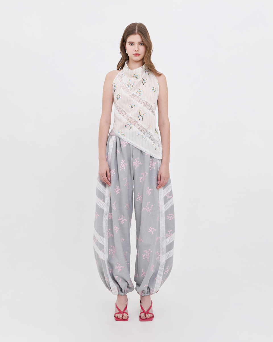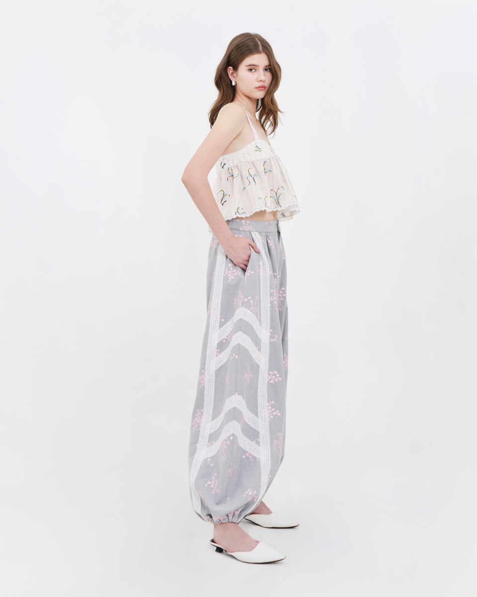 กางเกงขายาวทรงหลวม โทนสีเทาตกแต่งลายปักดอกไม้เล็ก ๆ เพิ่มดีเทลลูกไม้ด้านข้างให้ลุคดูนุ่มนวลและมีมิติ