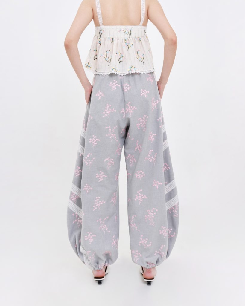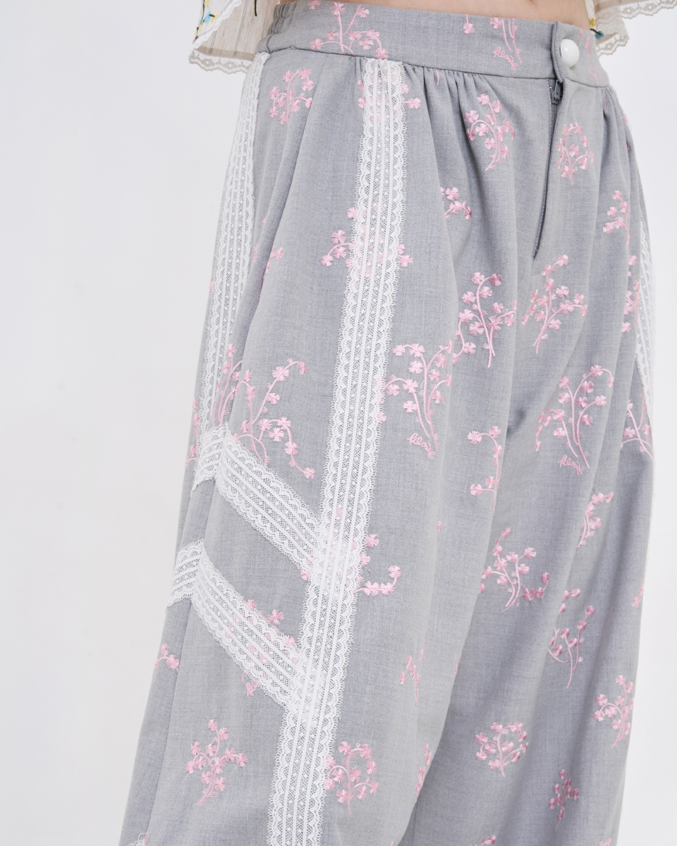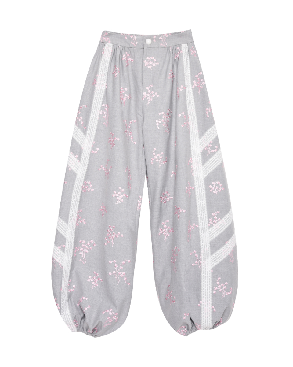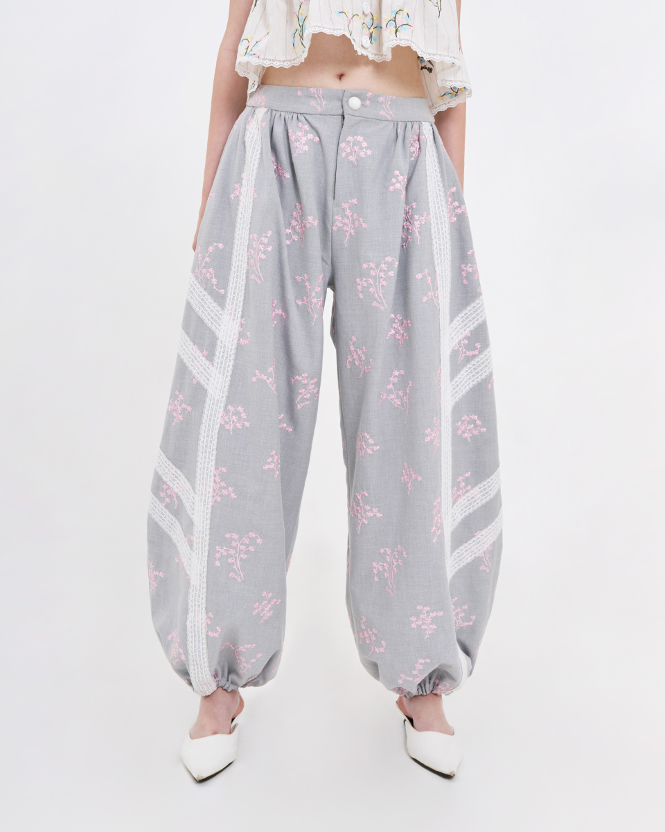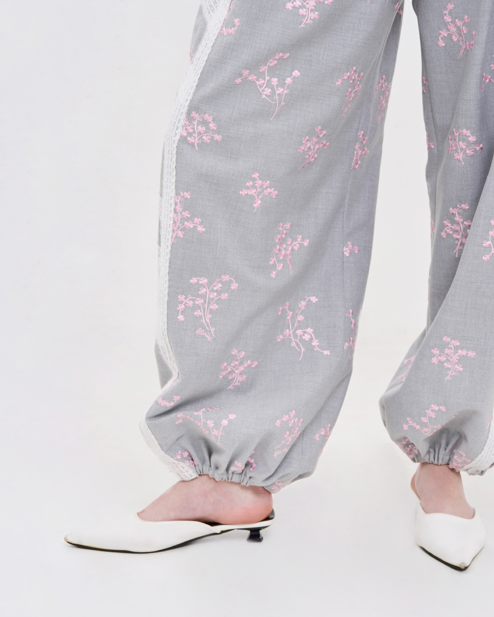 Fit & Detail: Relaxed-fit long pants in a soft grey tone, detailed with delicate floral embroidery and lace panels along the sides for added texture and femininity.