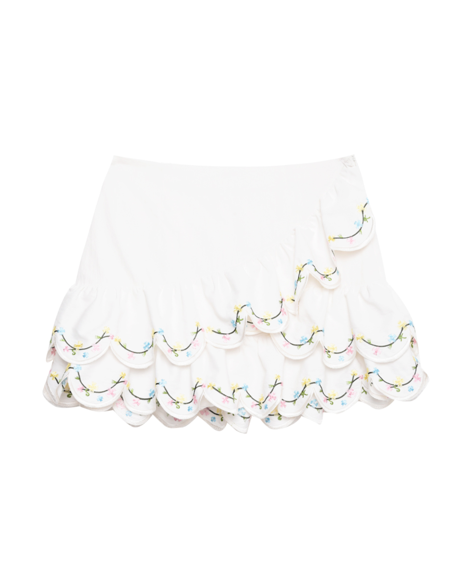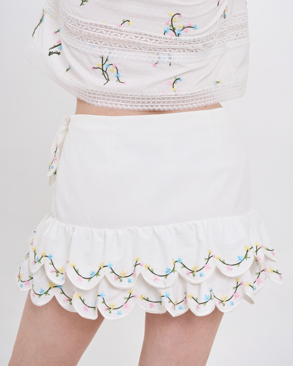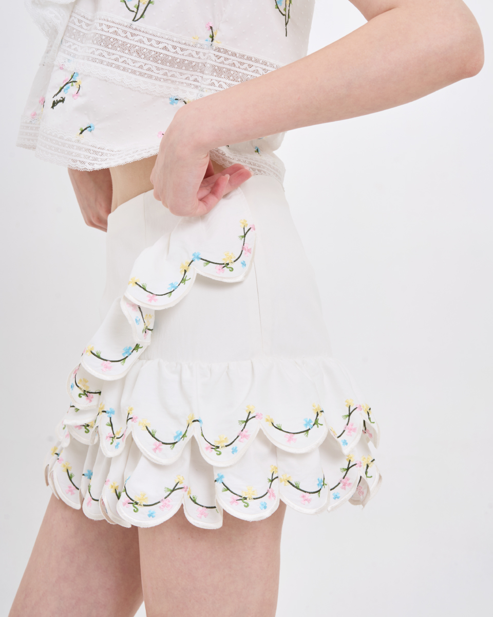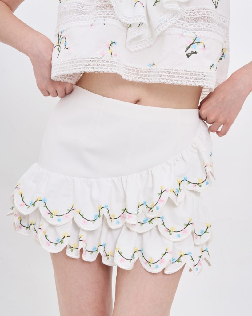 กระโปรงสั้นโทนสีขาว ดีไซน์เอวสูง ใส่แล้วดูโปร่งสบาย เพิ่มความน่ารักด้วยดีเทลระบายซ้อนช่วงชายกระโปรง พร้อมลายปักเล็ก ๆ ที่ให้ความรู้สึกละมุนสวมใส่ง่ายด้วยซิปด้านข้าง และมีซับใน ทรงใส่ง่าย เคลื่อนไหวสะดวก