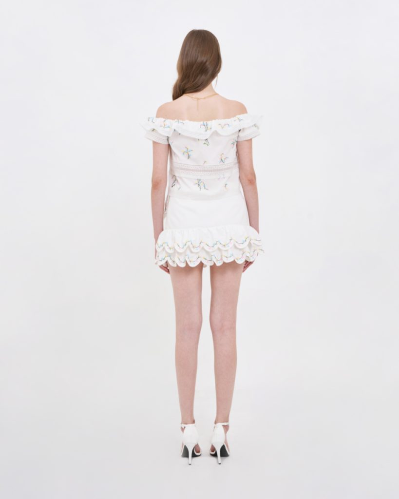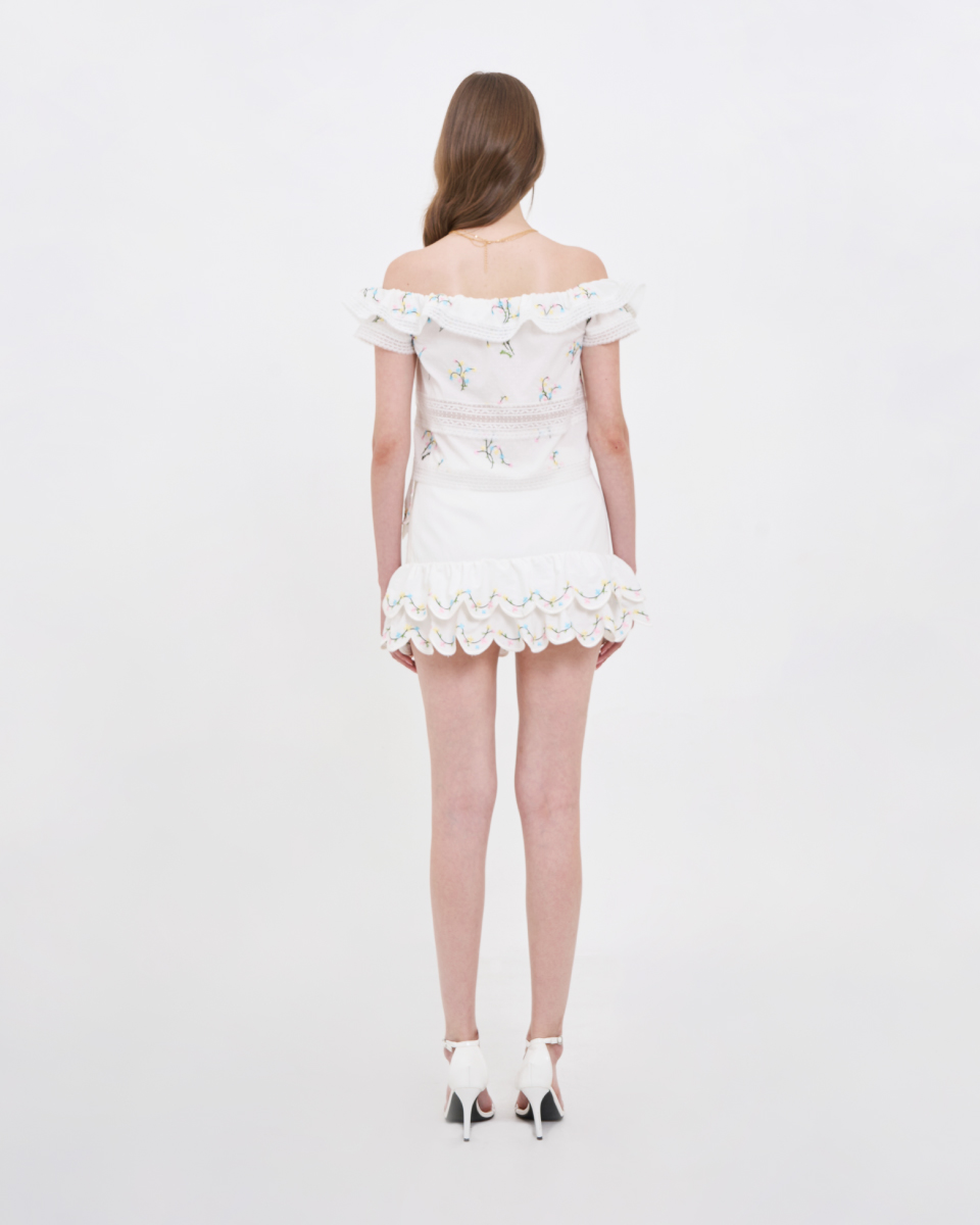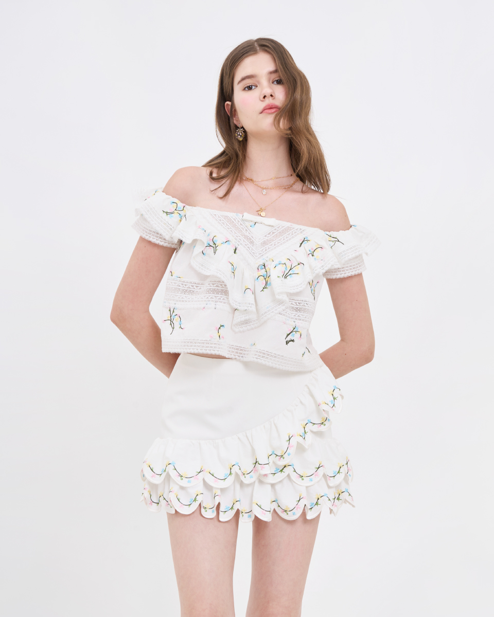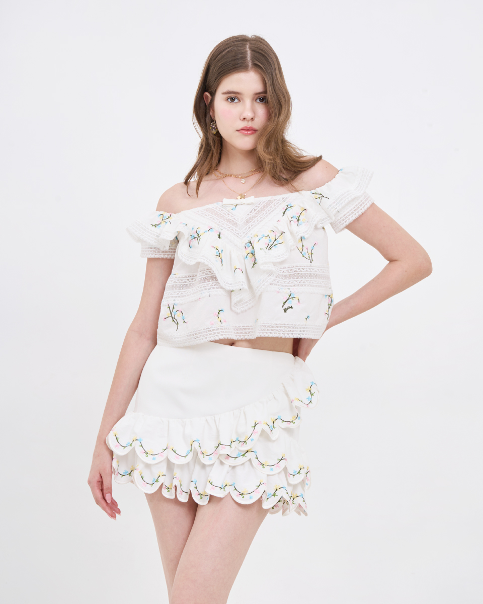 กระโปรงสั้นโทนสีขาว ดีไซน์เอวสูง ใส่แล้วดูโปร่งสบาย เพิ่มความน่ารักด้วยดีเทลระบายซ้อนช่วงชายกระโปรง พร้อมลายปักเล็ก ๆ ที่ให้ความรู้สึกละมุนสวมใส่ง่ายด้วยซิปด้านข้าง และมีซับใน ทรงใส่ง่าย เคลื่อนไหวสะดวก