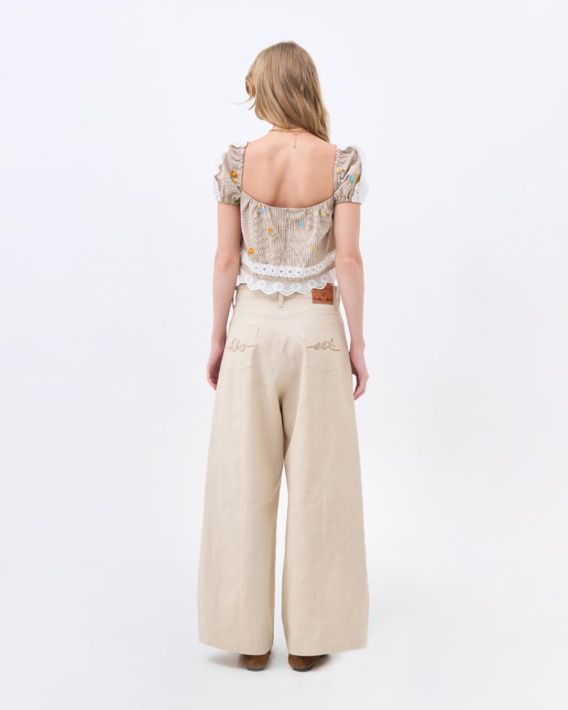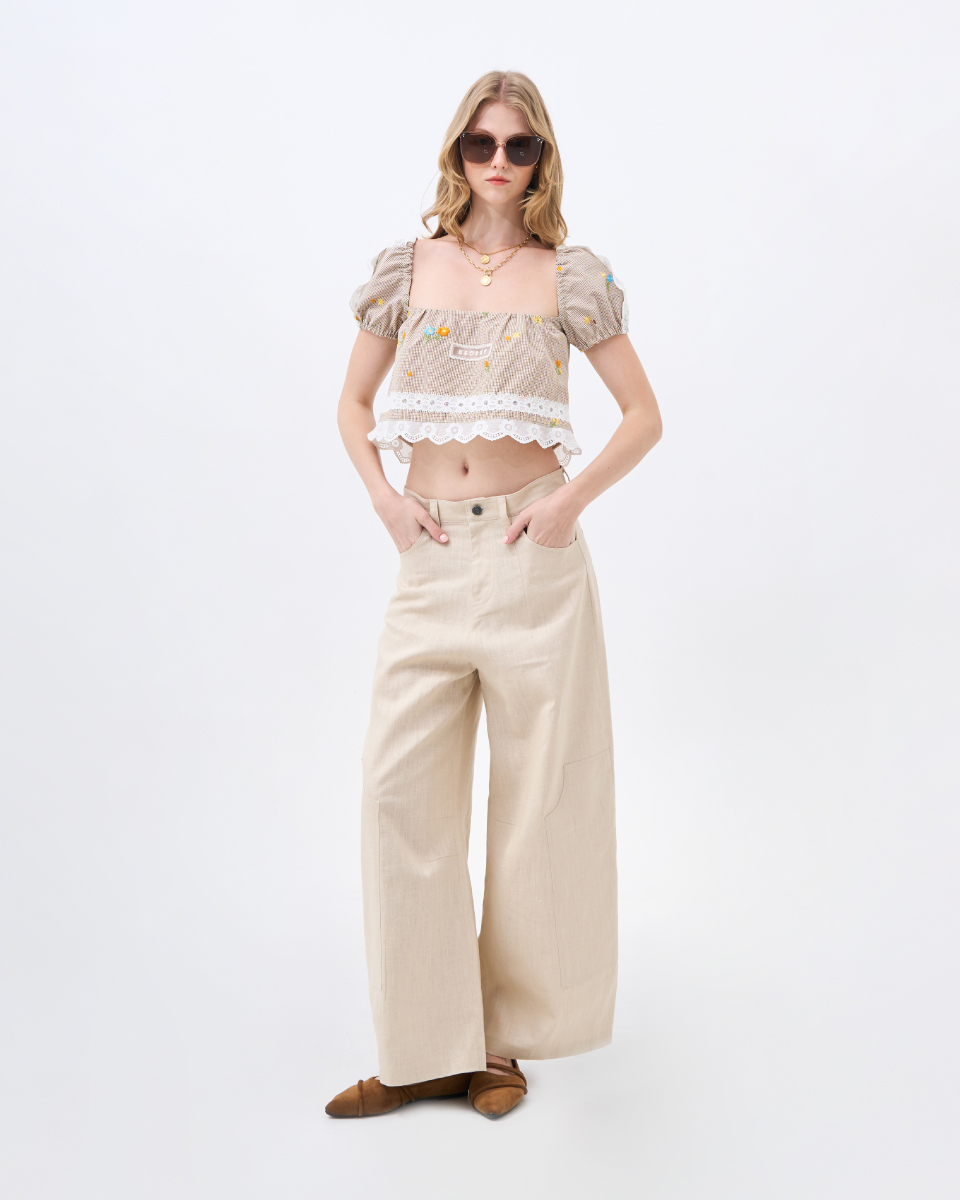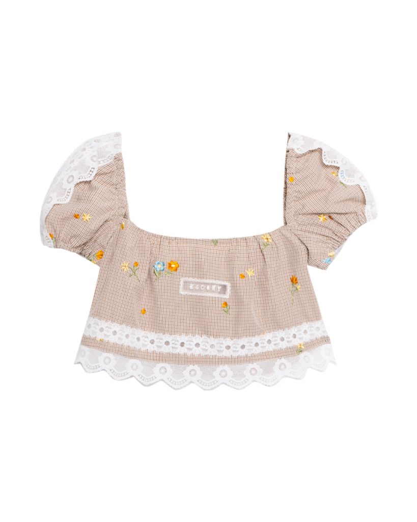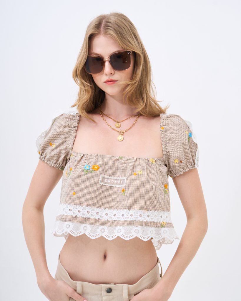 เสื้อครอปแขนพองลายตาราง ตกแต่งลายปักดอกไม้และขอบลูกไม้ ดีไซน์หวานละมุน ใส่สบาย ให้ลุคเฟมินีนแบบน่ารักพอดีตัว