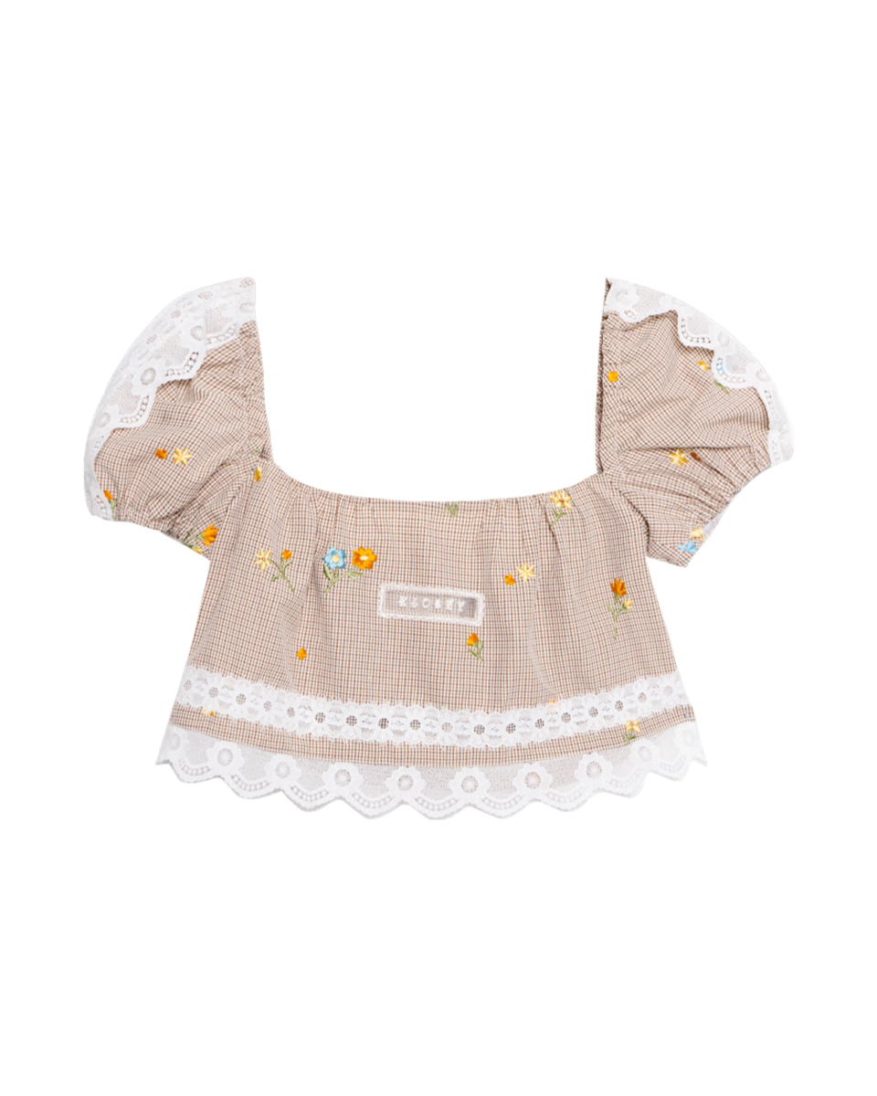 Fit & Detail: Gingham crop top with puff sleeves, finished with delicate floral embroidery and lace trim.