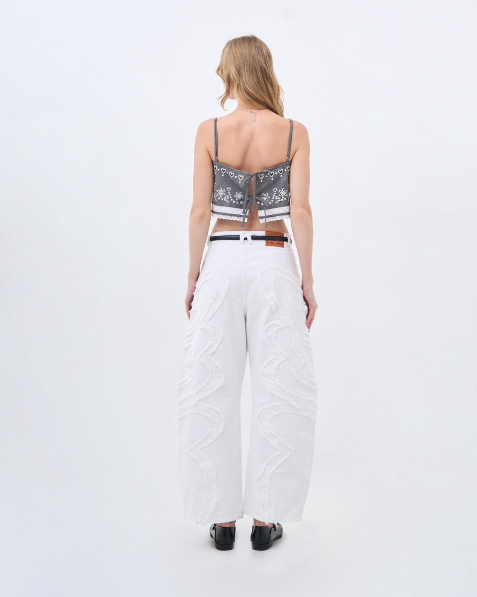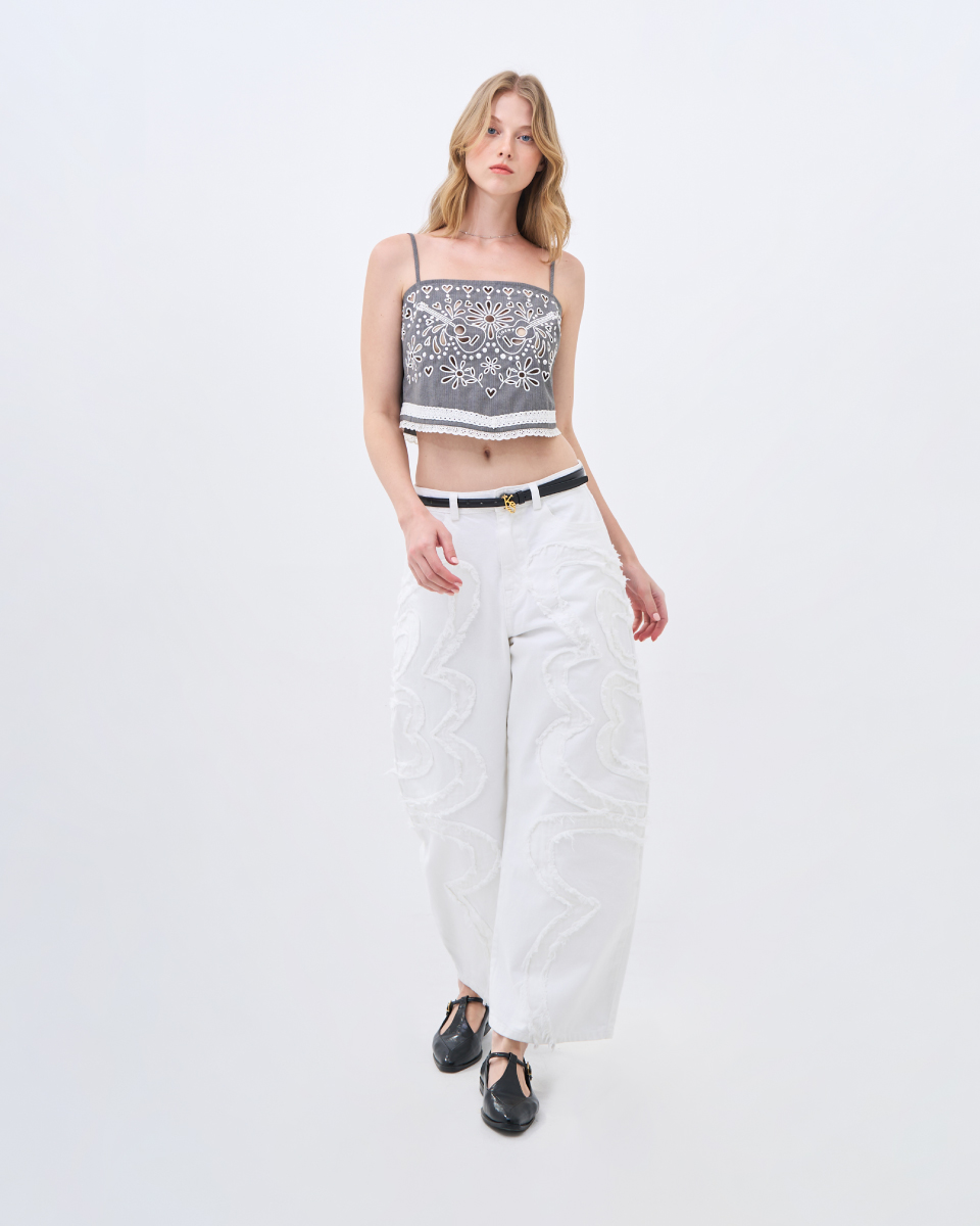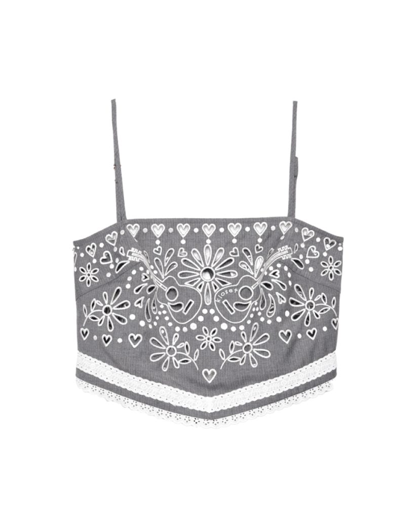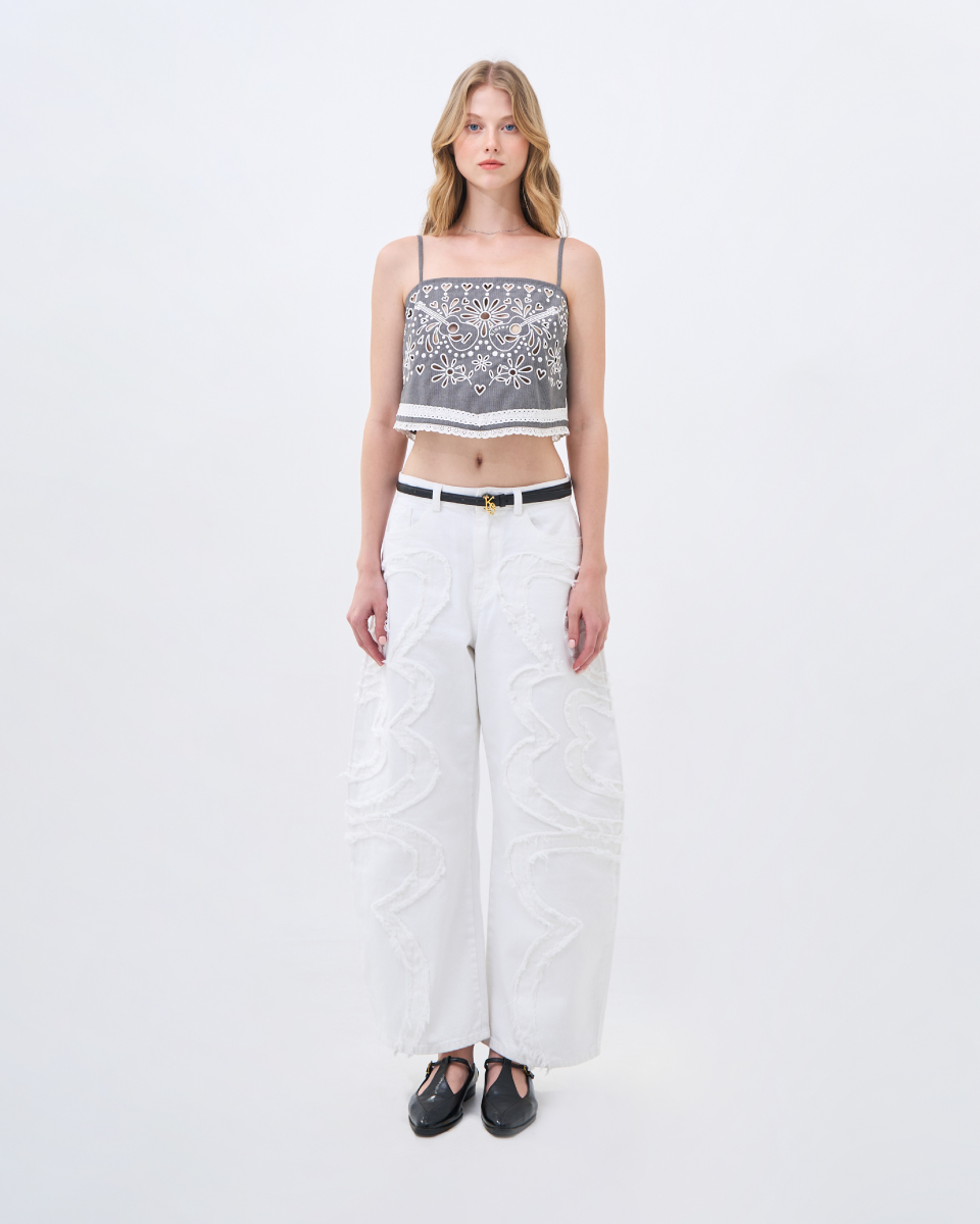 Fit & Detail: A chic scarf-inspired cami top that blends feminine charm with a touch of edge. Beautifully embroidered with guitar and floral motifs, this piece brings a unique character to your look. Designed with a relaxed fit for ultimate comfort, featuring adjustable tie straps at the shoulders and back for a customizable fit. Finished with delicate lace embroidery at the hem, it pairs effortlessly with high-waisted pants or skirts.
