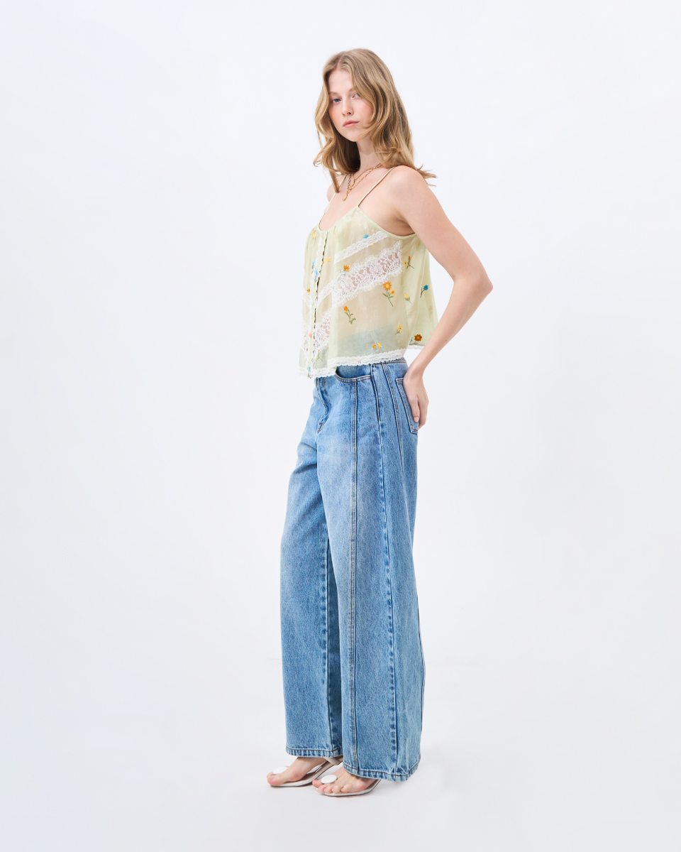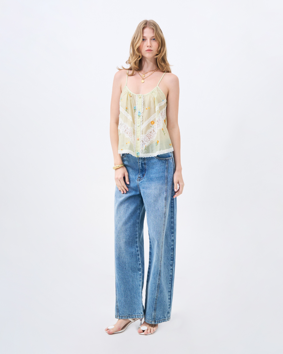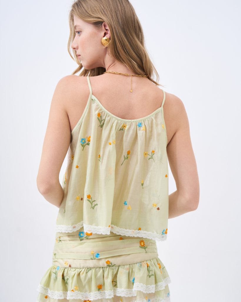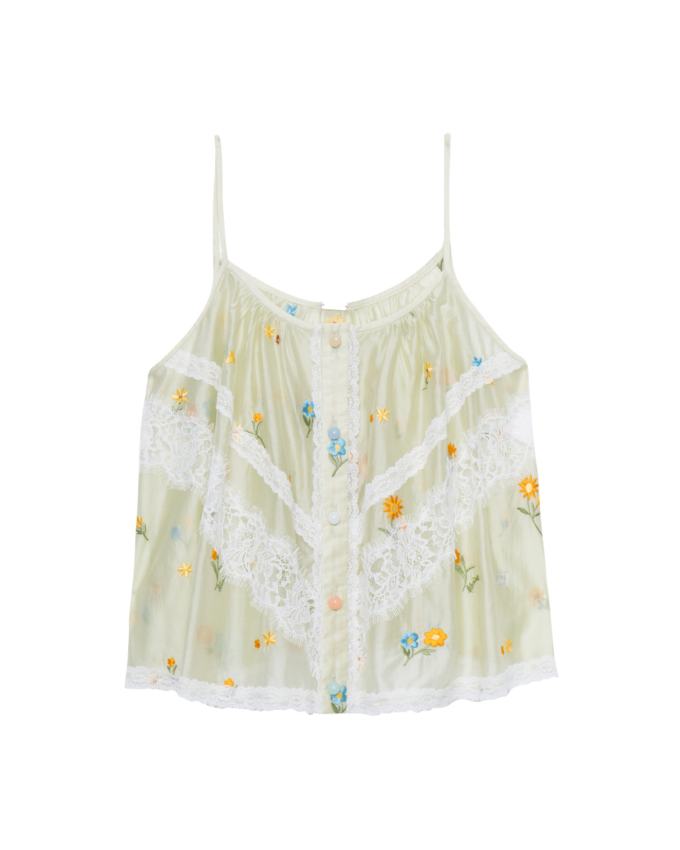 เสื้อสายเดี่ยวโทนเขียวอ่อน ดีไซน์บางเบา ตกแต่งลายปักดอกไม้และลูกไม้ เพิ่มรายละเอียดให้ลุคดูอ่อนโยน ทรงใส่สบาย เหมาะสำหรับใส่ในวันสบายๆ หรือเลเยอร์กับเสื้อตัวนอก