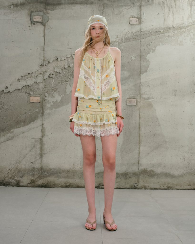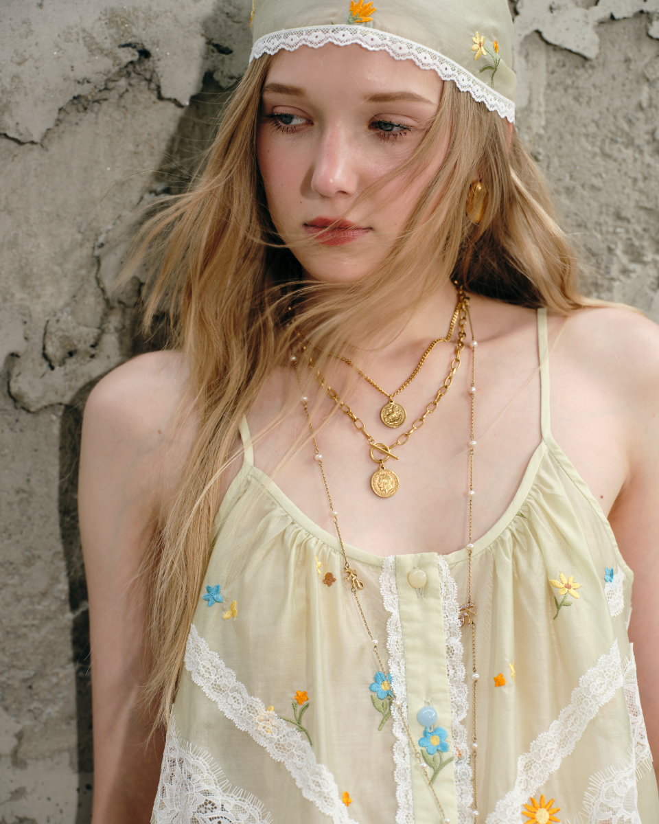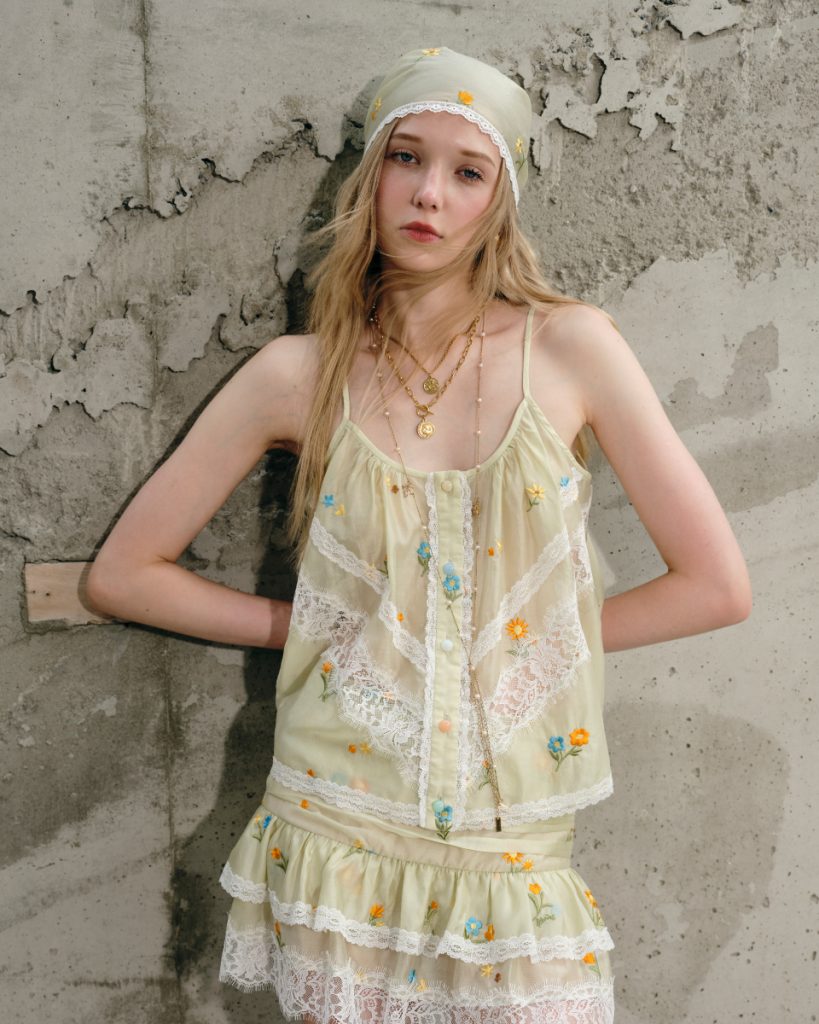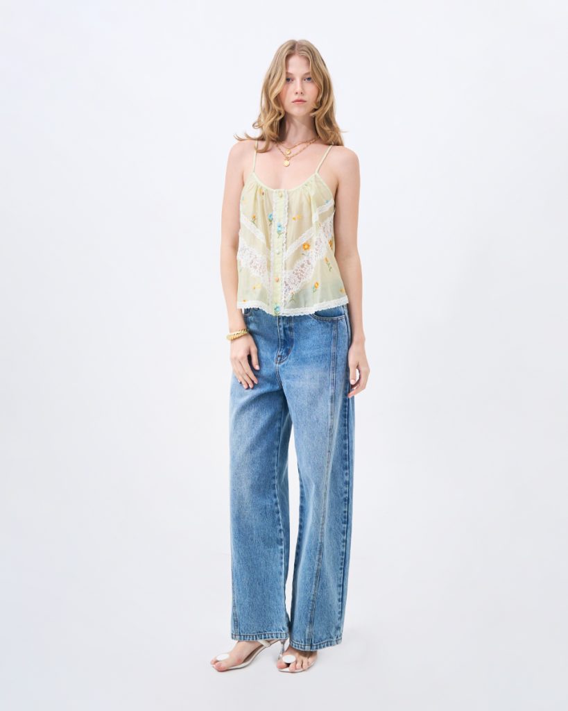 เสื้อสายเดี่ยวโทนเขียวอ่อน ดีไซน์บางเบา ตกแต่งลายปักดอกไม้และลูกไม้ เพิ่มรายละเอียดให้ลุคดูอ่อนโยน ทรงใส่สบาย เหมาะสำหรับใส่ในวันสบายๆ หรือเลเยอร์กับเสื้อตัวนอก