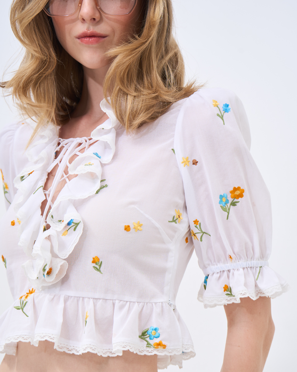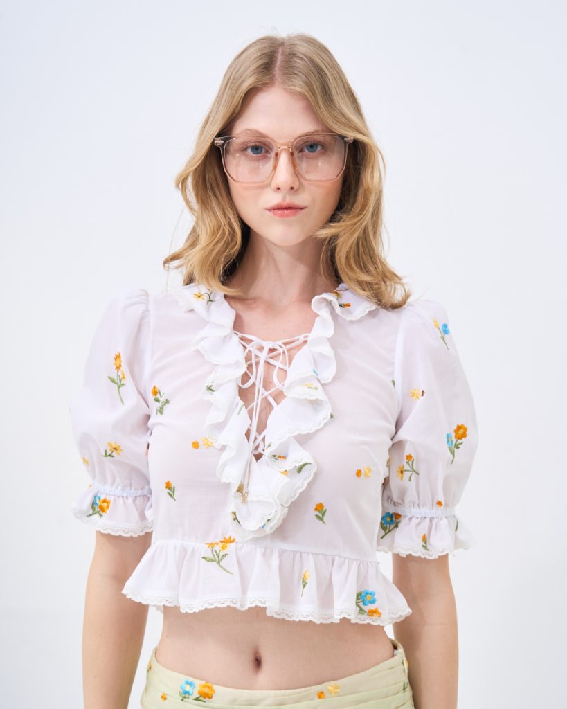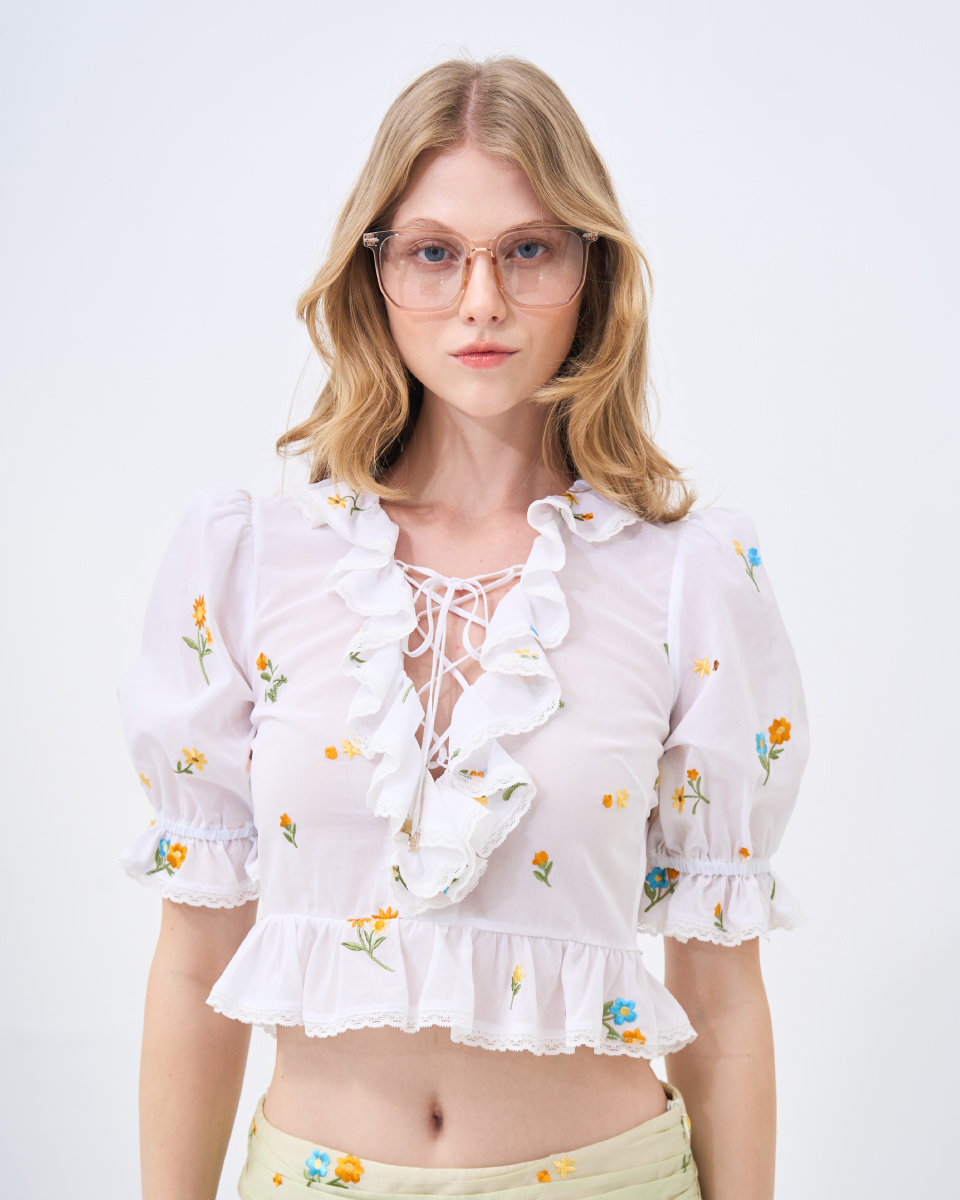 Fit & Detail: Floral embroidered crop top with puff sleeves and lace ruffle details.