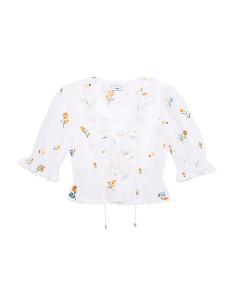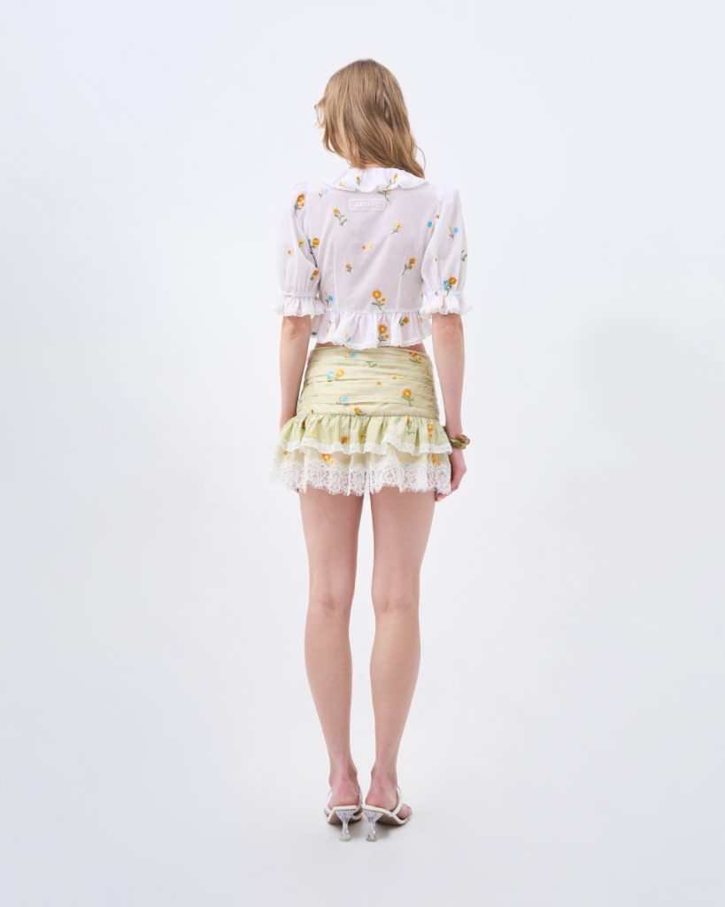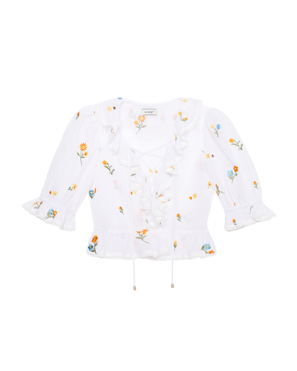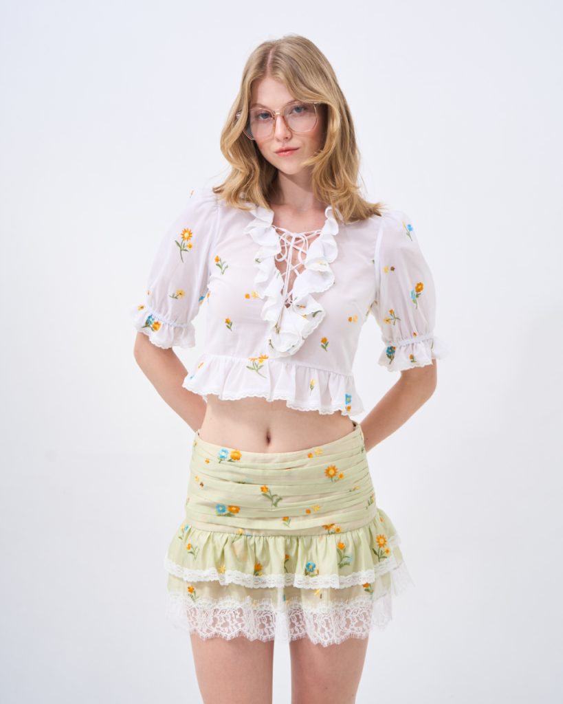 Fit & Detail: Floral embroidered crop top with puff sleeves and lace ruffle details.