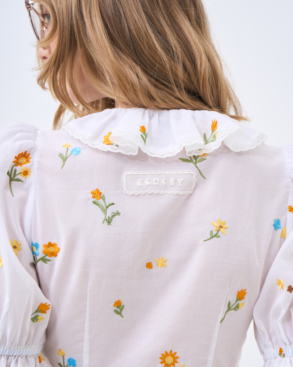 เสื้อครอปแขนพอง ตกแต่งลายปักดอกไม้และระบายลูกไม้