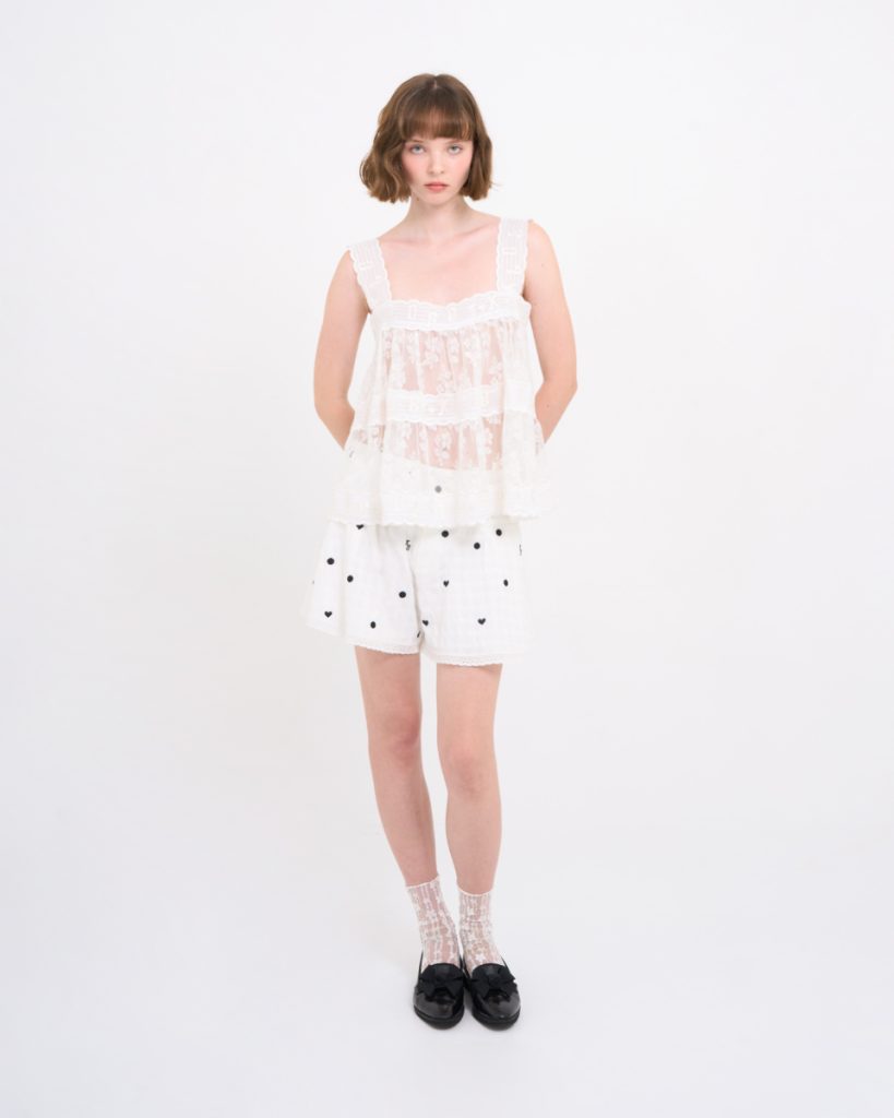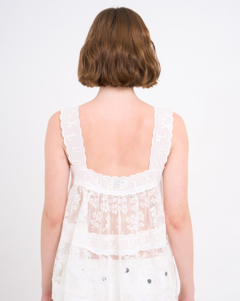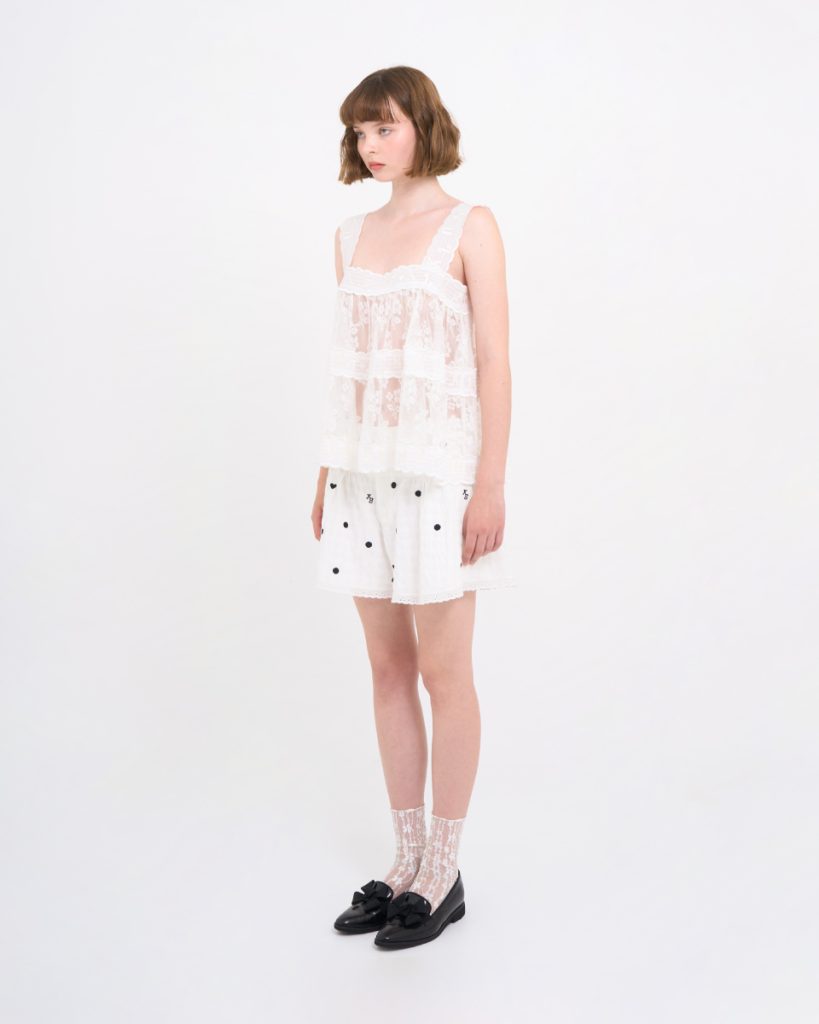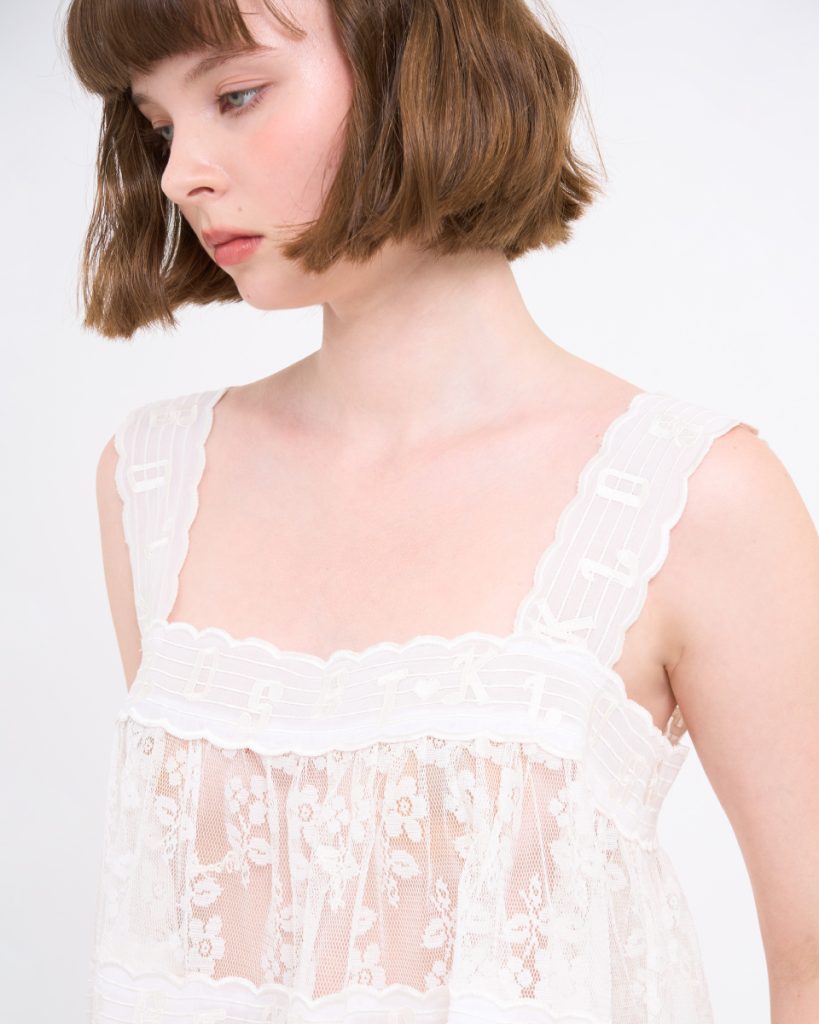 เสื้อลูกไม้สุดหรู ผลิตจากผ้าลูกไม้ทั้งตัว ดีไซน์เฟมินีนที่ดูหวานละมุน เพิ่มดีเทลด้วยเทปโลโก้ช่วยขับลุคให้ดูทันสมัย สวมใส่สบาย น้ำหนักเบา
