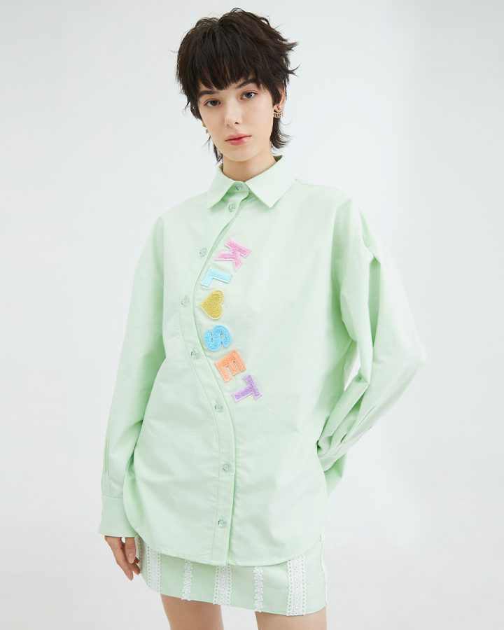 เสื้อเชิ้ตแขนยาว เพิ่มลูกเล่น ด้วยดีไซน์โค้งของสาบกระดุม ประดับด้วยตัวอักษร Kloset