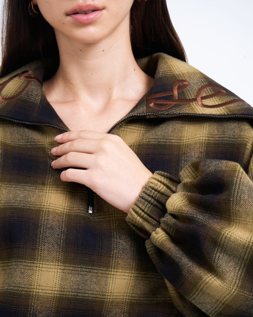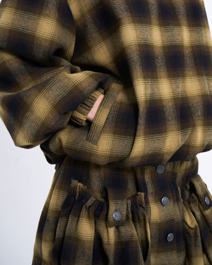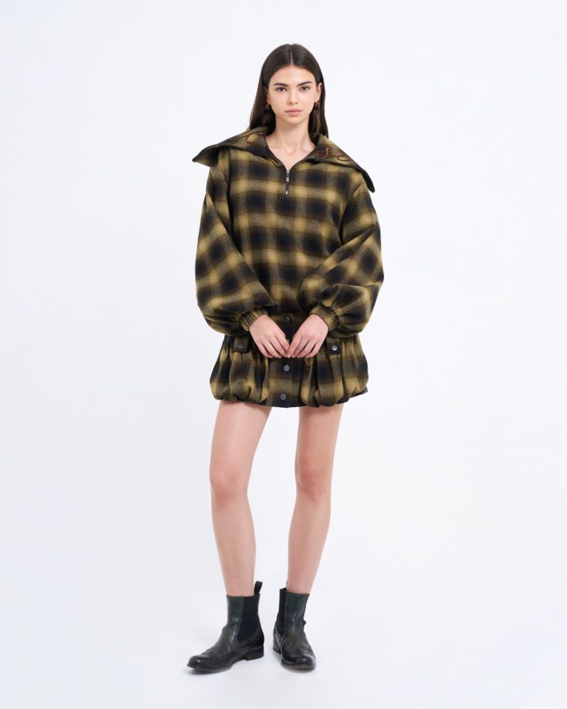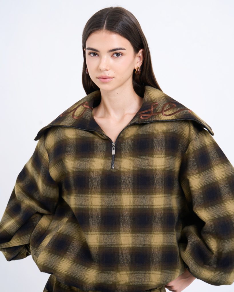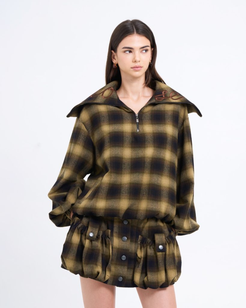 Fit & Detail: An oversized plaid top in earthy tones, delivering a warm yet effortlessly cool vintage vibe. Designed with a front zipper and a hood for a relaxed, stylish finish. The soft fabric and subtly voluminous sleeves add dimension to the silhouette. Easy to pair with the matching skirt or denim for a standout modern–cowboy inspired look.