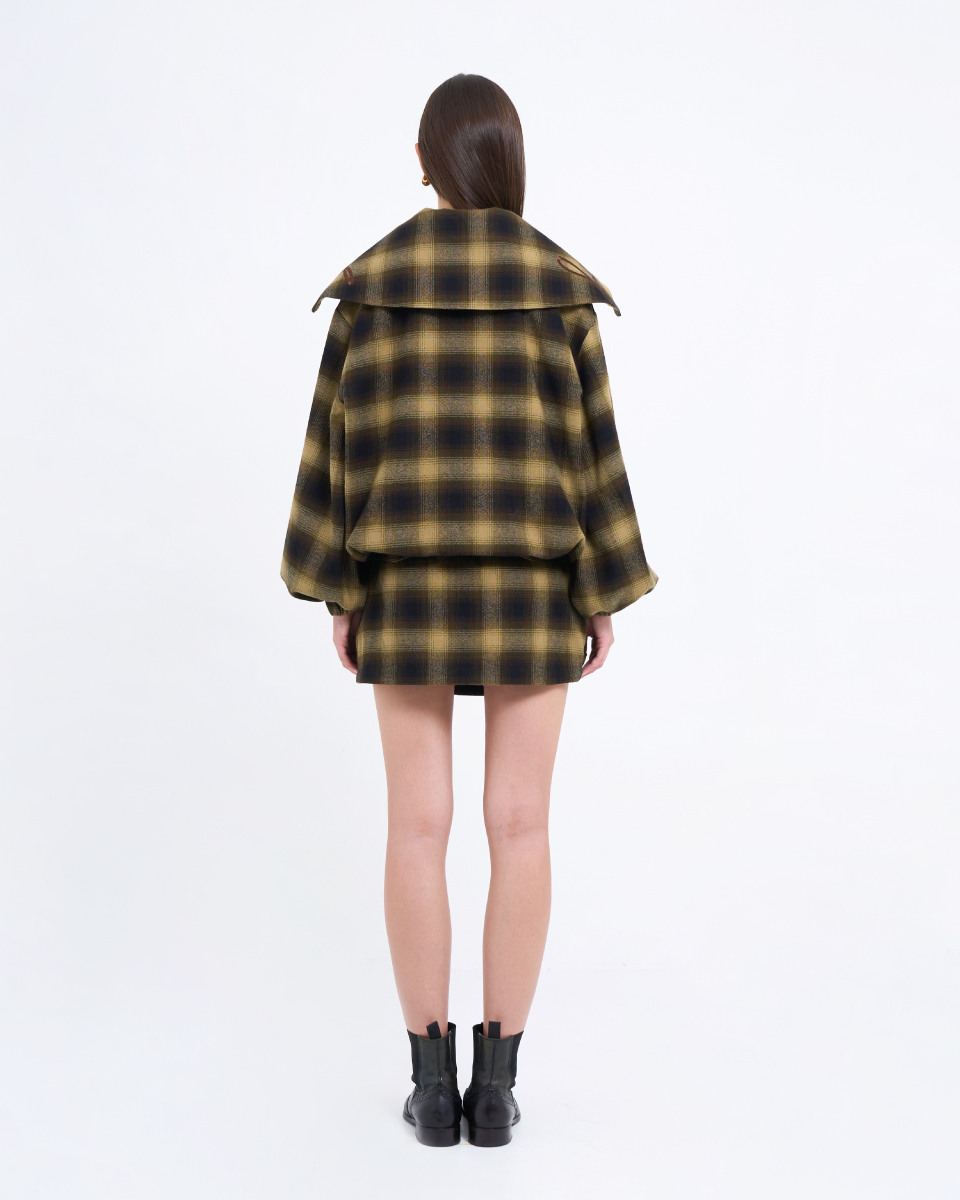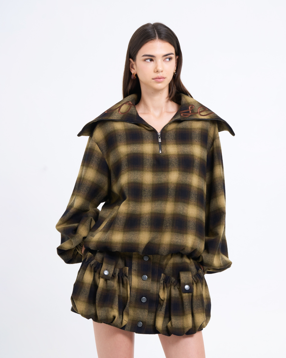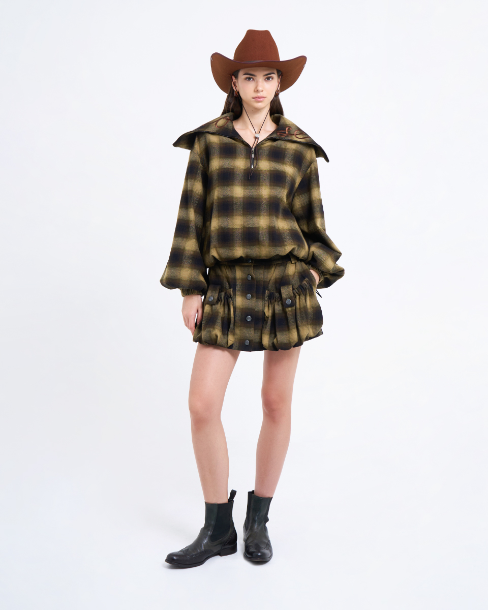 Fit & Detail: An oversized plaid top in earthy tones, delivering a warm yet effortlessly cool vintage vibe. Designed with a front zipper and a hood for a relaxed, stylish finish. The soft fabric and subtly voluminous sleeves add dimension to the silhouette. Easy to pair with the matching skirt or denim for a standout modern–cowboy inspired look.