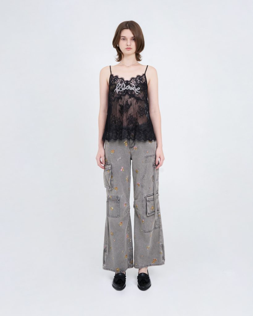 เสื้อสายเดี่ยวแต่งขอบลูกไม้ ดีไซน์หวานละมุน เสริมความหรูหราด้วยดีเทลรีดเพชรเป็นอักษรโลโก้ เพิ่มประกายโดดเด่นอย่างมีระดับ ตัดเย็บจากผ้านุ่มสบาย