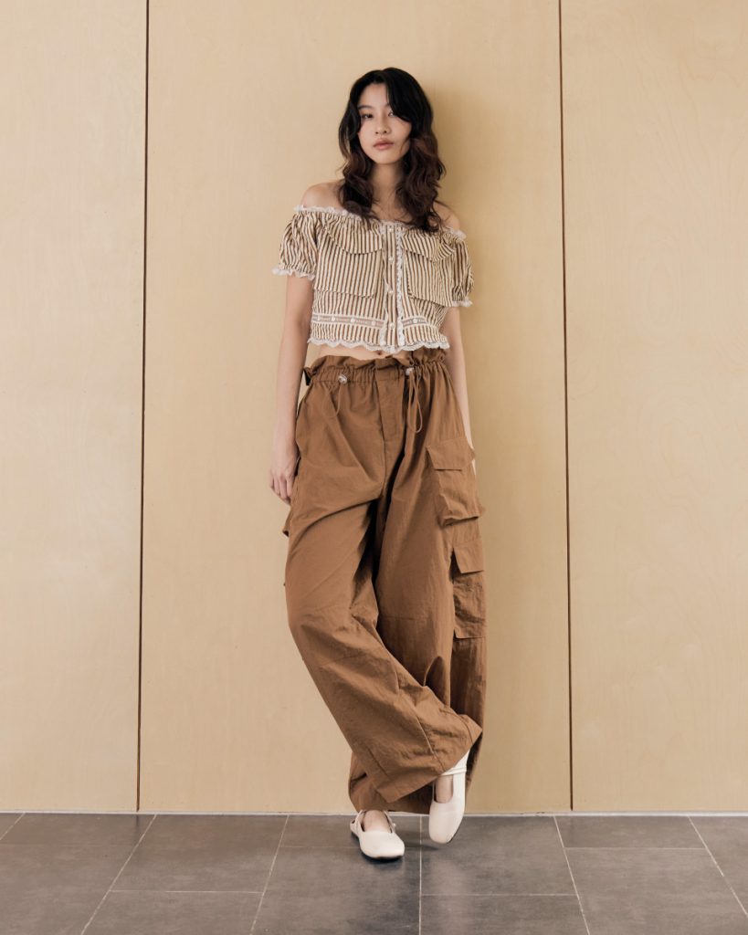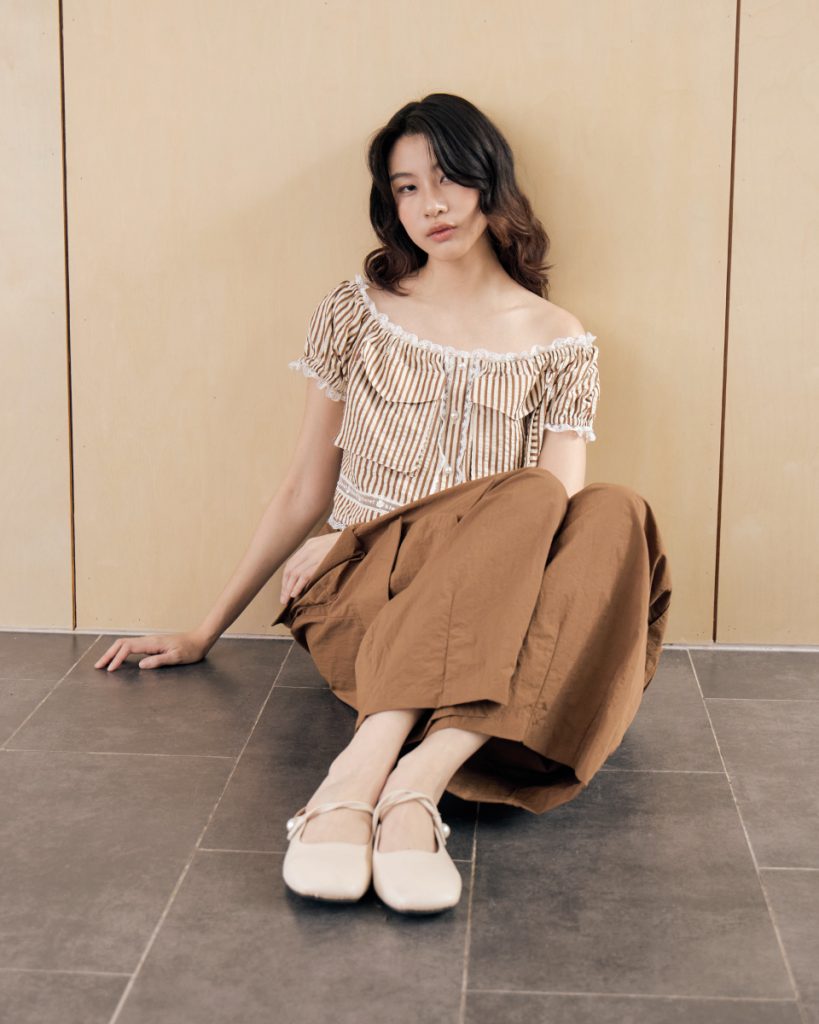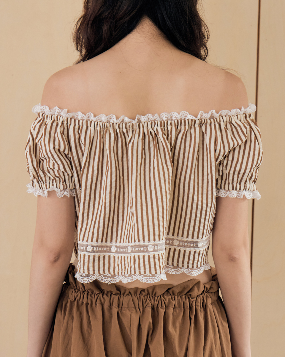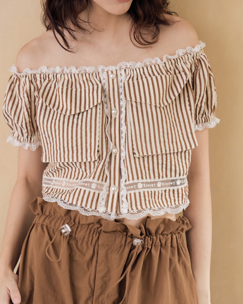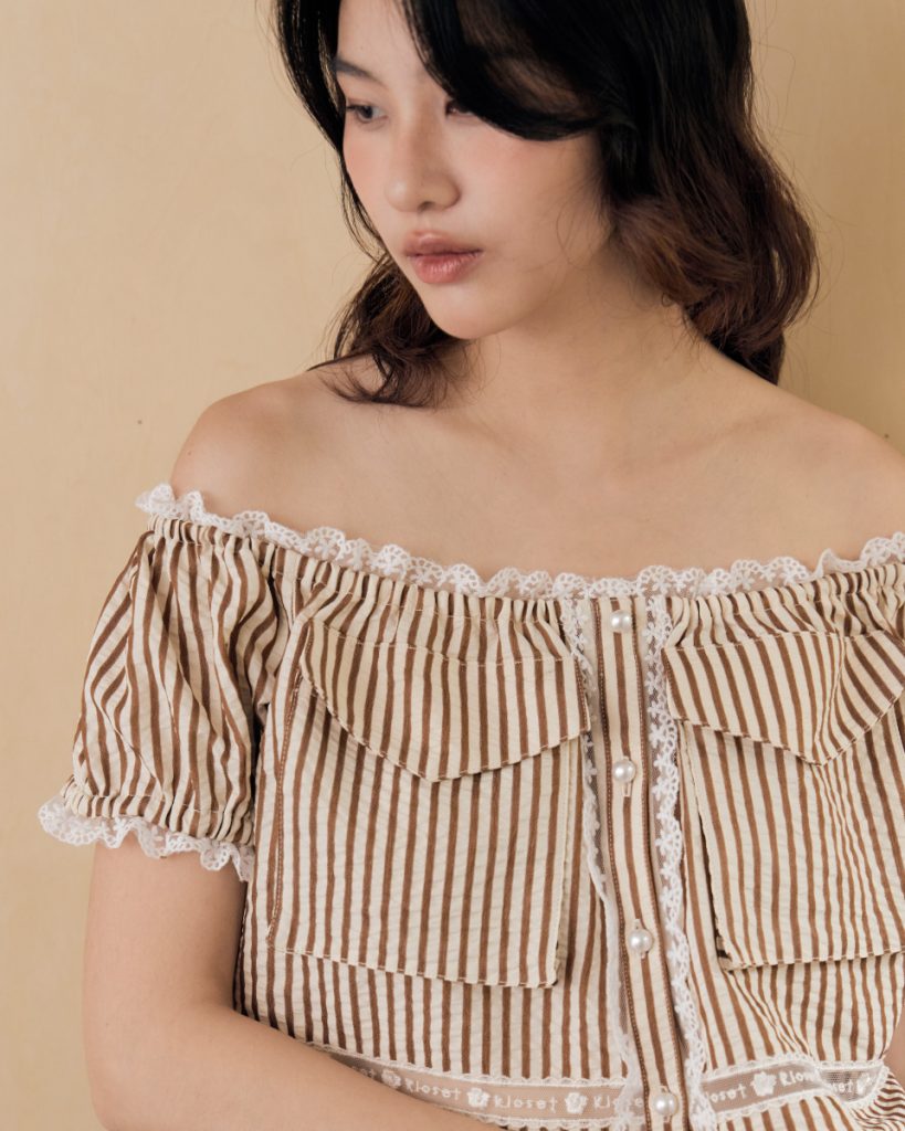 Fit & Detail: A sweet seersucker blouse featuring delicate lace ribbon details around the neckline and sleeves. Made from lightweight, soft, and breathable seersucker fabric for a comfortable and feminine look.