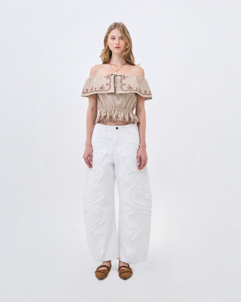 Fit & Detail: Off-shoulder gingham crop top with delicate floral embroidery.