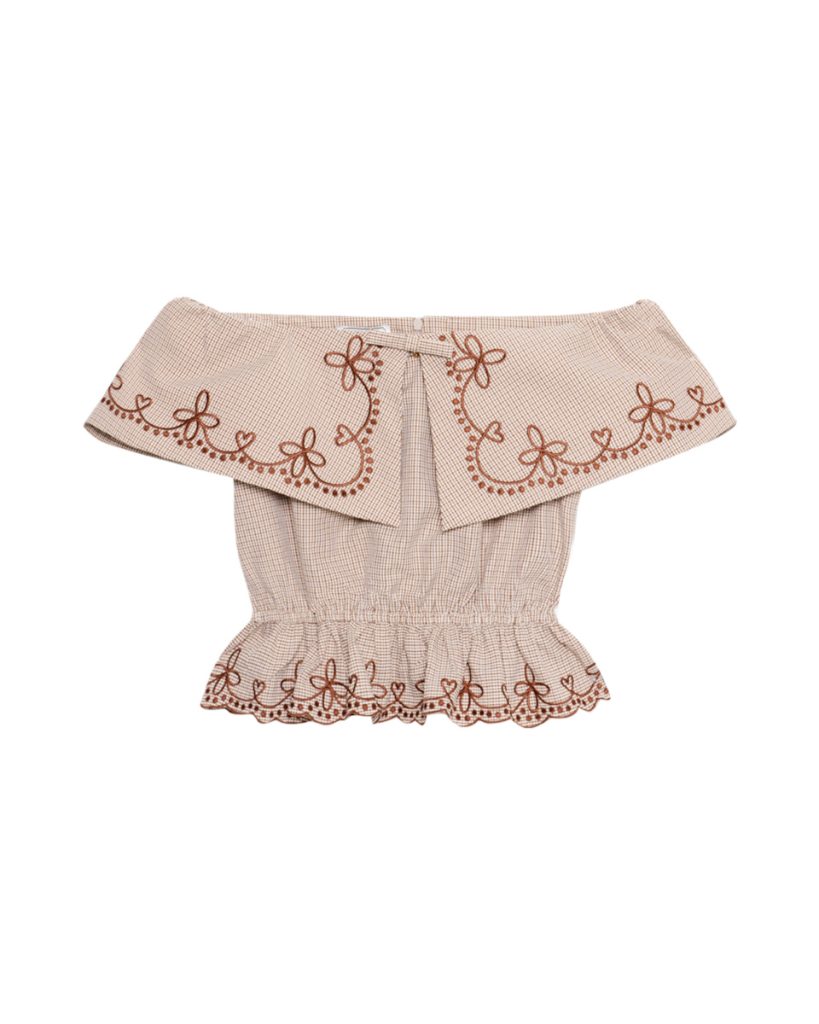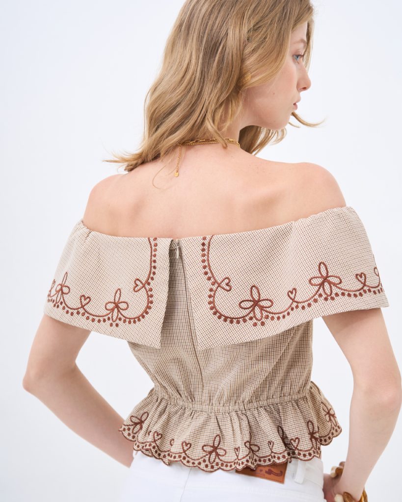 เสื้อครอปเปิดไหล่ลายตาราง ดีไซน์ปักลายดอกไม้ แต่งขอบหยักและเอวยางยืด ให้ลุคหวานละมุน ใส่สบาย ดูน่ารักแบบเฟมินีน