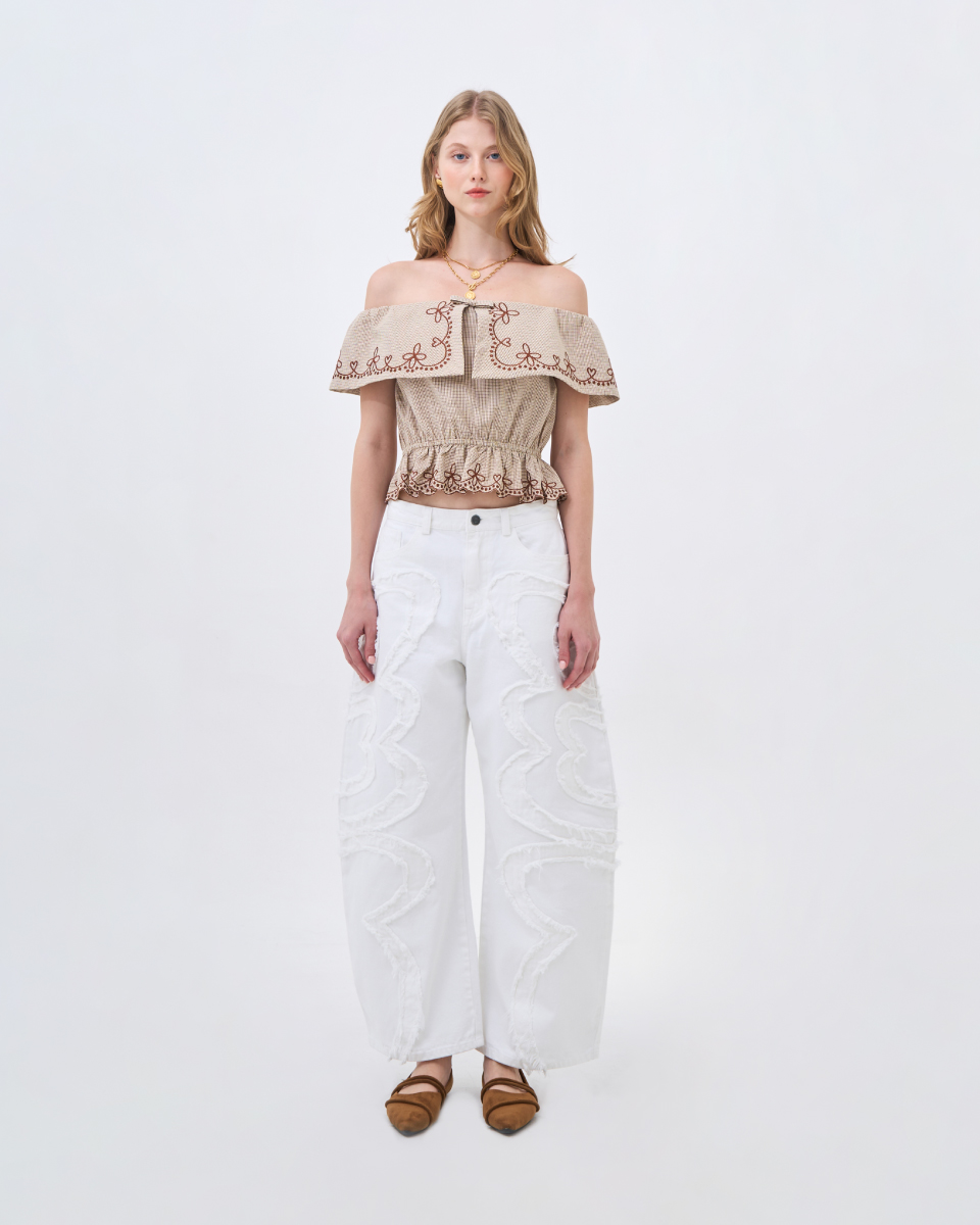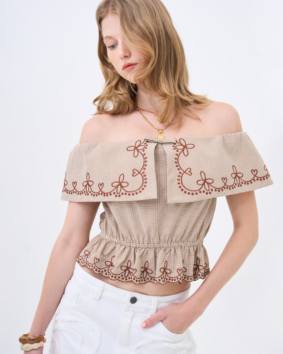 เสื้อครอปเปิดไหล่ลายตาราง ดีไซน์ปักลายดอกไม้ แต่งขอบหยักและเอวยางยืด ให้ลุคหวานละมุน ใส่สบาย ดูน่ารักแบบเฟมินีน