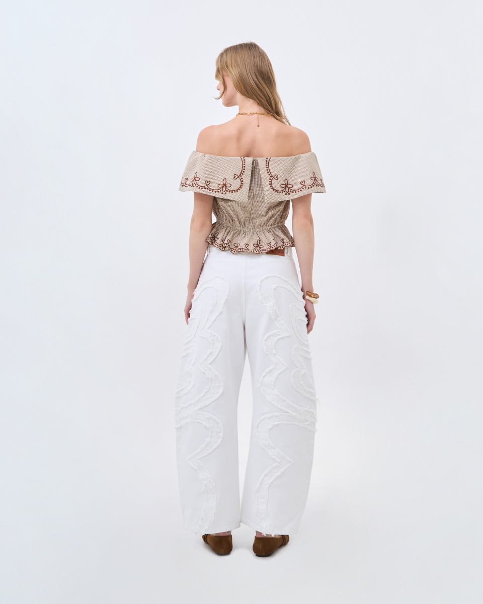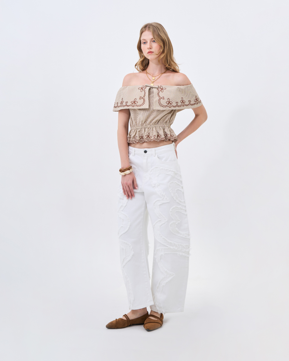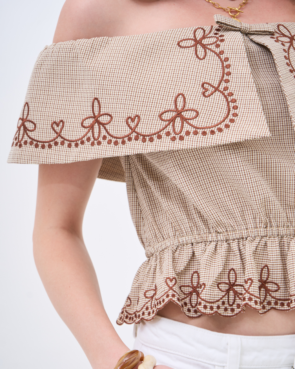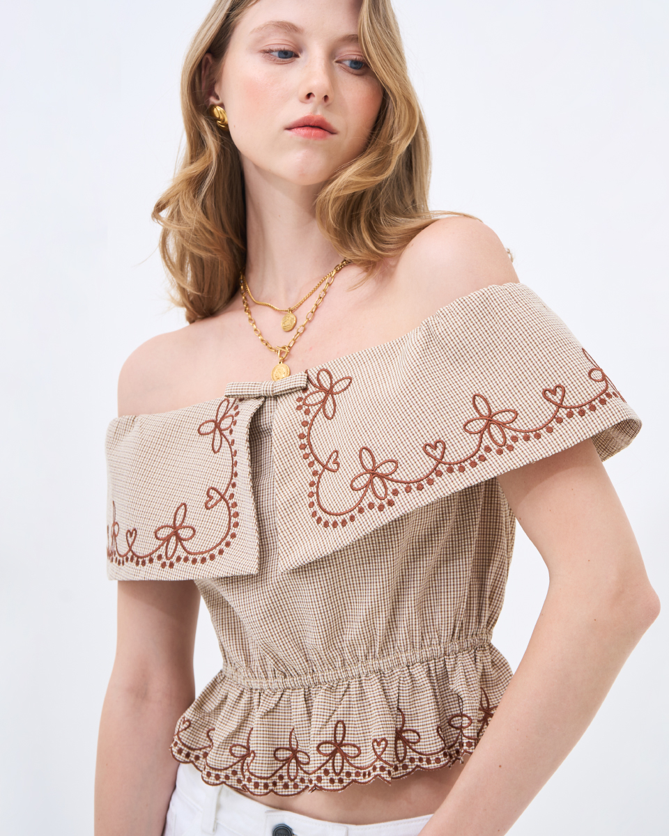 Fit & Detail: Off-shoulder gingham crop top with delicate floral embroidery.