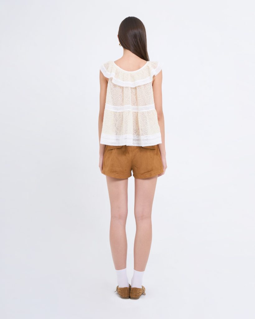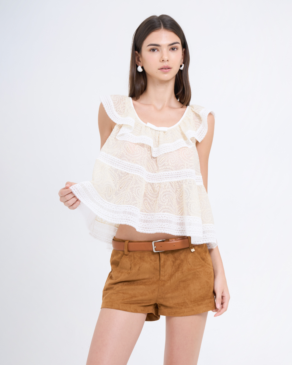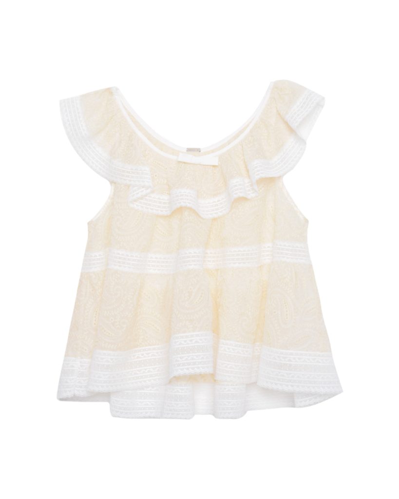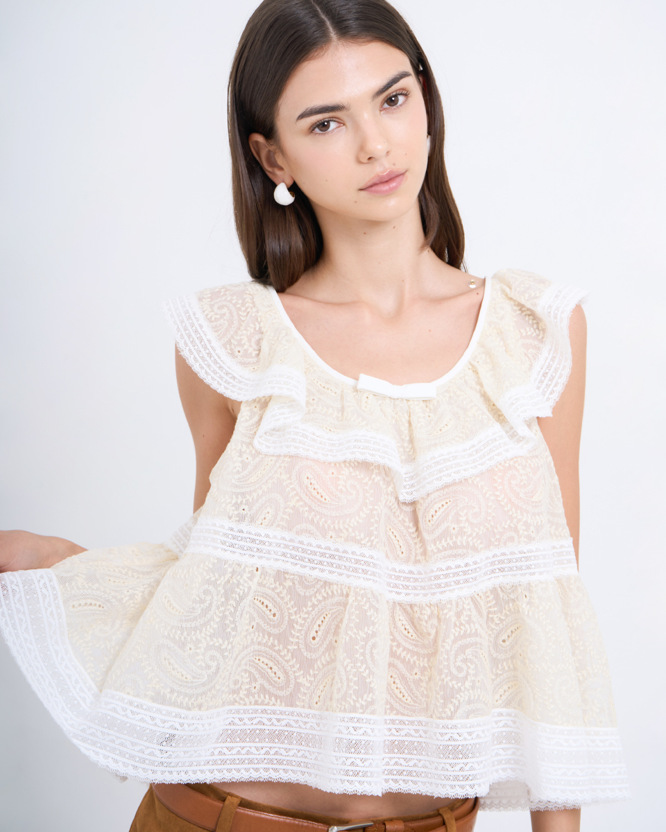 เสื้อแขนกุดดีไซน์หวาน ตัดเย็บจากผ้าลูกไม้โปร่งลายละเอียด โทนสีเหลืองอ่อนแซมขาว ตกแต่งระบายรอบคอและชายเสื้อ เพิ่มมิติให้ลุคดูนุ่มนวล ใส่สบาย ระบายอากาศดี เหมาะสำหรับใส่เดี่ยว ๆ หรือเลเยอร์กับเสื้อคลุมในวันสบาย ๆ