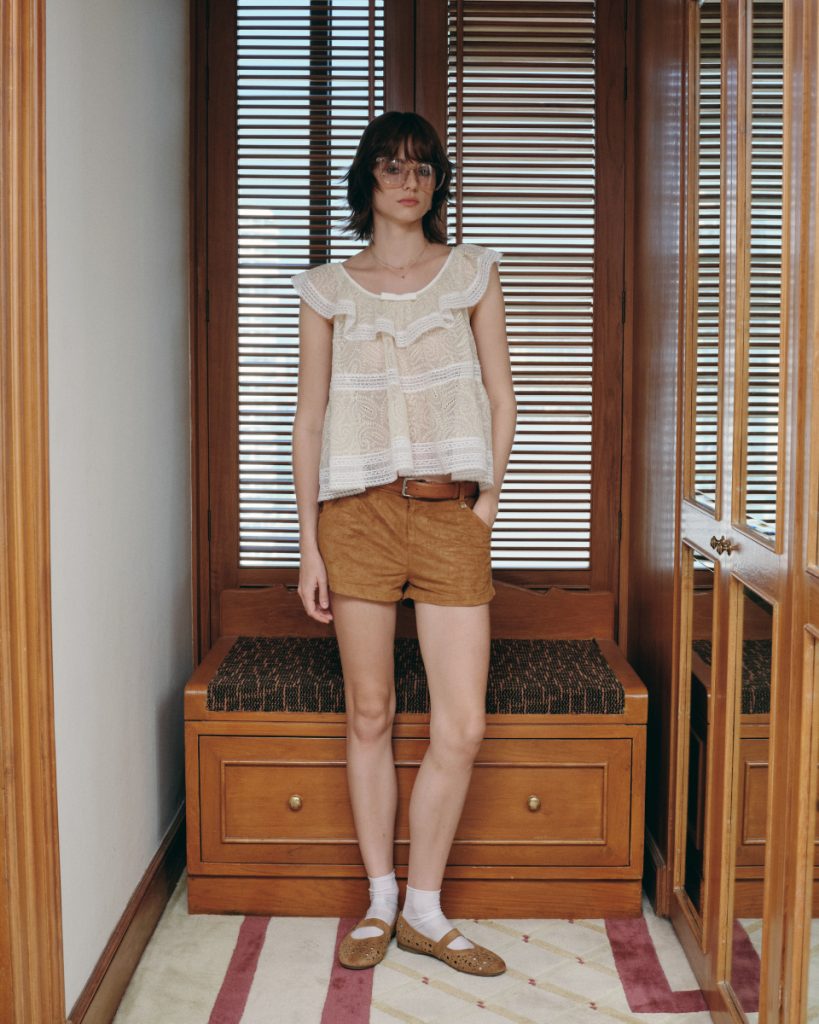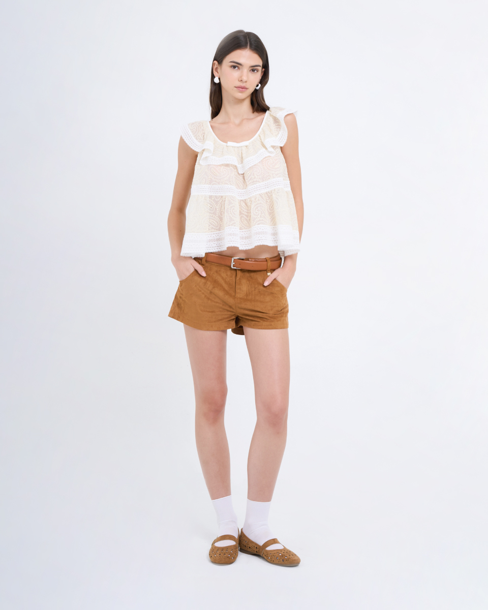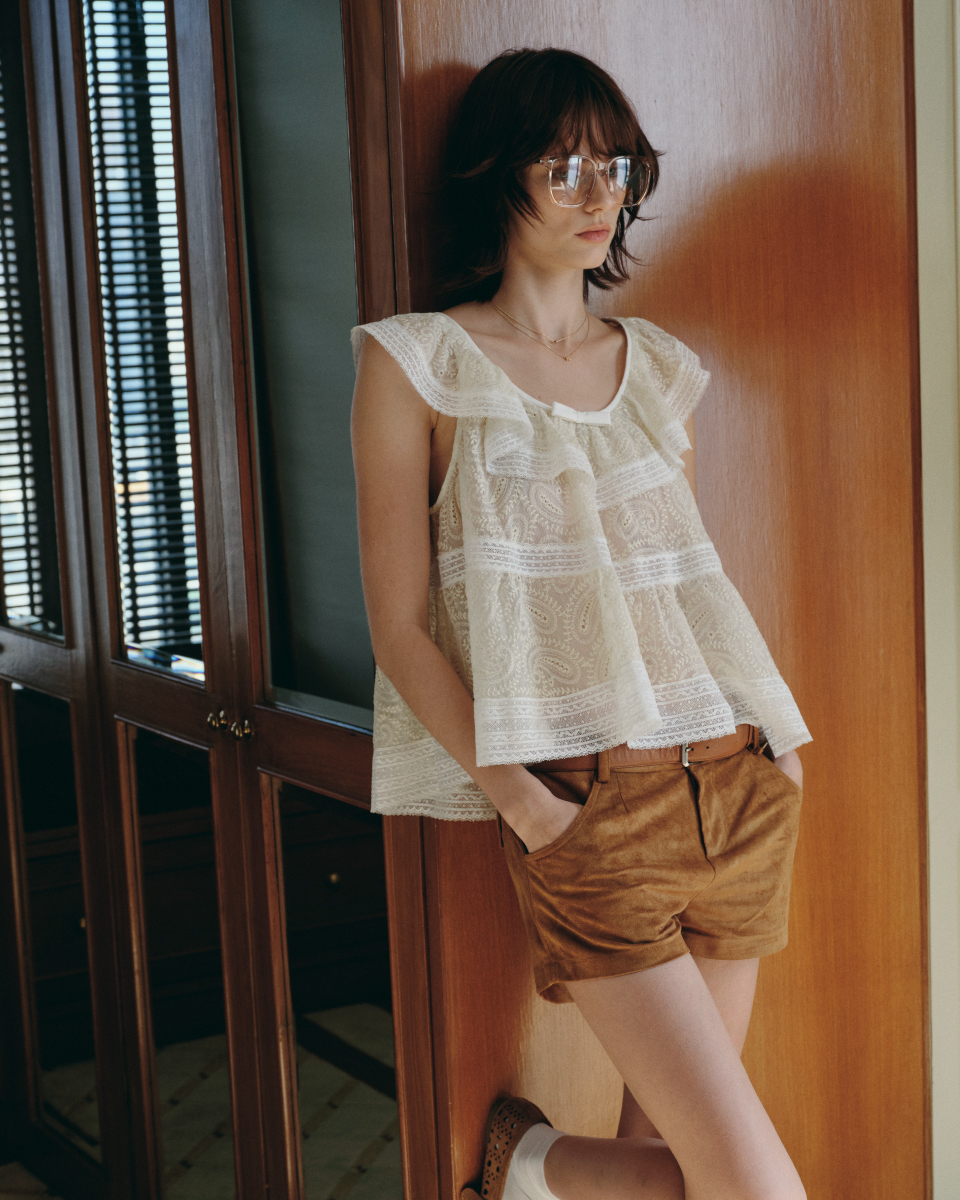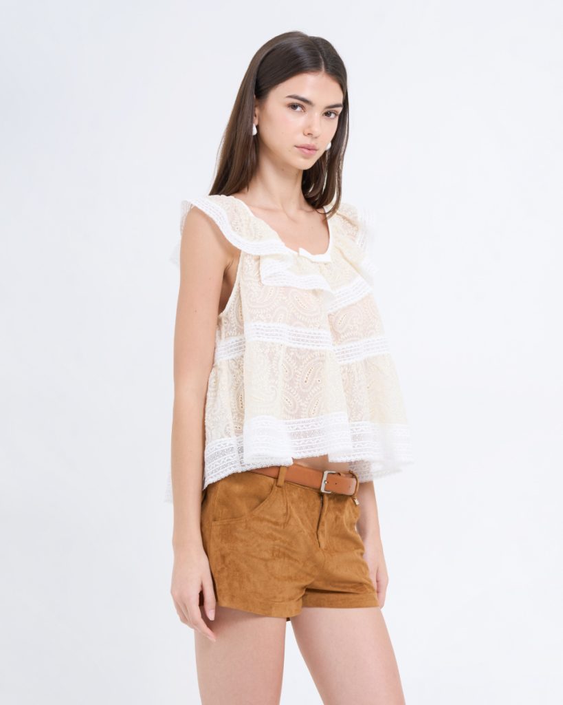 เสื้อแขนกุดดีไซน์หวาน ตัดเย็บจากผ้าลูกไม้โปร่งลายละเอียด โทนสีเหลืองอ่อนแซมขาว ตกแต่งระบายรอบคอและชายเสื้อ เพิ่มมิติให้ลุคดูนุ่มนวล ใส่สบาย ระบายอากาศดี เหมาะสำหรับใส่เดี่ยว ๆ หรือเลเยอร์กับเสื้อคลุมในวันสบาย ๆ
