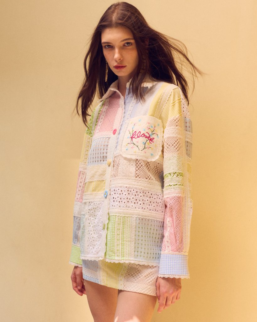 กระโปรงทรงสั้นดีไซน์ Patchwork ผสมผสานผ้าลูกไม้และลายตารางหลากสี ตกแต่งด้วยดีเทลฉลุและลายโปร่ง เพิ่มมิติให้ลุคดูโดดเด่นแต่ยังคงความละมุน ทรงใส่สบาย แมตช์ง่าย เหมาะสำหรับลุคสดใสในวันสบายๆ