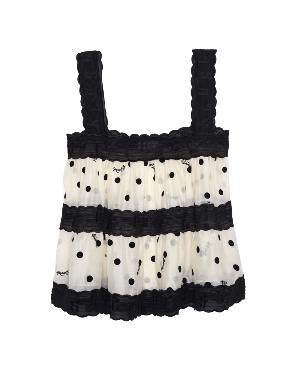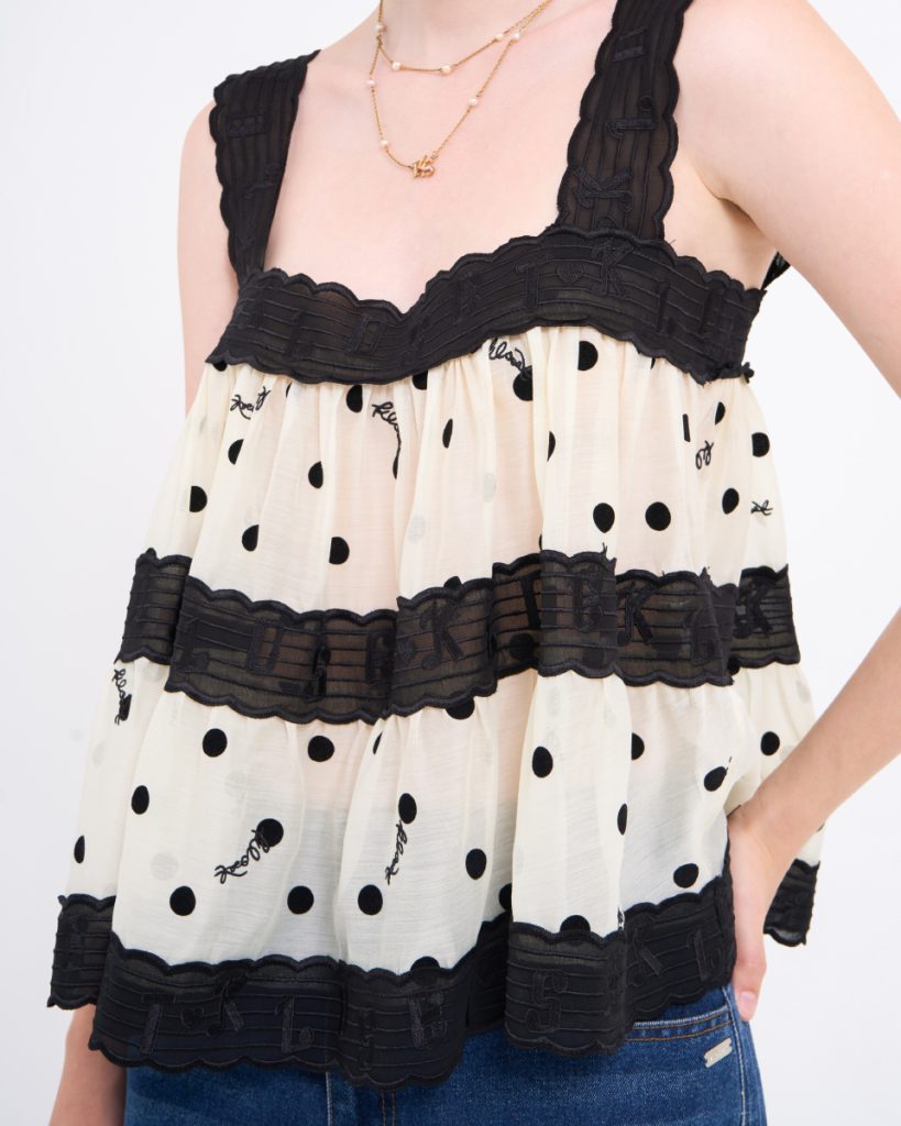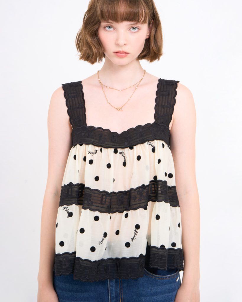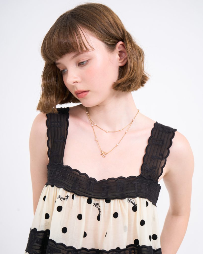 Fit & Detail: Sweet polka-dot chiffon blouse featuring delicate embroidered music tape and logo details. A charming yet polished design that’s easy to wear and effortlessly matches both casual and sophisticated looks.