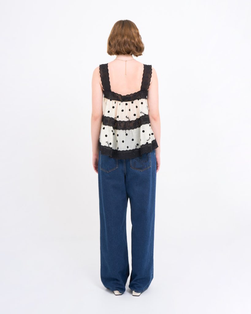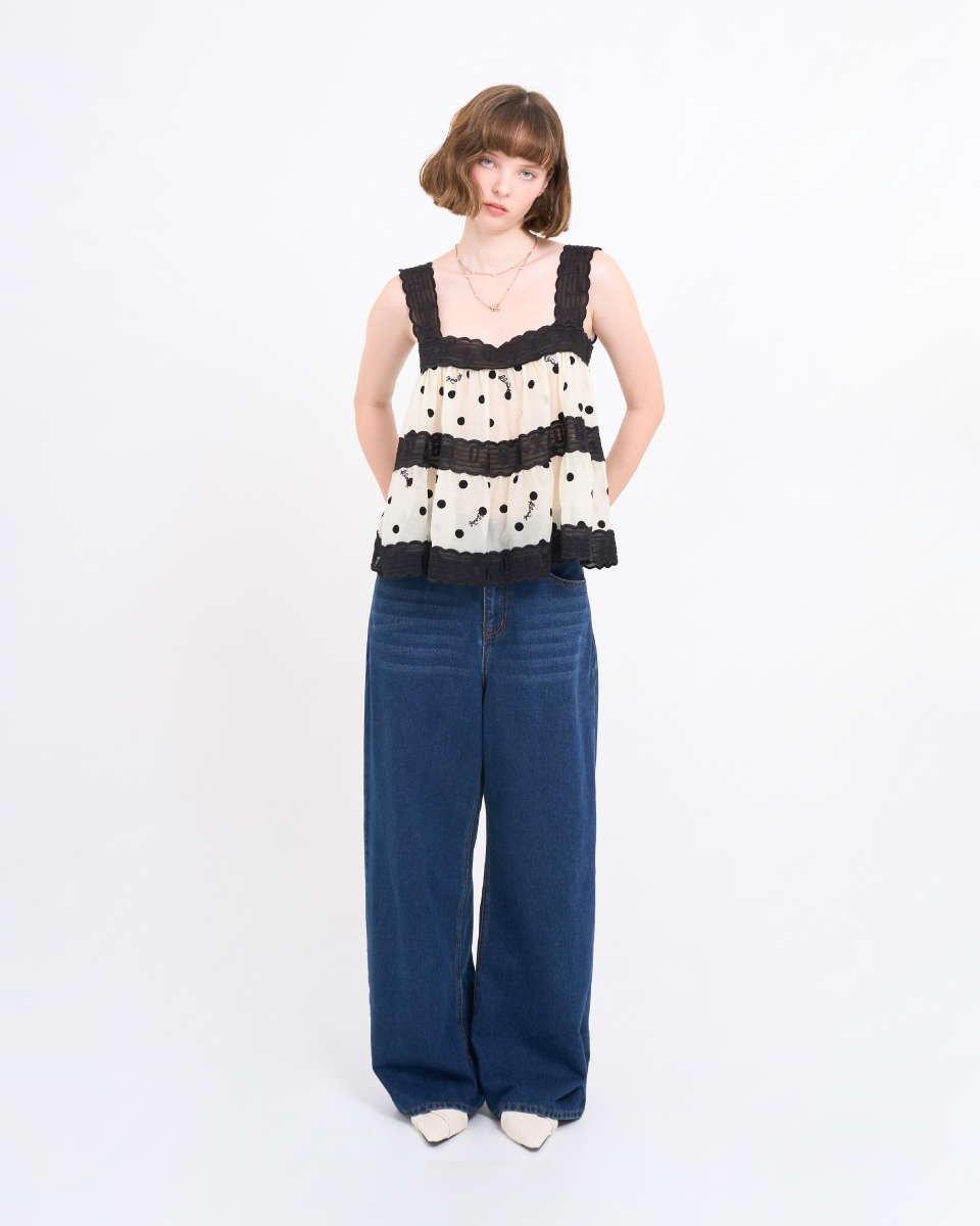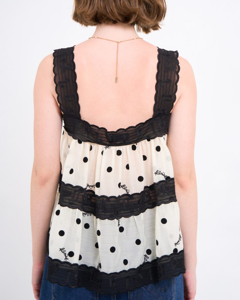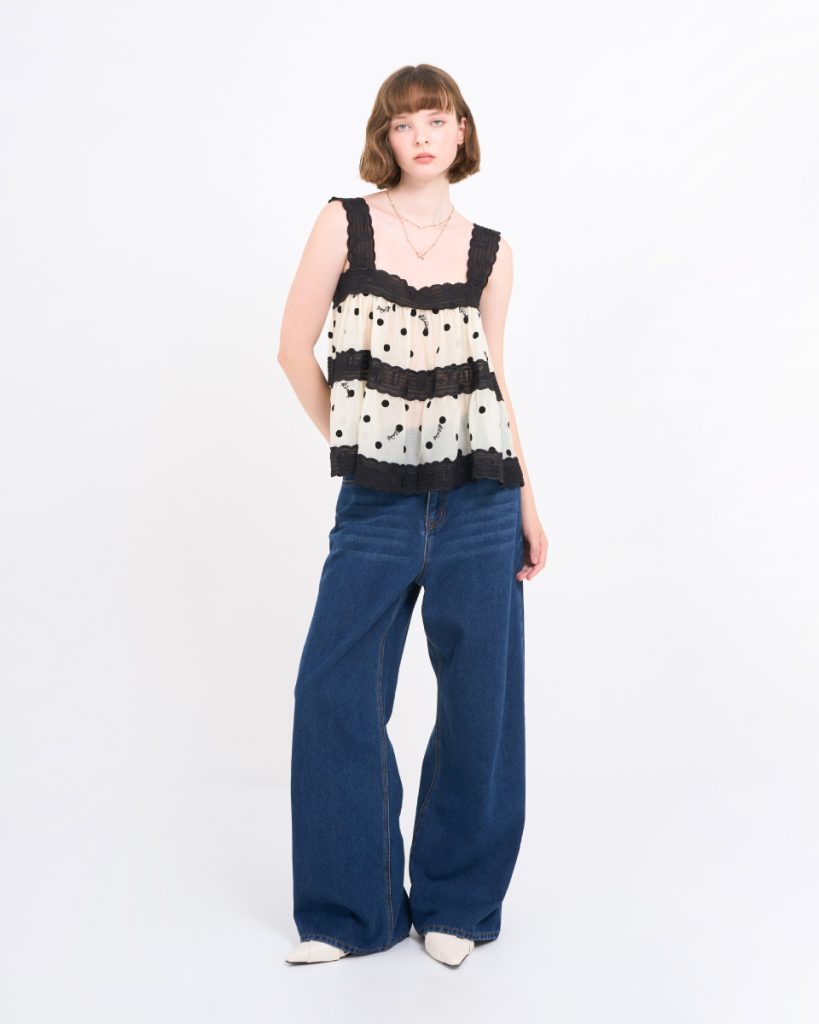 Fit & Detail: Sweet polka-dot chiffon blouse featuring delicate embroidered music tape and logo details. A charming yet polished design that’s easy to wear and effortlessly matches both casual and sophisticated looks.