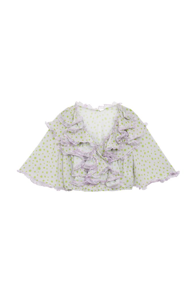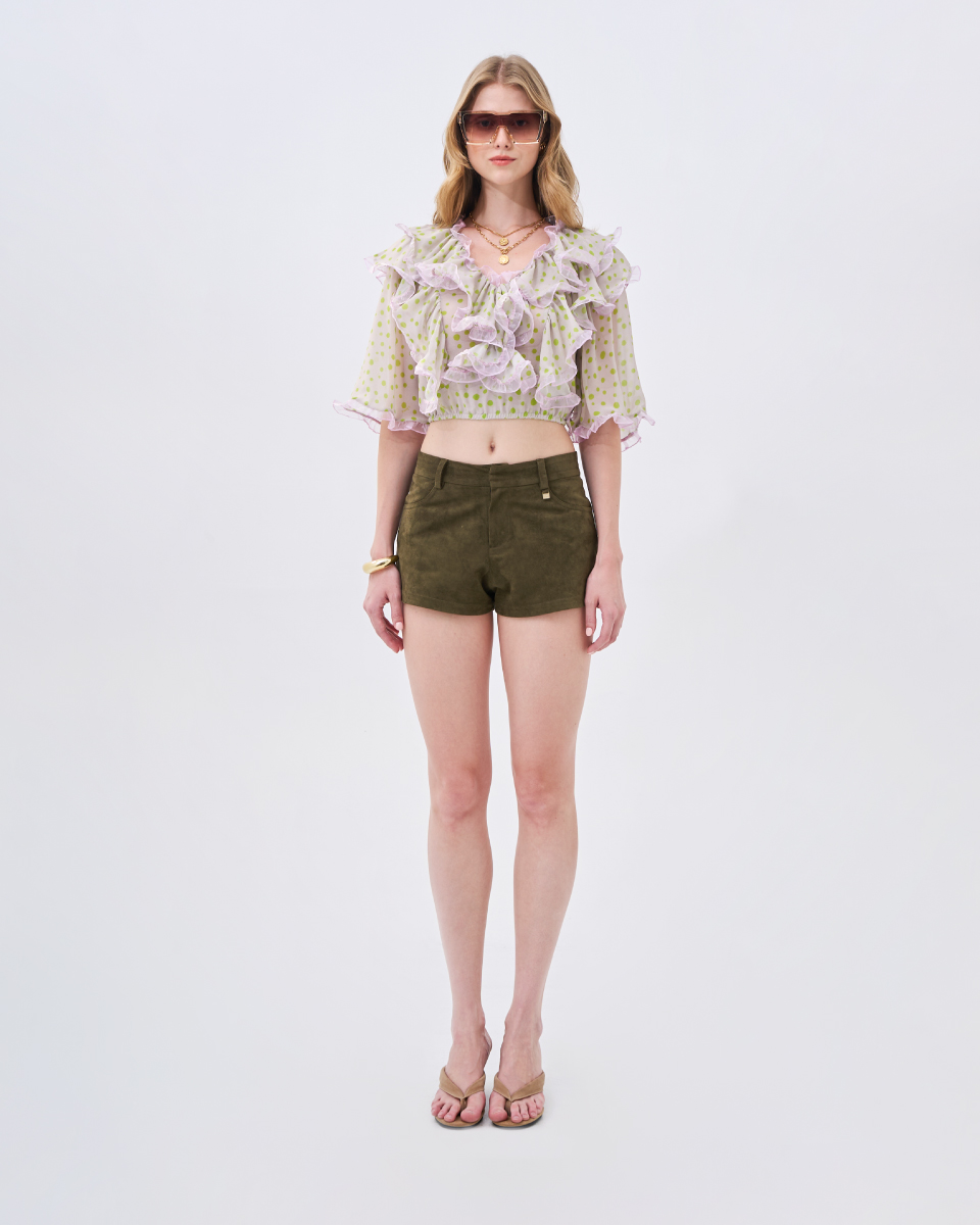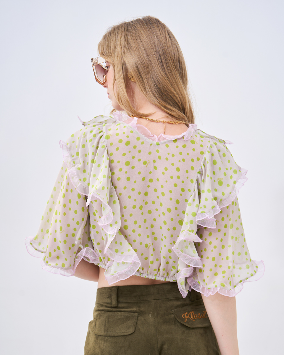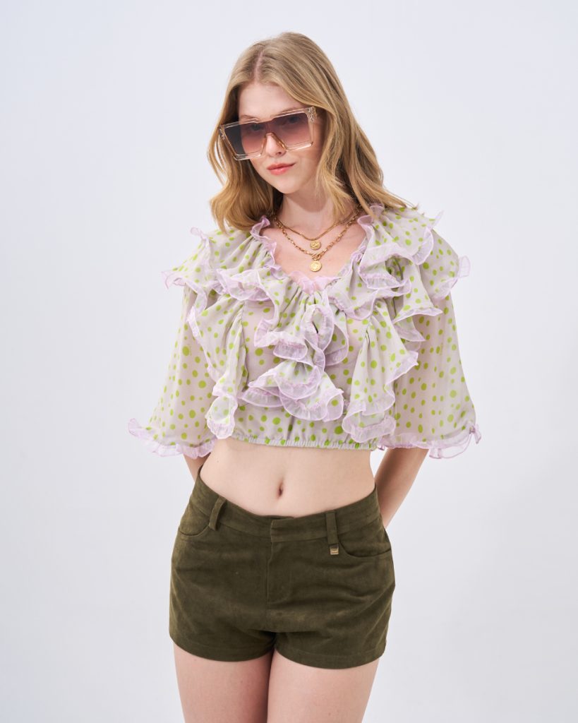 เสื้อชีฟองลายจุดดีไซน์หวาน โดดเด่นด้วยดีเทลระบายซ้อนบริเวณช่วงอกและคอเสื้อ เพิ่มมิติให้ลุคดูอ่อนหวานและมีเสน่ห์ แขนสั้นทรงพลิ้วช่วยให้ลุคดูเบาและโปร่งสบาย เนื้อผ้าบางเบา ใส่สบาย เหมาะสำหรับมิกซ์กับกระโปรงหรือกางเกงเอวสูงได้ทั้งลุควันสบายและลุคพิเศษ