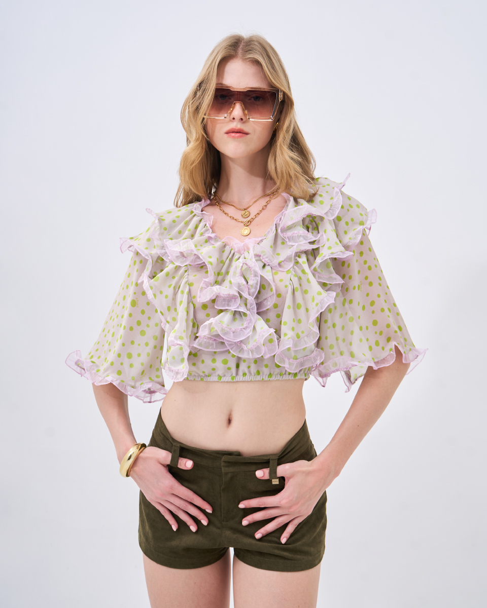 Fit & Detail: A feminine polka-dot chiffon blouse featuring layered ruffle details along the neckline for a soft, romantic touch. Designed with flowy short sleeves and lightweight fabric for an airy, comfortable feel. Perfect for pairing with high-waisted skirts or pants for both casual and dressed-up looks.