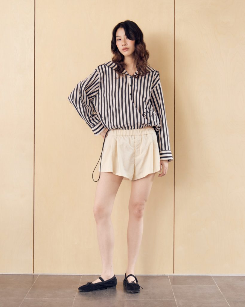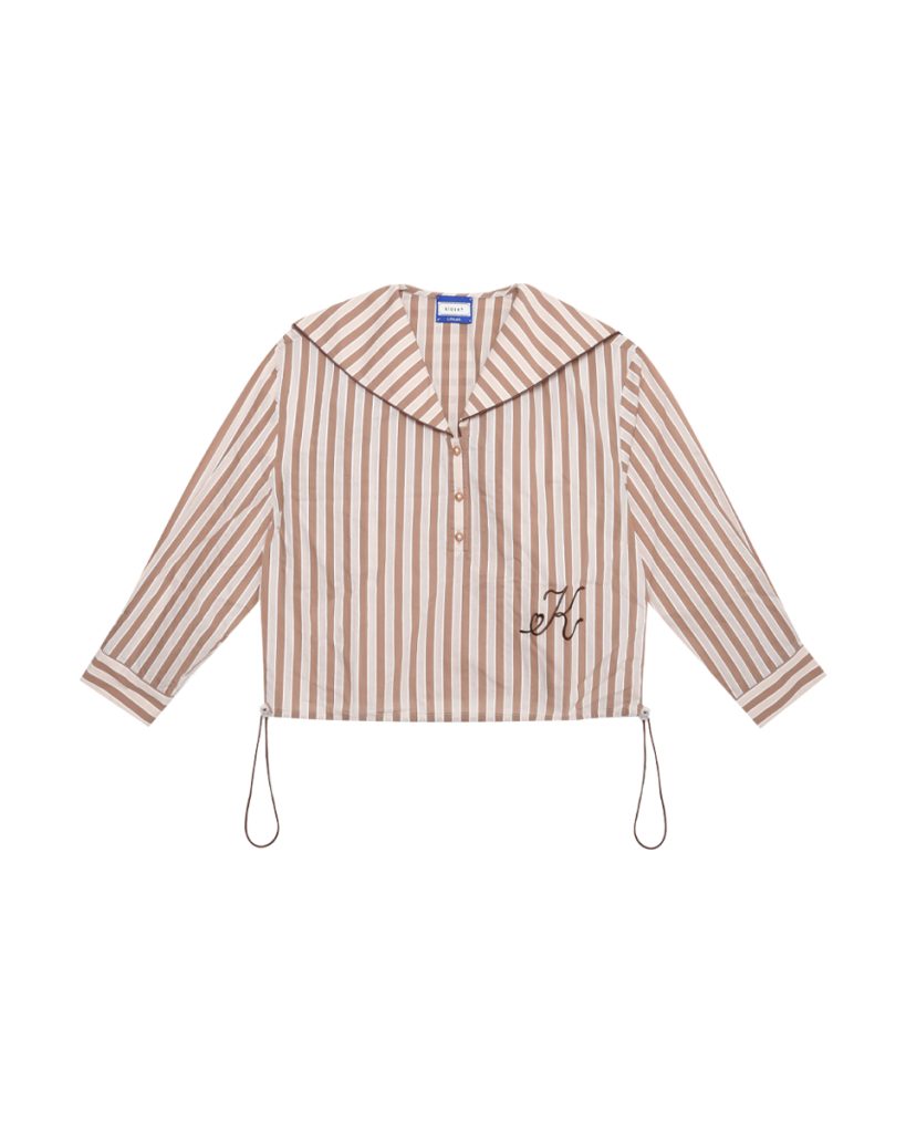 Fit & Detail: A vintage-inspired striped blouse with a sweet sailor collar, blending cuteness and elegance in Kloset’s signature style.