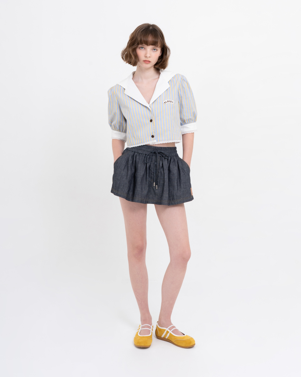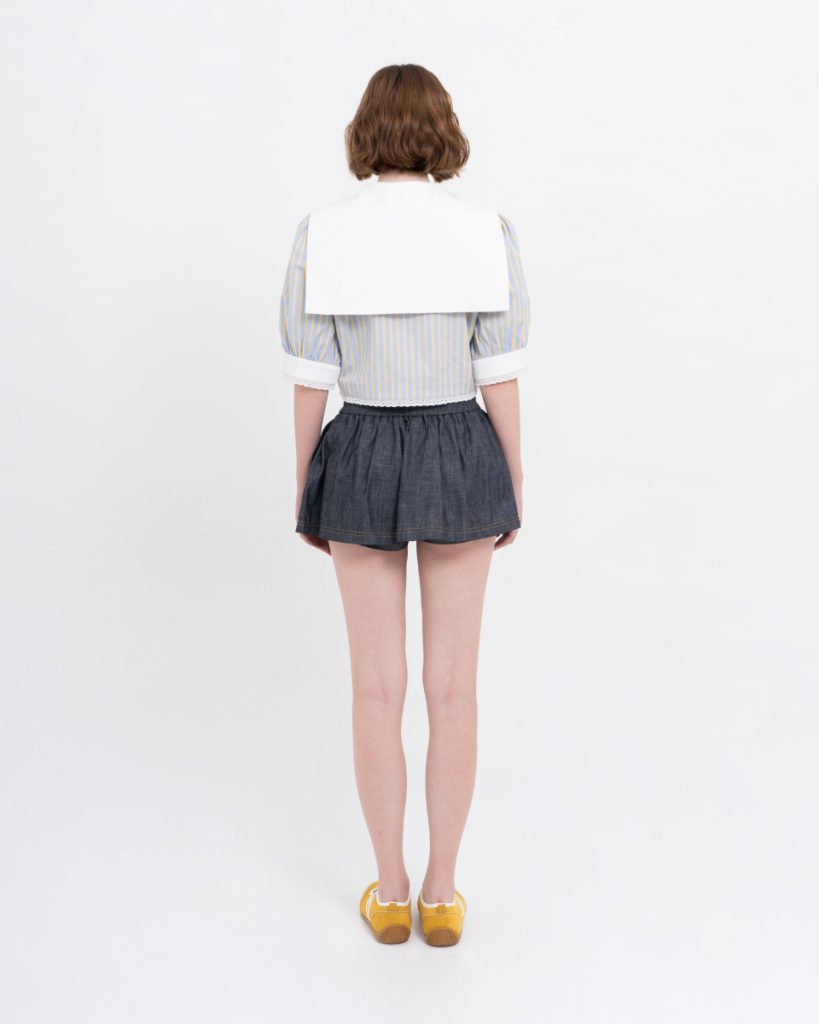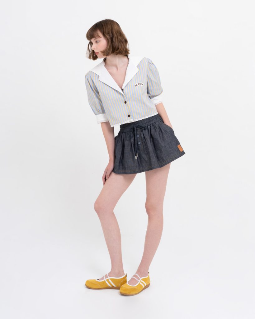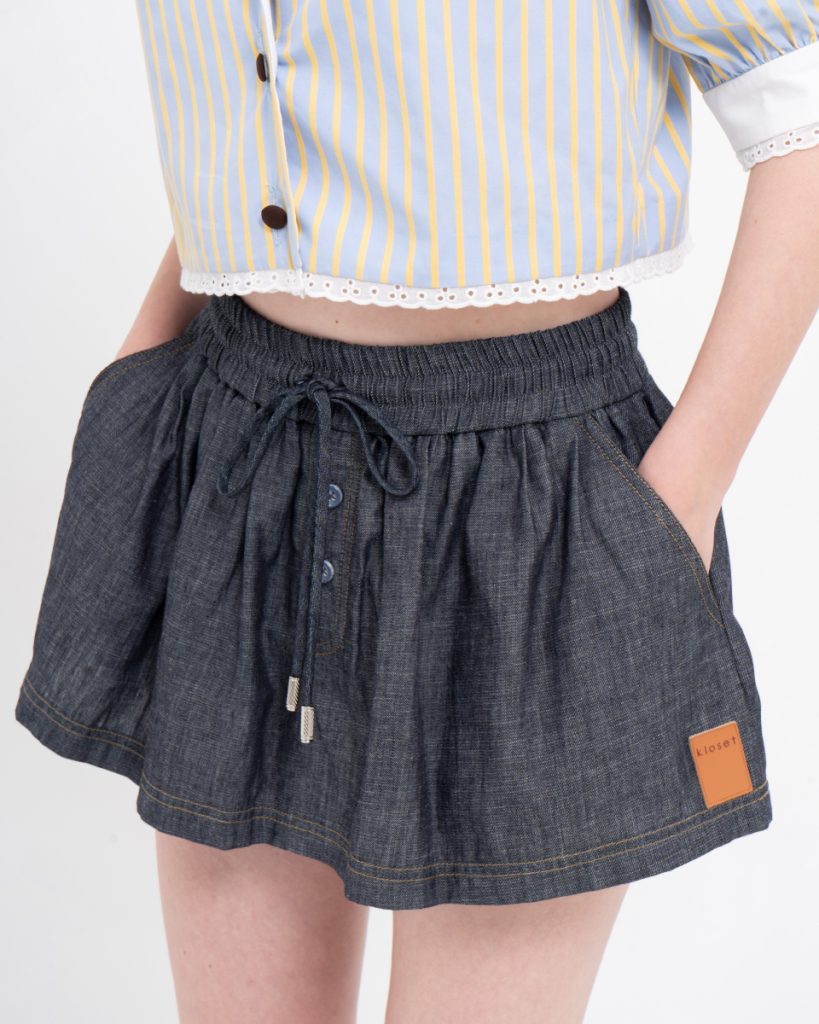 กระโปรงมินิสเกิร์ตดีไซน์ด้านในเป็นกางเกง (skort) พร้อมเอวยางยืดให้ความกระชับและใส่สบาย ทรงกระโปรงบานเพิ่มความคล่องตัวและลุคสดใส