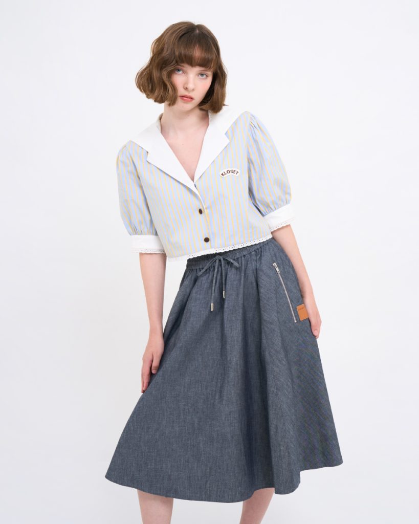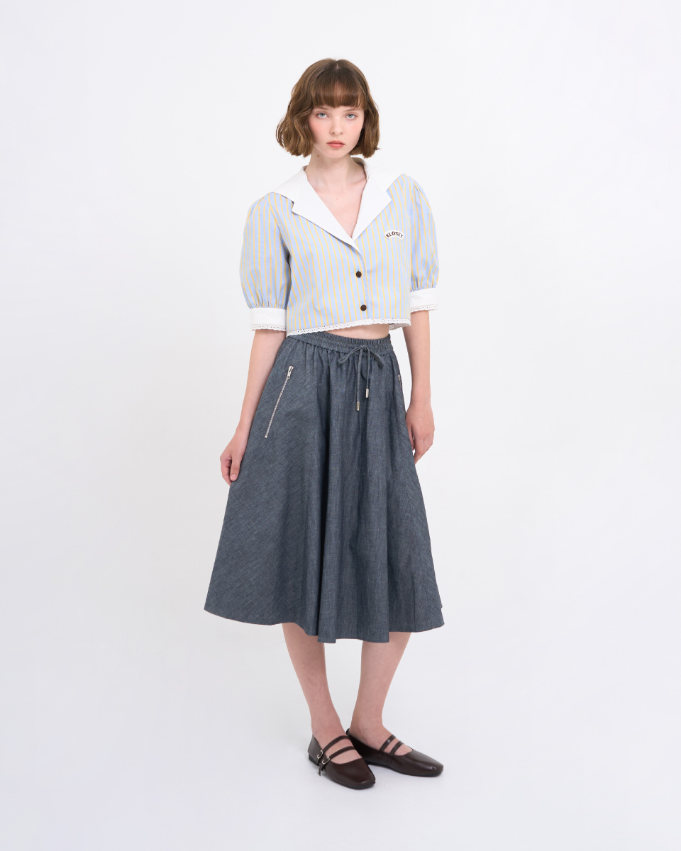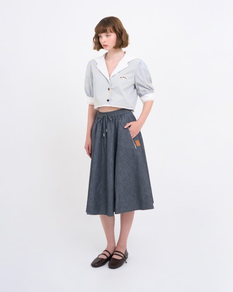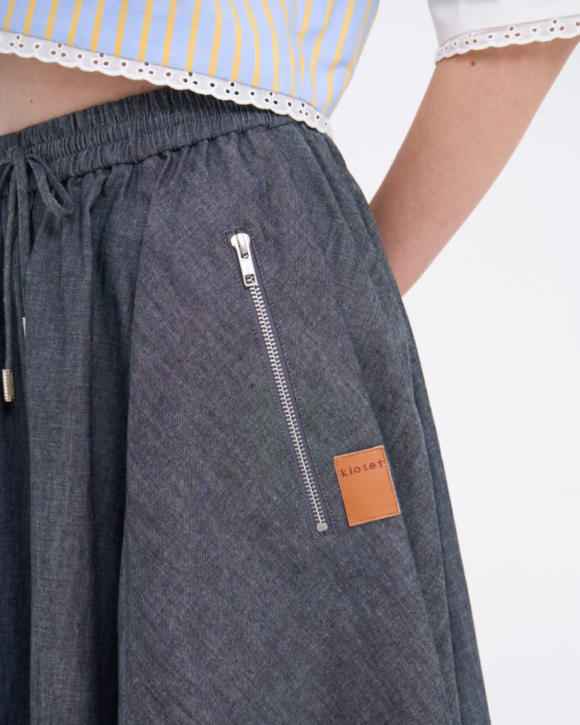 กระโปรงยีนส์ผ้านุ่มบาง ทรงบานสุ่ม ใส่สบาย สะโพกฟรีไซต์ พร้อมยางยืดรอบเอวและกระเป๋าข้าง เพิ่มความคล่องตัว เหมาะทั้งวันทำงานและวันสบาย ๆ