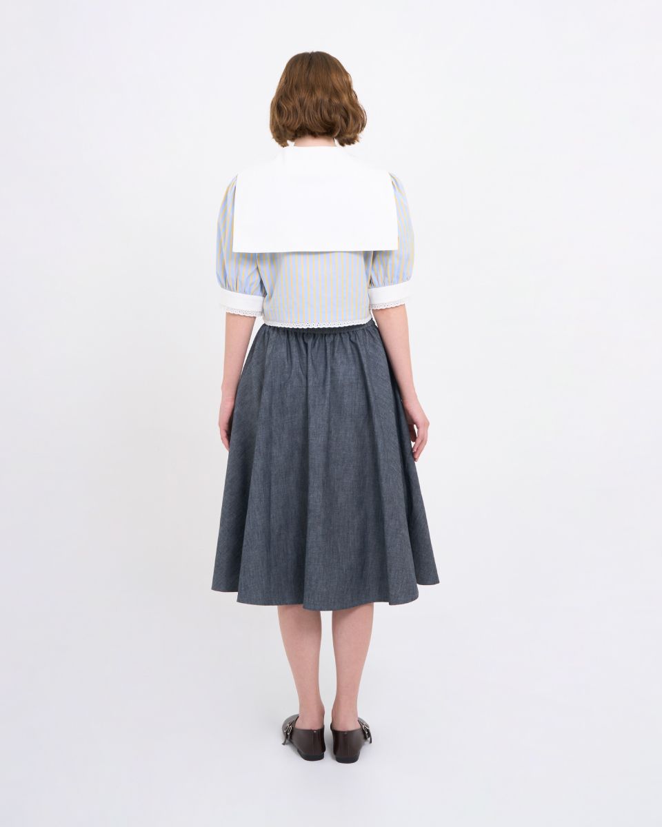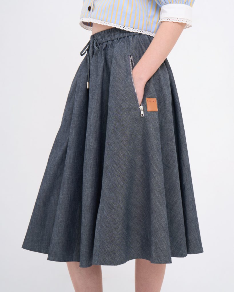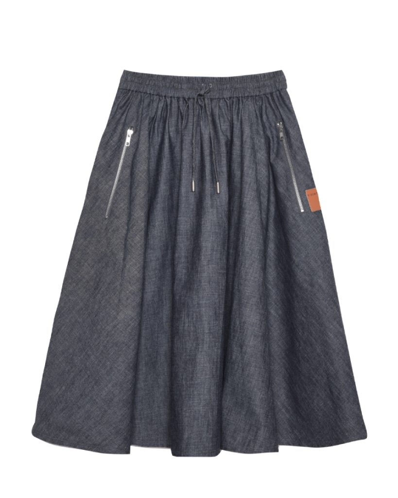 Soft lightweight denim flared skirt with a free-hip design, elastic waistband, and side pockets for added practicality. Comfortable and stylish for everyday wear.