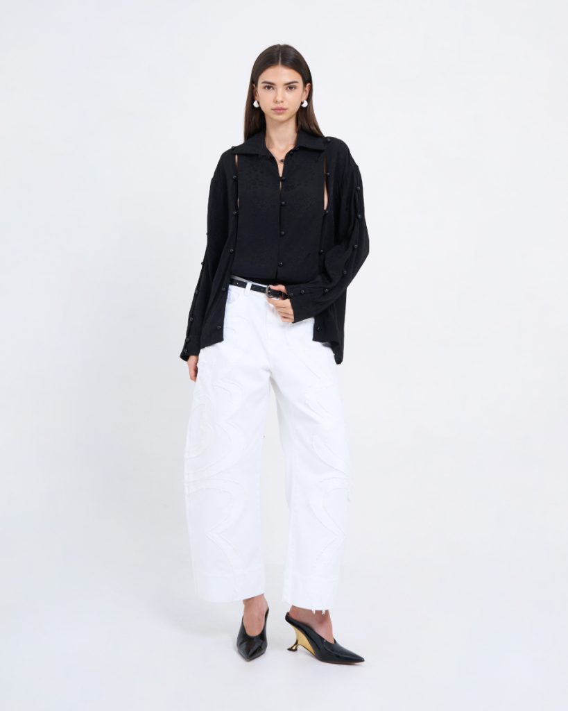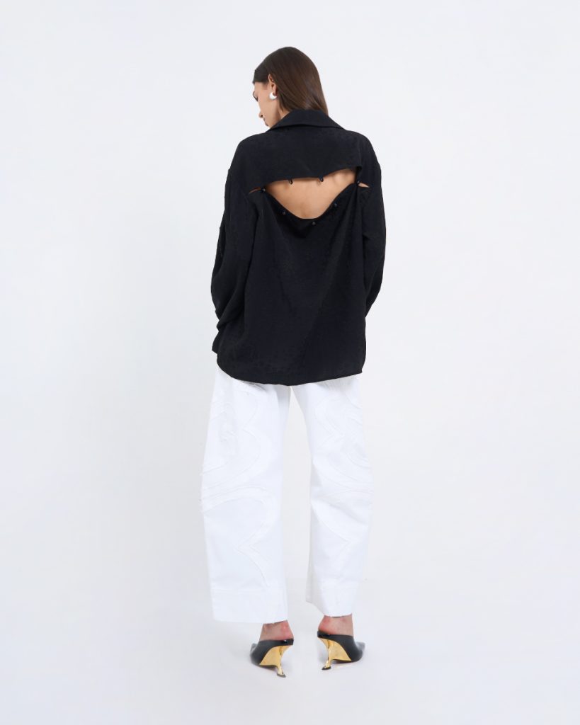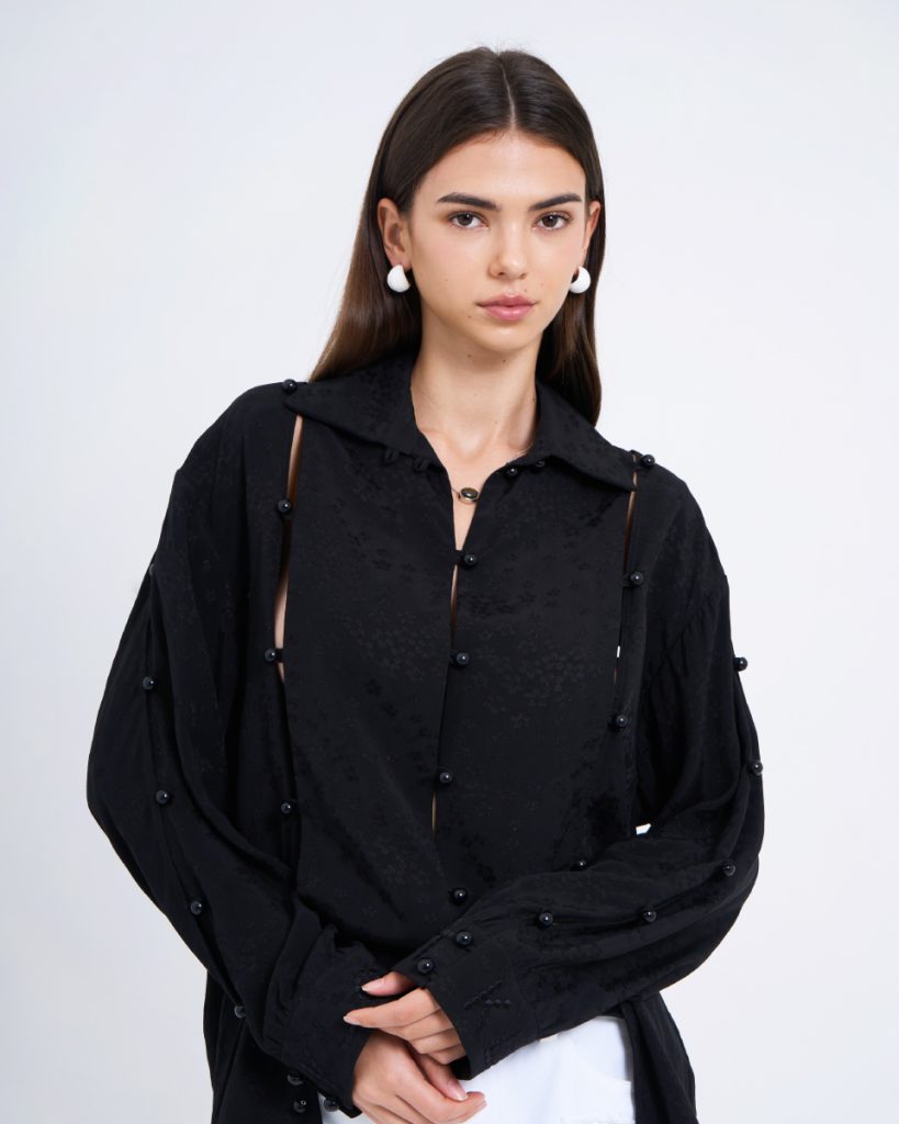 Fit & Detail: An oversized modern shirt crafted from lightweight textured fabric. Designed with versatile button details that allow you to style and transform the look in multiple ways. Finished with logo embroidery at the cuffs for a unique, signature touch.