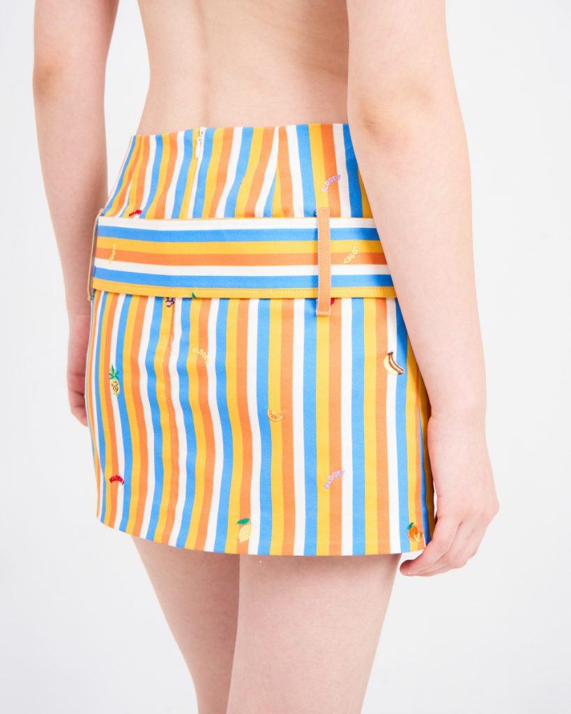 Fit & Detail: A breezy printed skirt adorned with tiny fruit embroidery, bringing a playful and cheerful charm to your look. The contrast waistband adds a stylish twist, creating a flattering and fun silhouette.