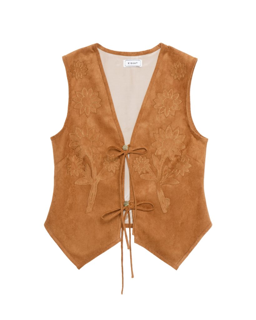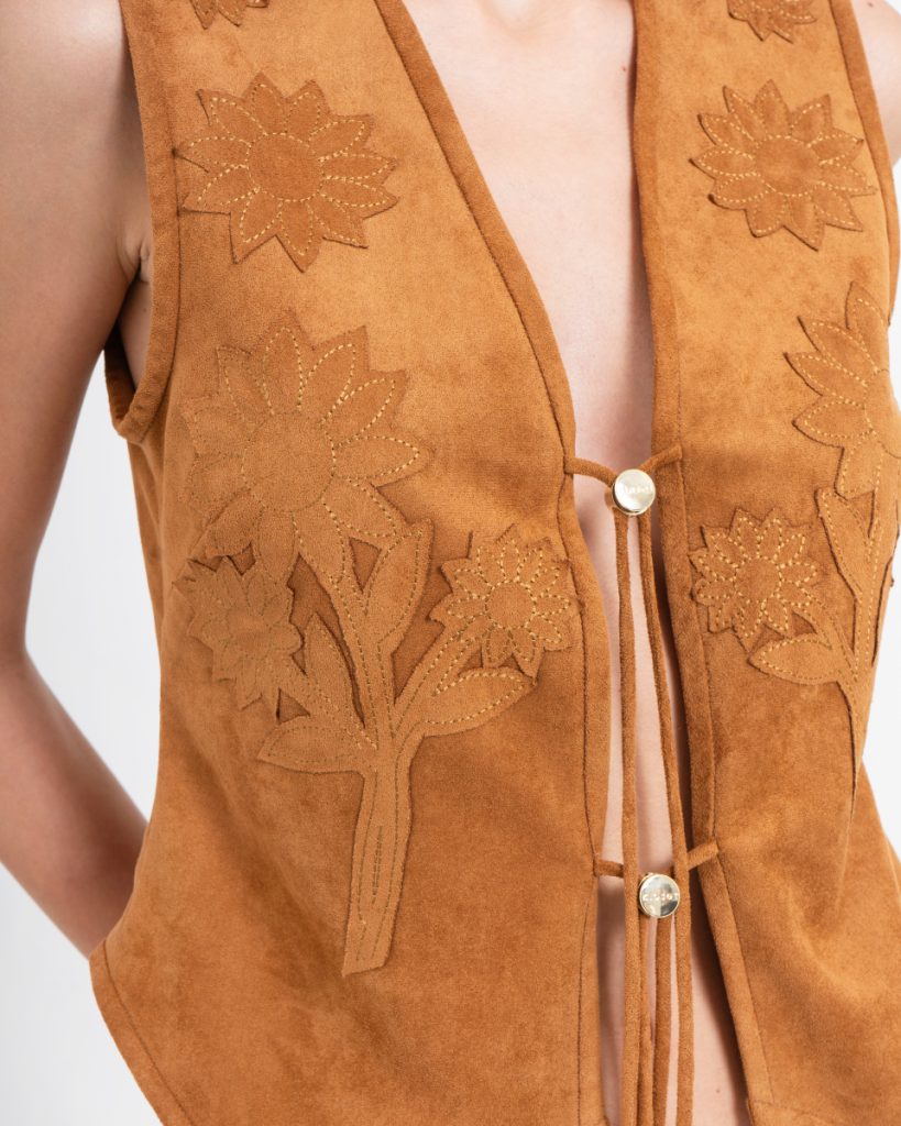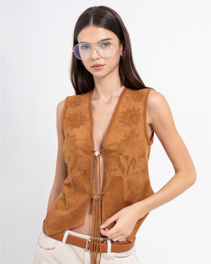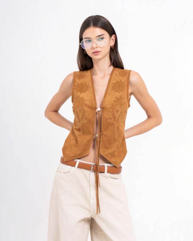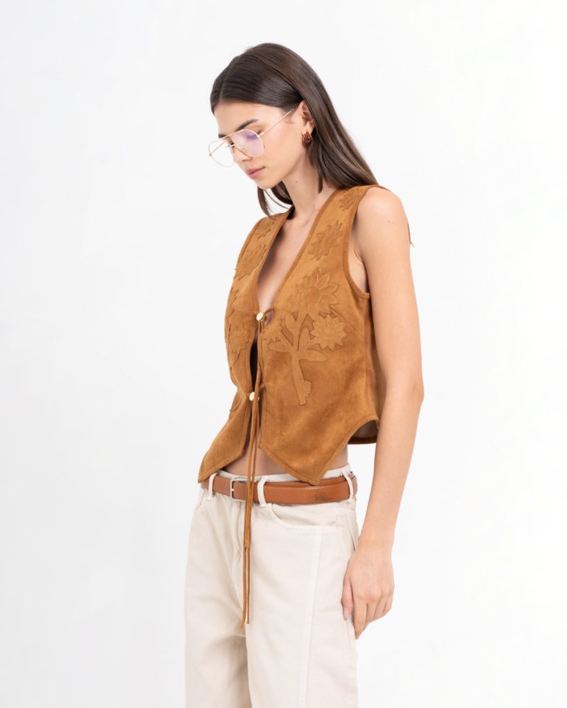 เสื้อกั๊กดีไซน์โบฮีเมียน โทนสีน้ำตาล ออกแบบด้วยงานปักลายดอกไม้ เพิ่มเสน่ห์แบบแฮนด์คราฟต์ ด้านหน้าผูกเชือกให้ลุควินเทจร่วมสมัย ผลิตจากผ้าหนังเทียมเนื้อนุ่ม ทรงพอดีตัว