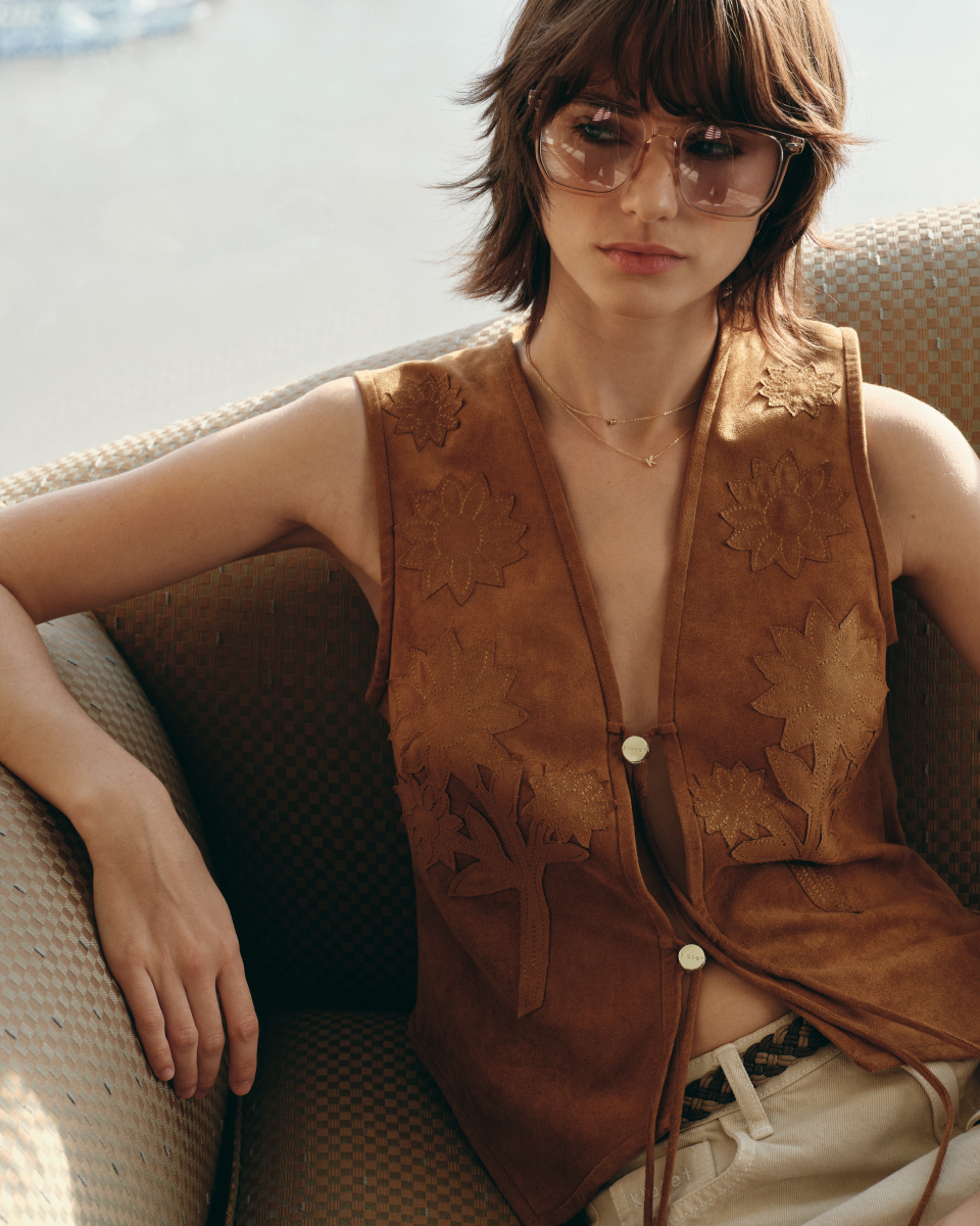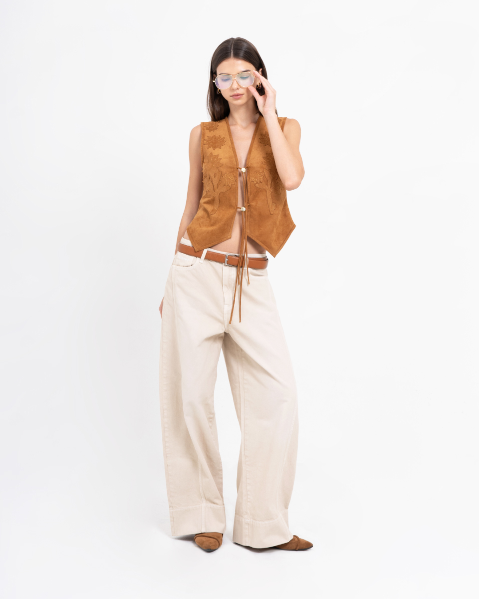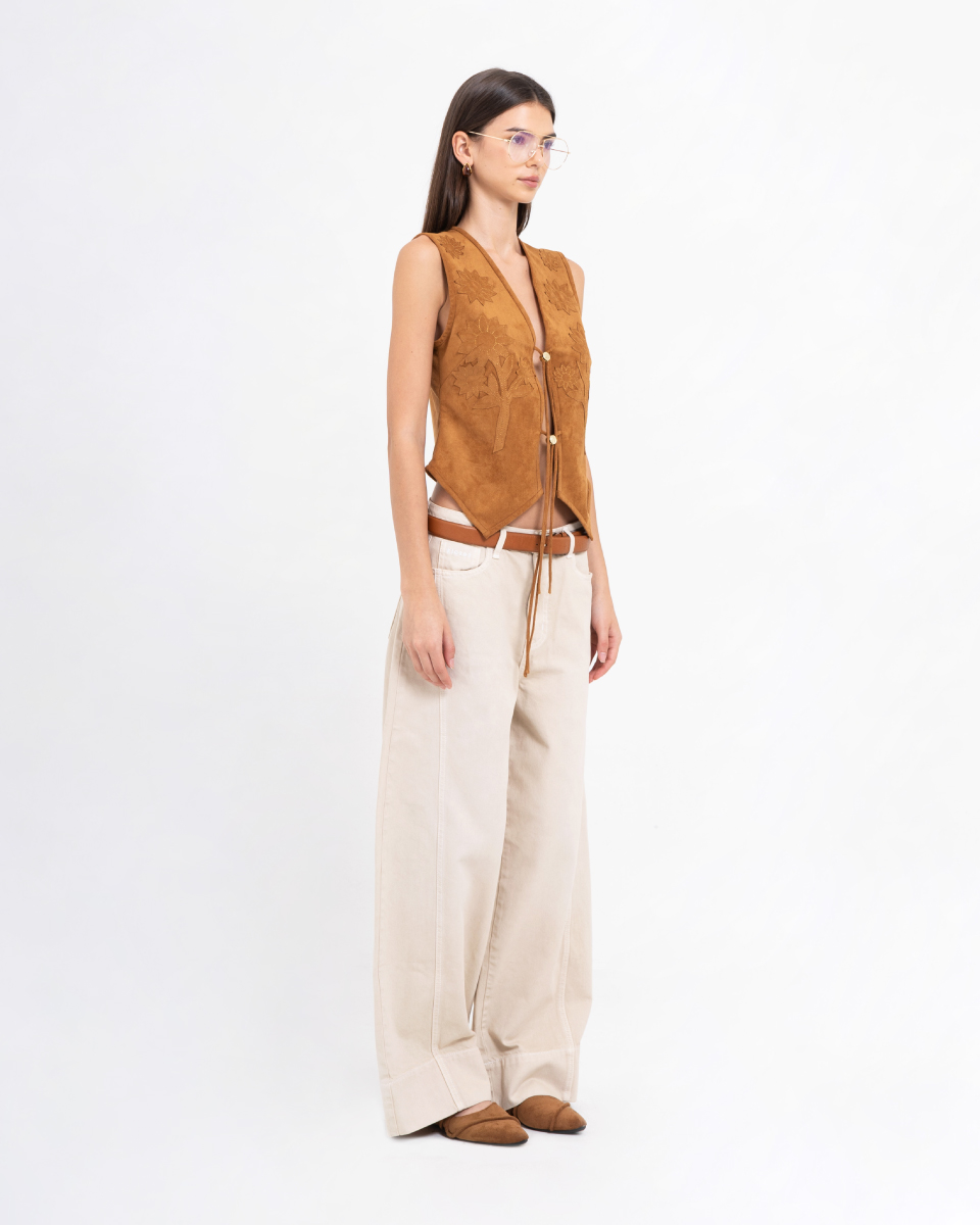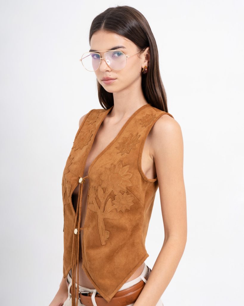 เสื้อกั๊กดีไซน์โบฮีเมียน โทนสีน้ำตาล ออกแบบด้วยงานปักลายดอกไม้ เพิ่มเสน่ห์แบบแฮนด์คราฟต์ ด้านหน้าผูกเชือกให้ลุควินเทจร่วมสมัย ผลิตจากผ้าหนังเทียมเนื้อนุ่ม ทรงพอดีตัว